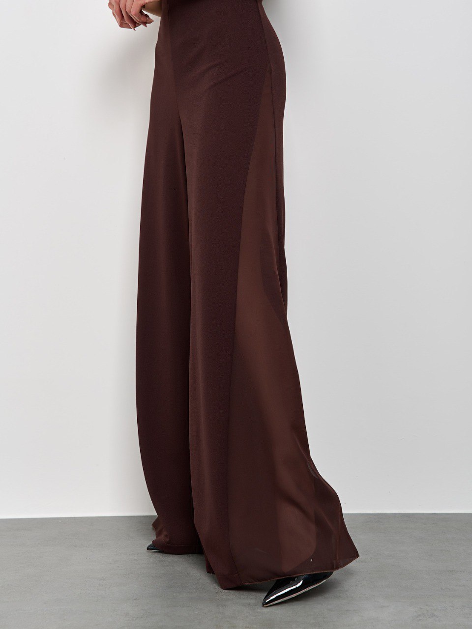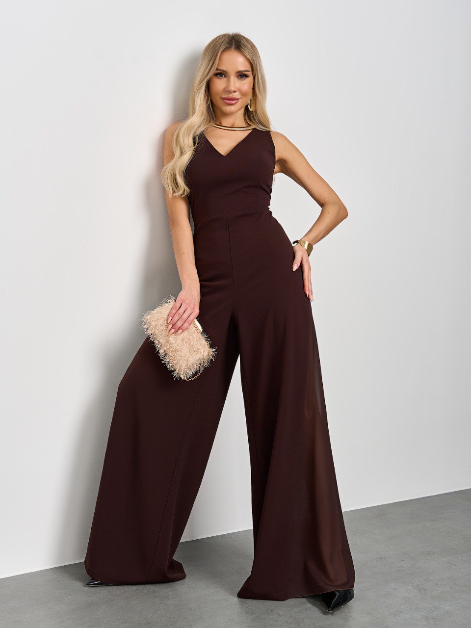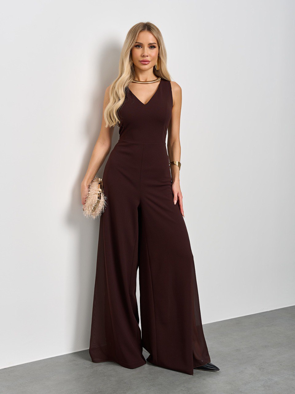 Комбинезон нарядный шоколадного цвета от производителя Jetty, выполнен из креп-трикотажа. Модель прилегающего силуэта, отрезная по линии талии. Брюки широкие со вставками по бокам из шифона. V-образный вырез по переду и по спинке. Потайная застежка молния расположена в среднем шве спинки. Стильный вариант для торжественного мероприятия.