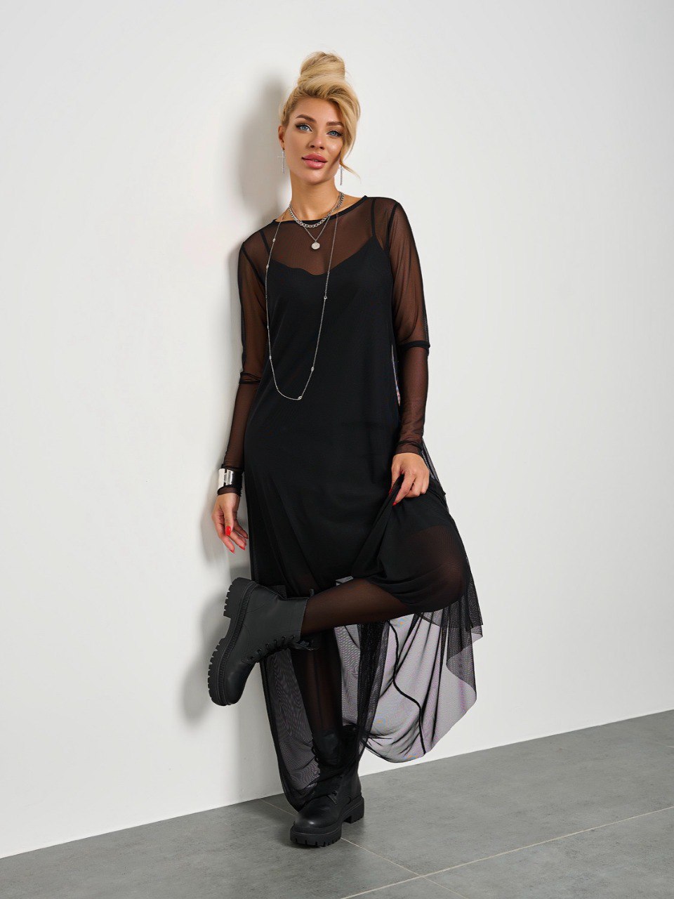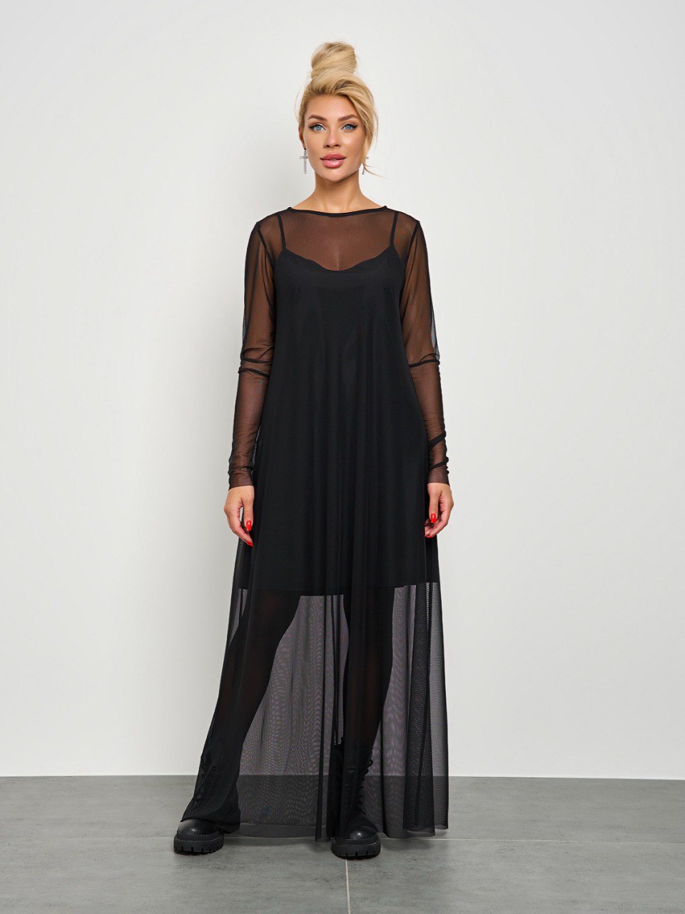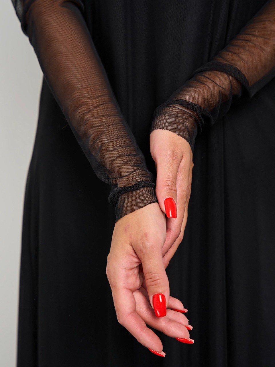 Платье-футляр трикотажное чёрное с рукавами из шифона