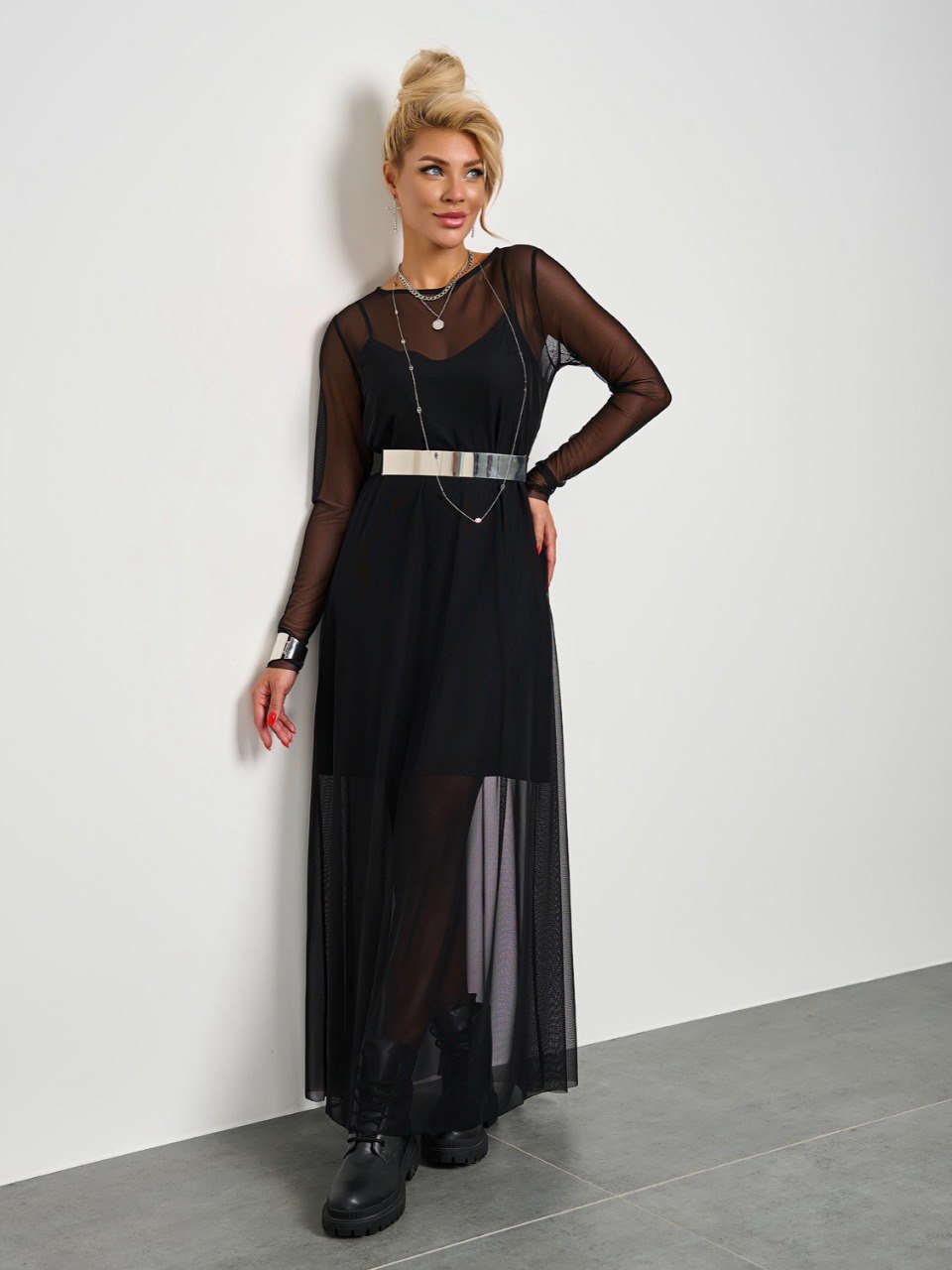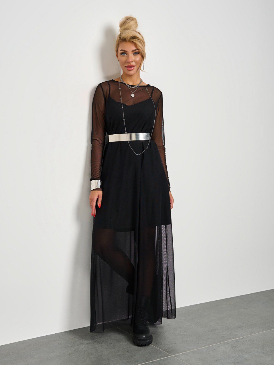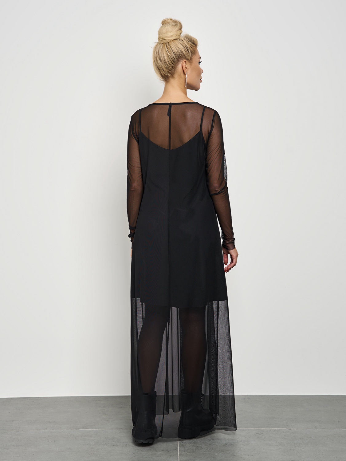 Платье-футляр трикотажное чёрное с рукавами из шифона