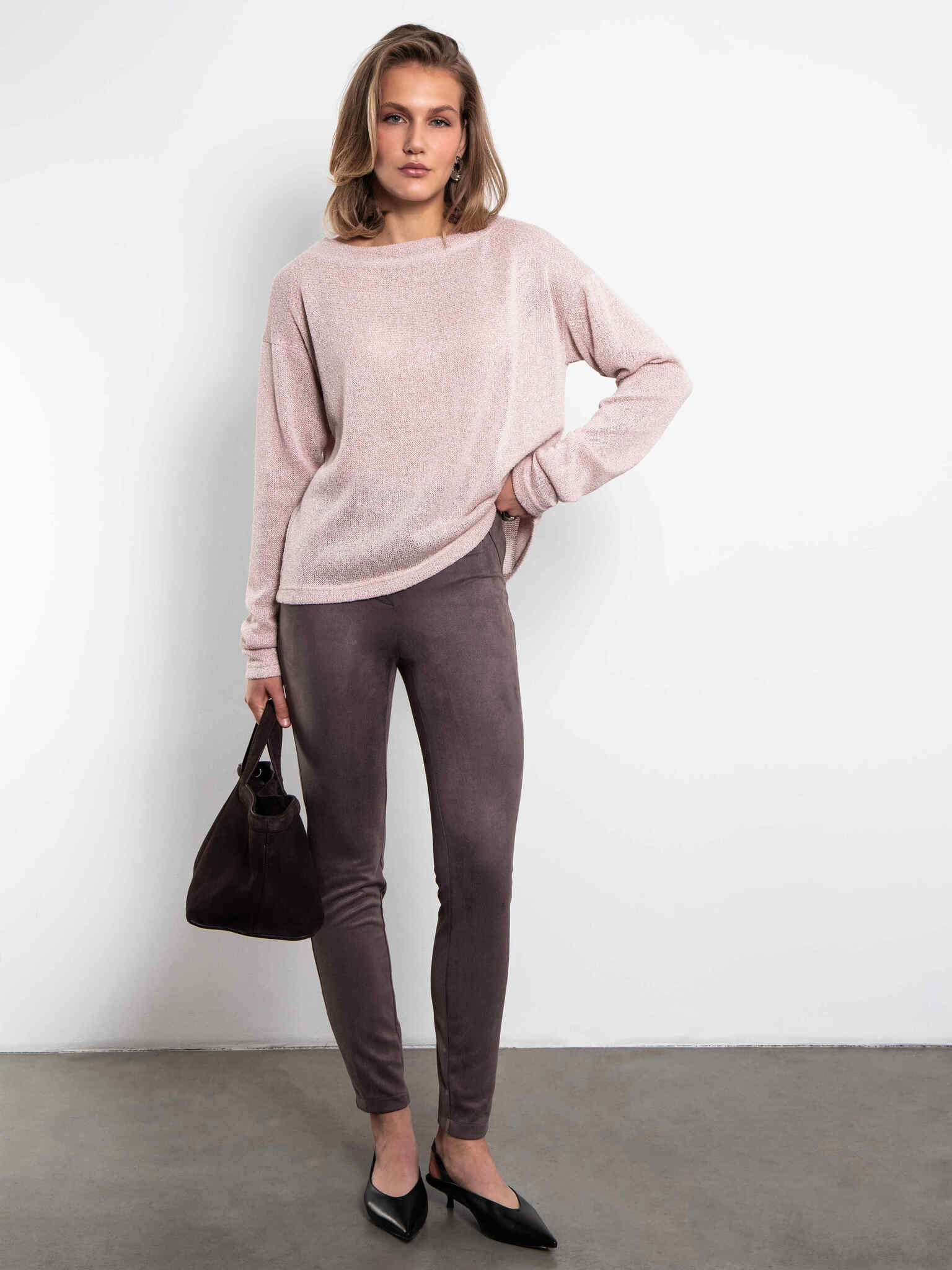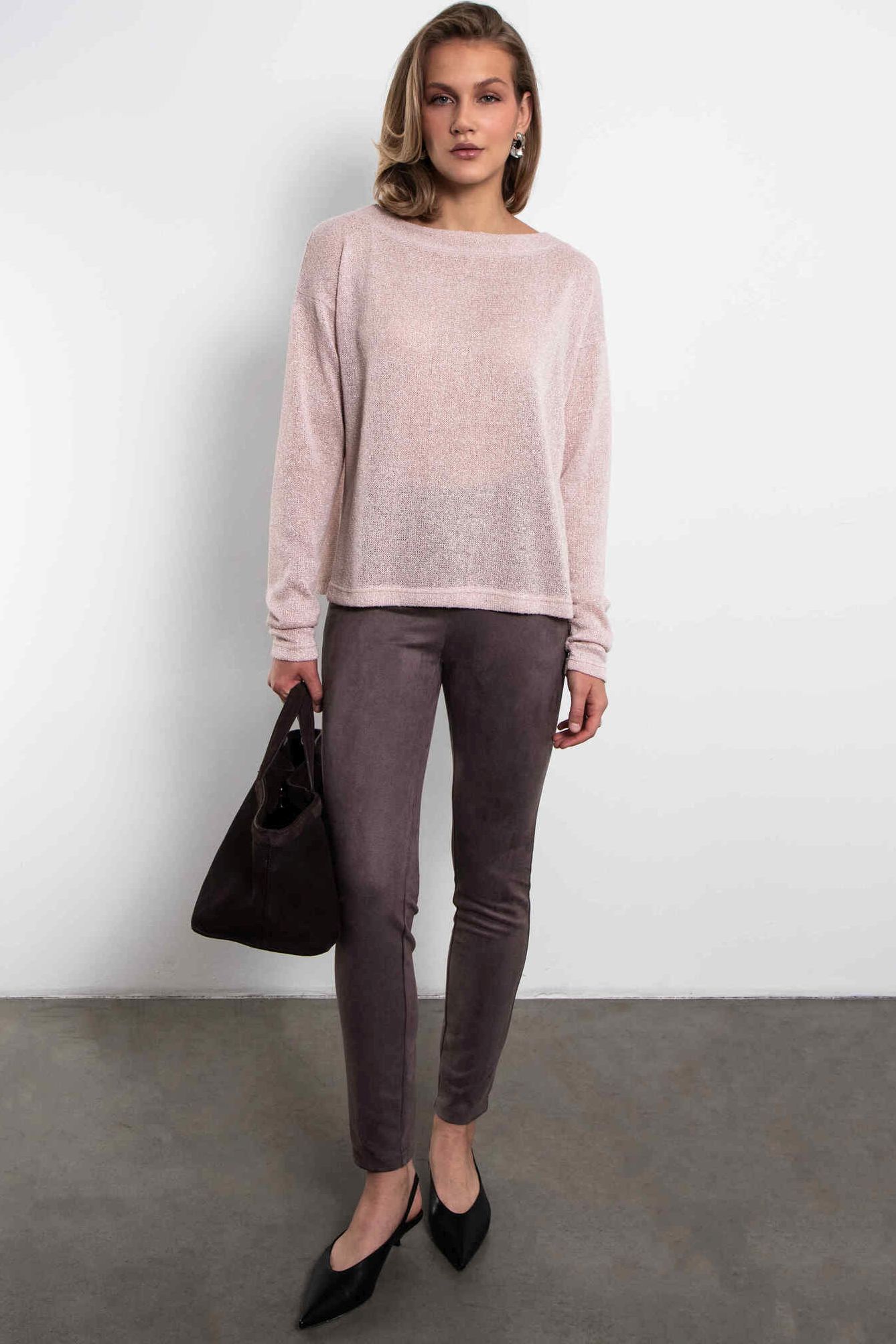 Джемпер розовый из трикотажа с люрексом от бренда Kosmos. Модель прямого силуэта, длинные рукава со сборкой. Мягкий и воздушный джемпер легко становится, как основой многослойного образа, так и изюминкой для актуального облегченного комплекта.