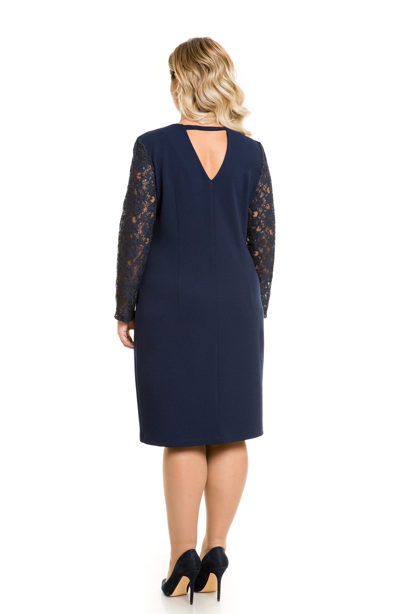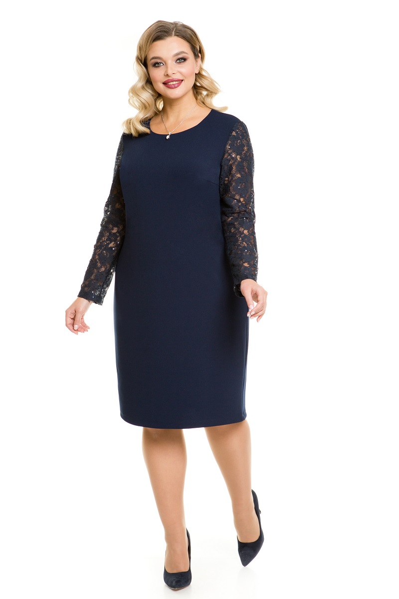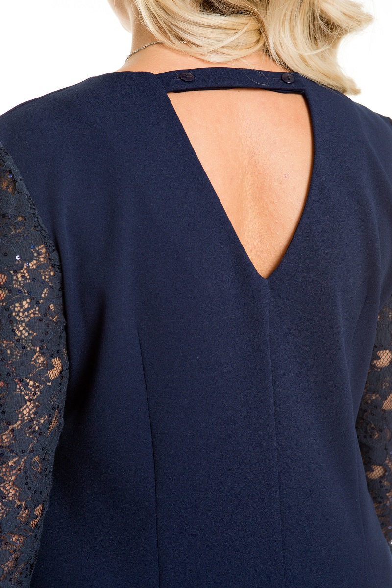 Элегантное женское платье от компании Venusita. Модель полуприлегающего силуэта из однотонного трикотажа крепа и кружевного полотна в тон трикотажа синего цвета. Вырез горловины по переду округлый, обработан обтачкой, в по спинке - глубокий V-образный с декоративной текстильной застежкой на петли и пуговицы. Идеальный выбор для создания образа выходного дня.