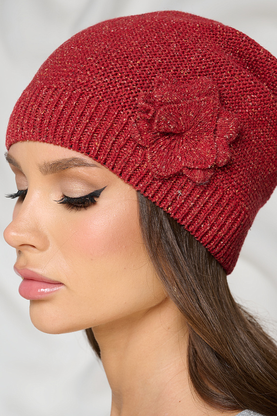 Шапка цвета махагон с декоративным цветком от производителя Bellovera. Тонкая демисезонная шапка добавит атмосферного настроения и согреет в прохладную погоду.