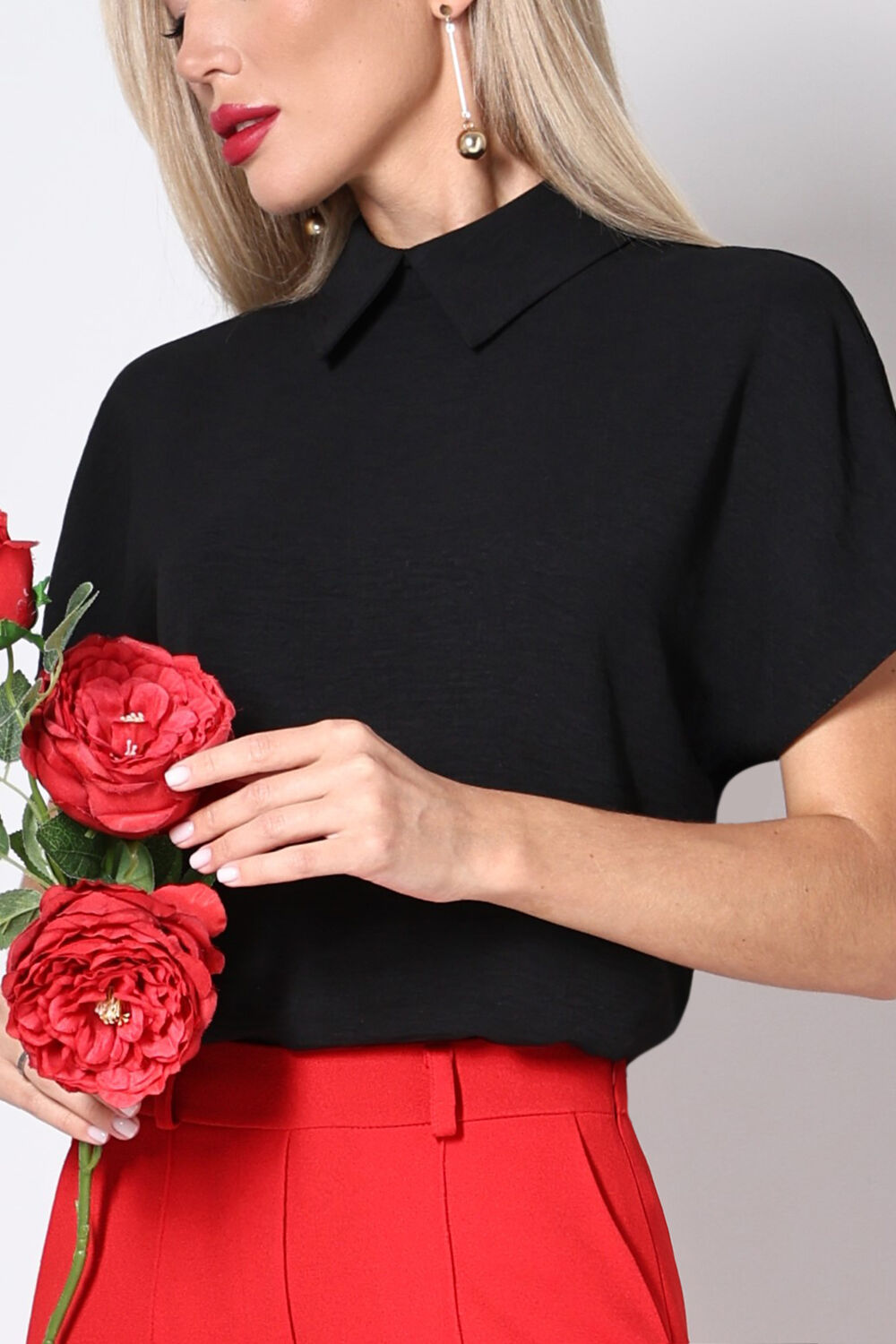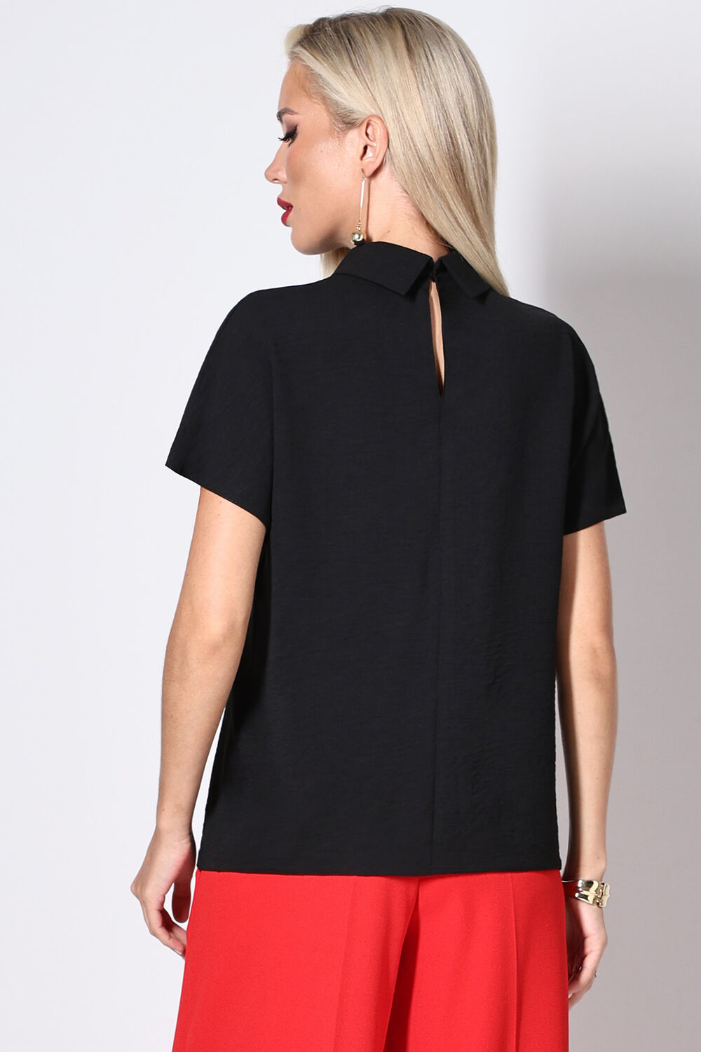 Блузка чёрная с короткими рукавами от бренда SelenaSonata. Модель полуприлегающего силуэта, выполнена из блузочной ткани. Отложной воротник-стойка. По спинке застёжка на петлю и пуговицу. Низ ровный. Идеальный выбор для Вашего стильного гардероба. Рекомендуется бережная стирка при 30 градусах.