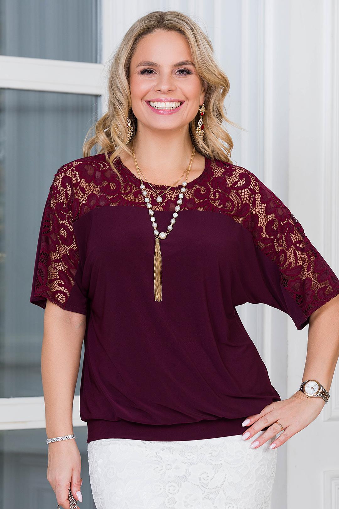 Блузка с короткими рукавами в винном цвете от компании Lavira. Модель полуприлегающего силуэта, выполнена из приятной ткани с отделкой из кружева. Круглый вырез горловины. По низу притачной пояс. Прекрасный выбор для создания стильного образа.