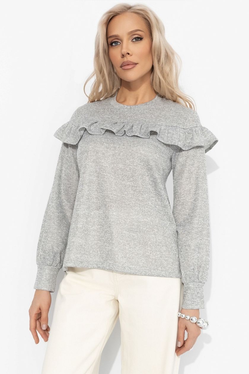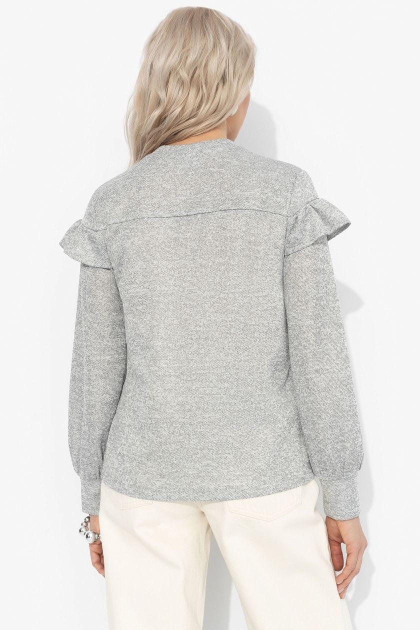 Блузка серая из трикотажа от компании Charutti. Рюша по линии груди добавляет романтики и свежести образу. Прямой силуэт, манжеты на резинке – идеальное сочетание простоты и шарма. Прекрасное решение для создания стильного образа.