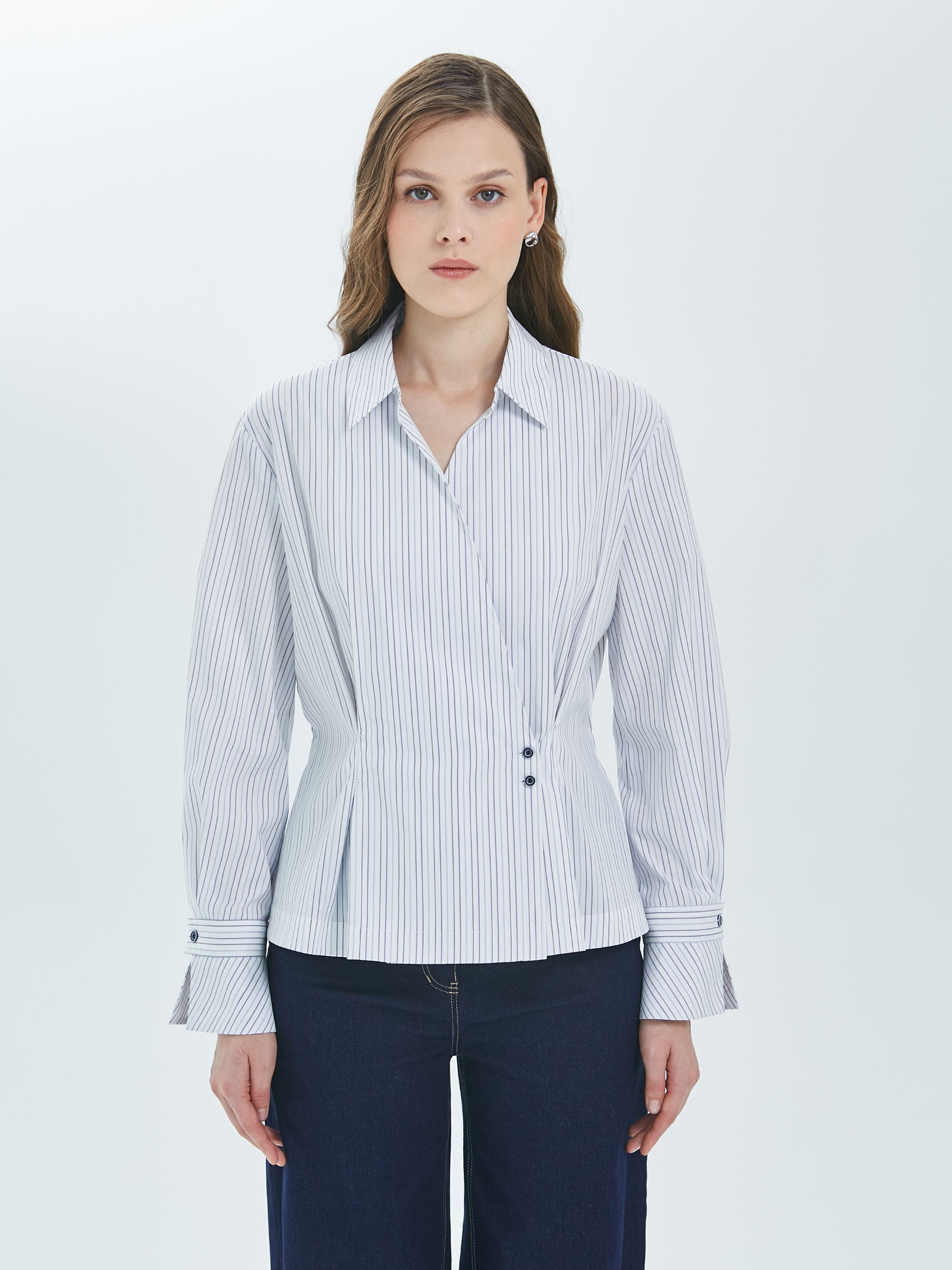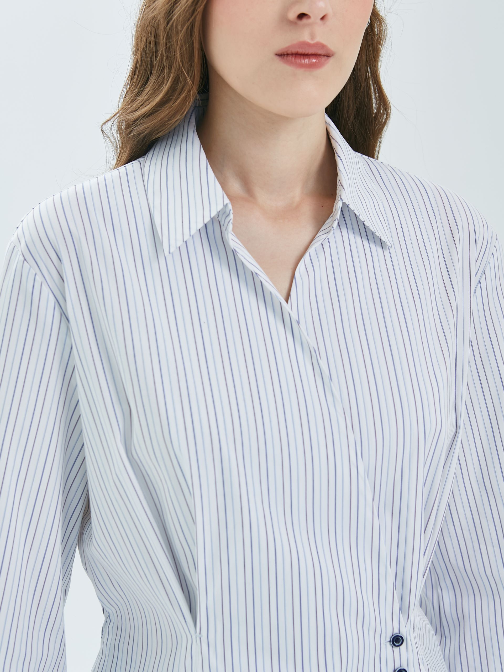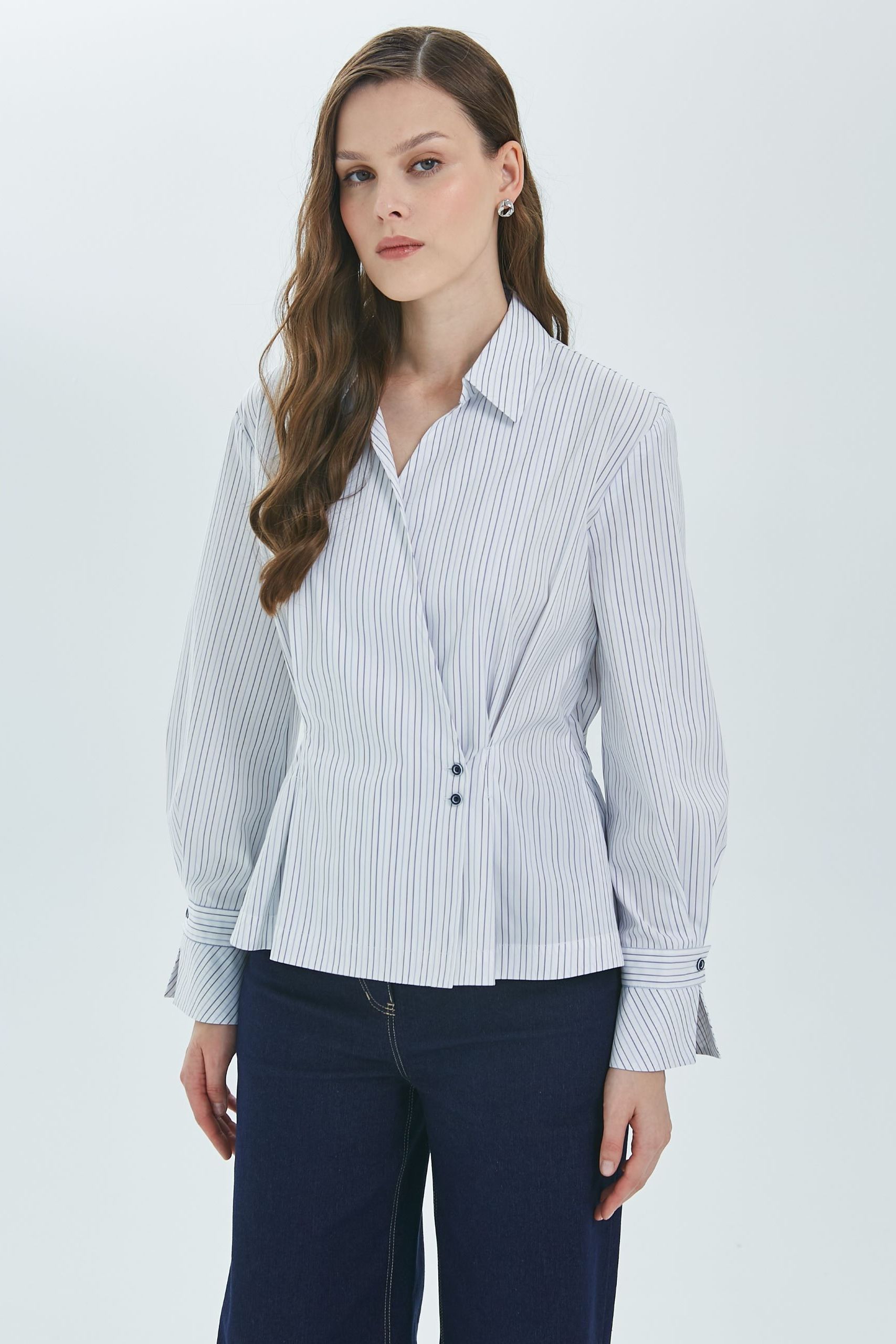 Блузка в тонкую полоску с запахом от фабрики Priz, выполнена из текстильного полотна молочного оттенка. Модель со спущенным плечом. Застёжка двубортная на петли и пуговицы. Воротник сорочечный. Спереди по талии застрочены защипы. Сзади по талии сборка на резину. По низу рукава разрез, защипы и манжета с застёжкой на пуговицу. Идеальный выбор для офисных модниц.