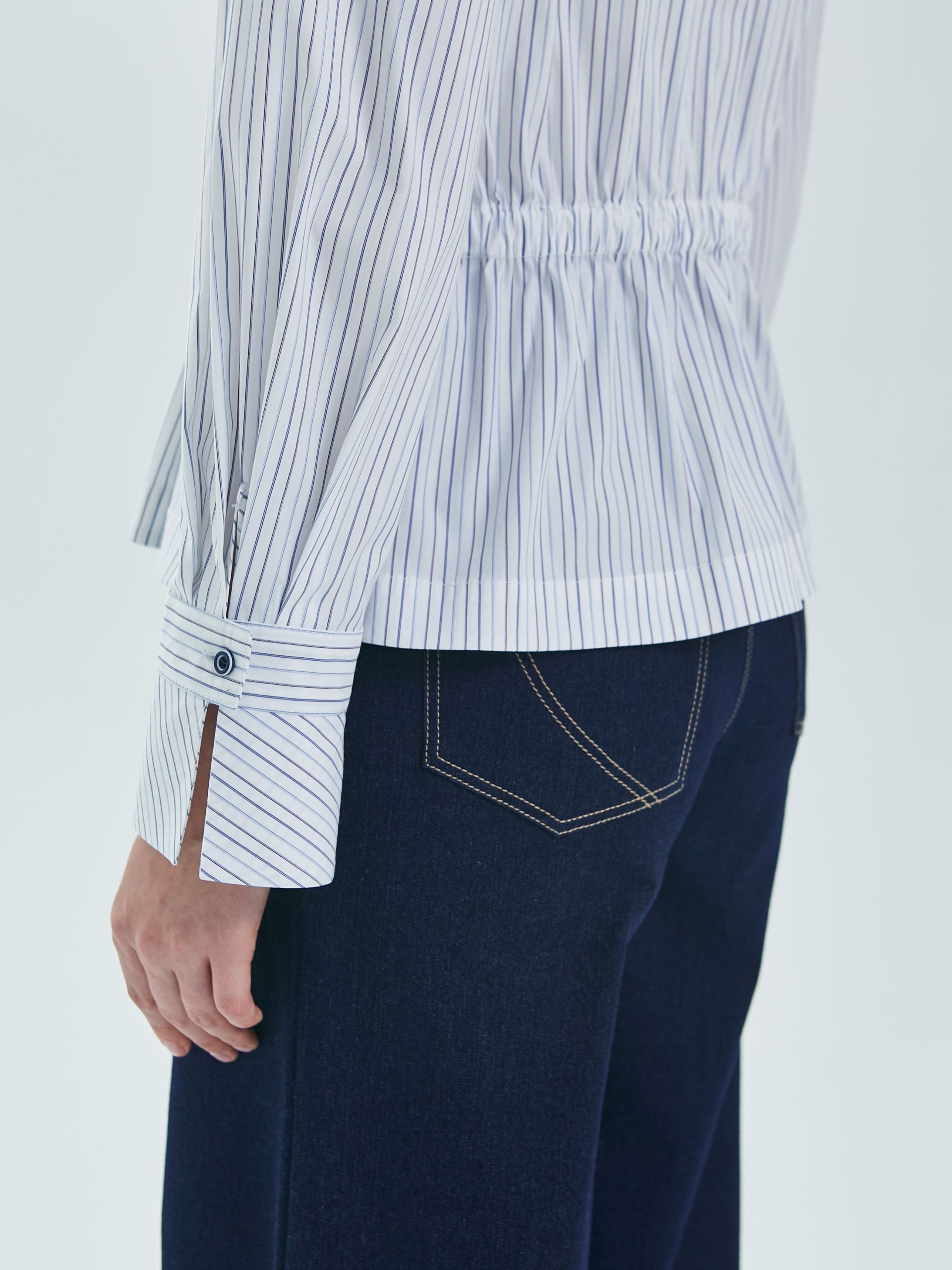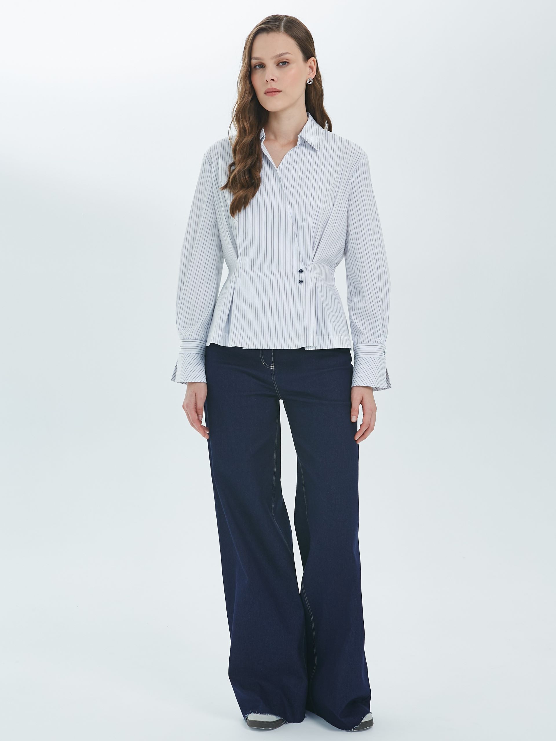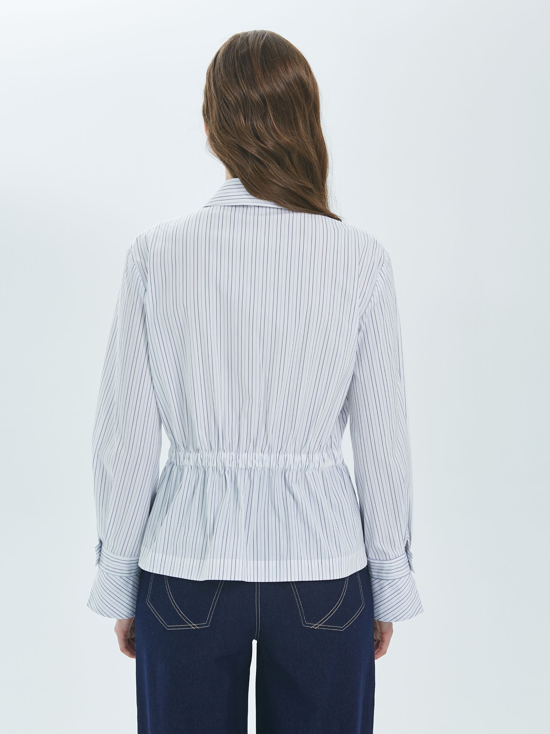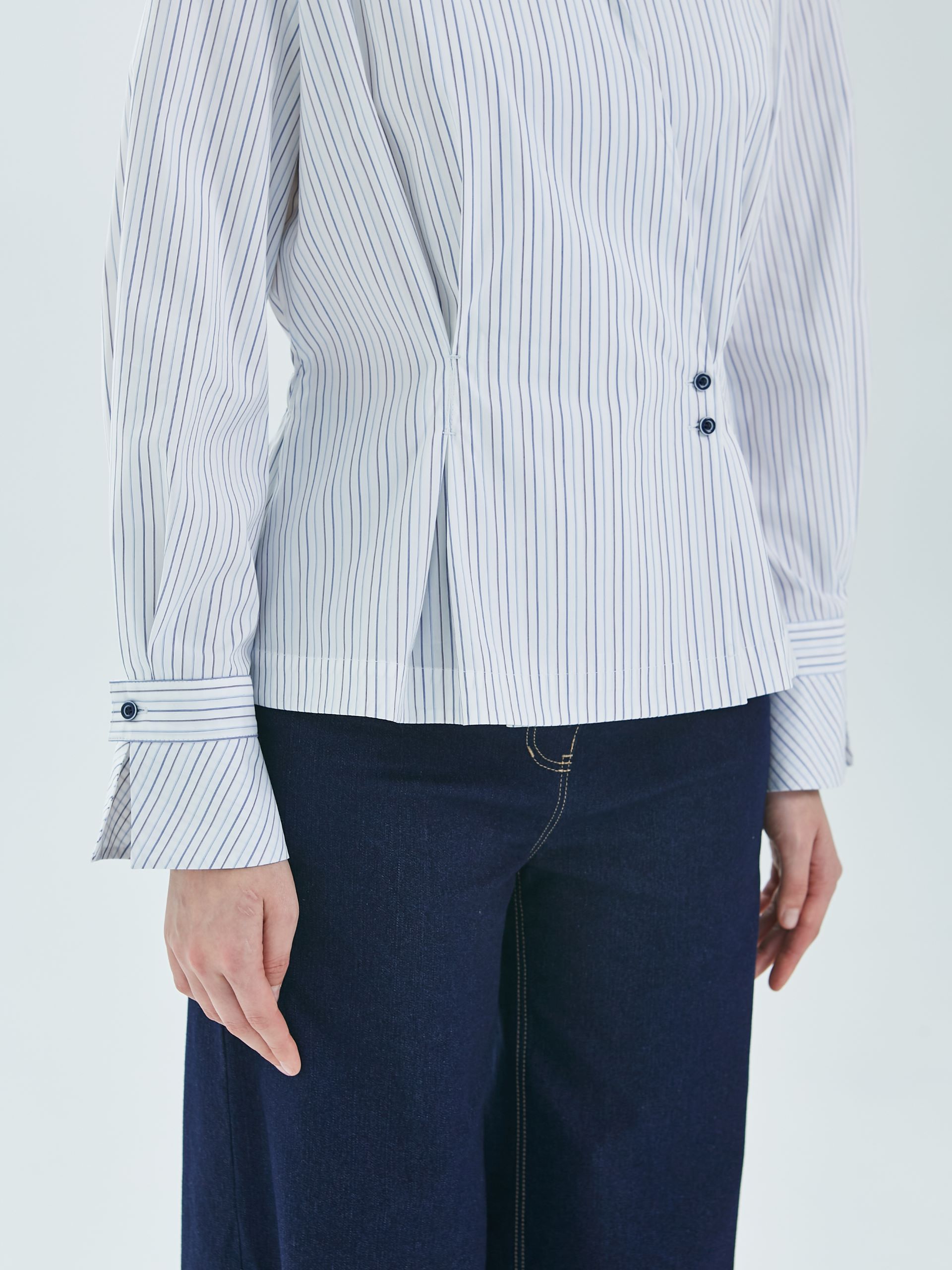 Блузка в тонкую полоску с запахом от фабрики Priz, выполнена из текстильного полотна молочного оттенка. Модель со спущенным плечом. Застёжка двубортная на петли и пуговицы. Воротник сорочечный. Спереди по талии застрочены защипы. Сзади по талии сборка на резину. По низу рукава разрез, защипы и манжета с застёжкой на пуговицу. Идеальный выбор для офисных модниц.