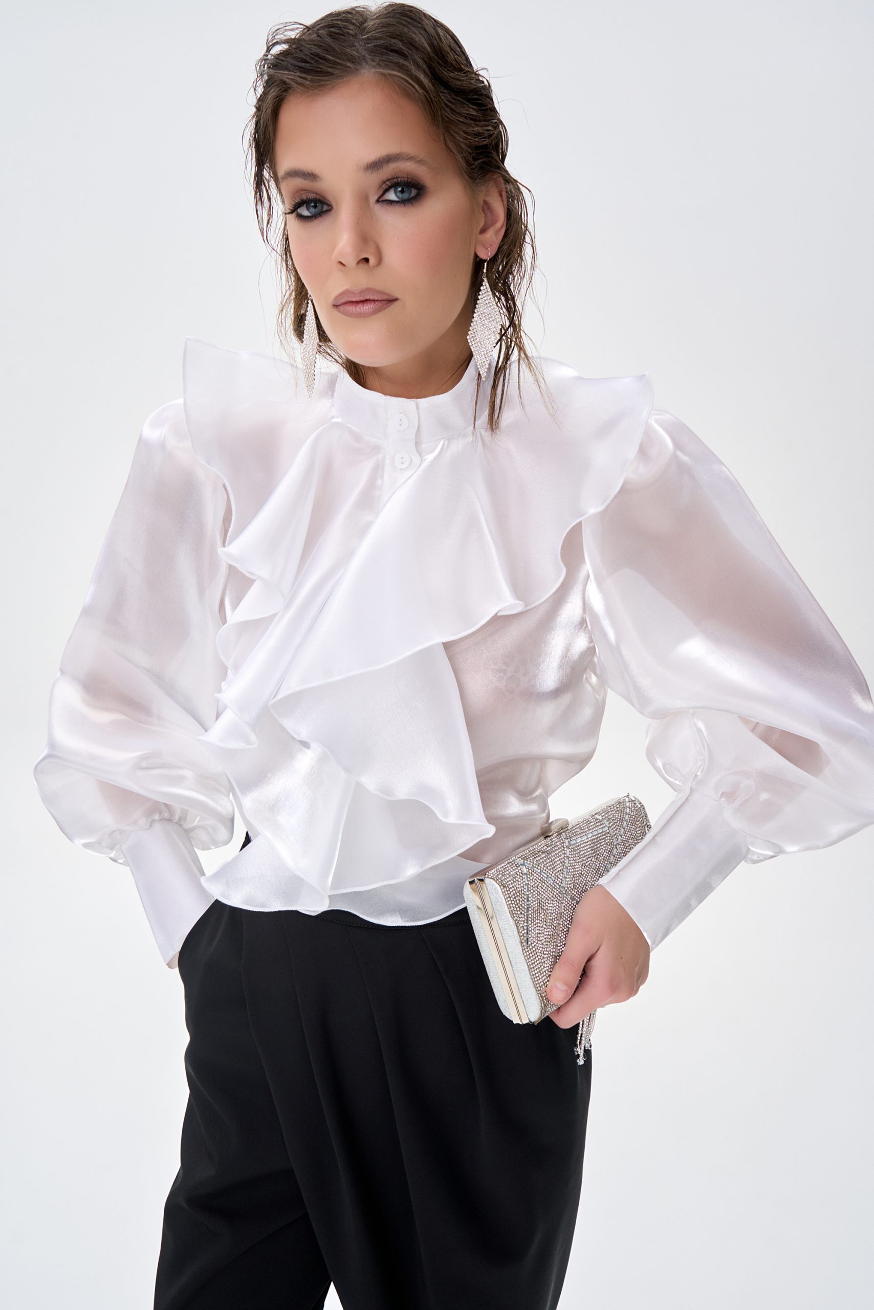Рубашка белая из премиальной органзы от бренда Elza с благородным сатиновым блеском. Модель выделяется выразительными объёмными оборками, которые создают многослойный декоративный эффект в зоне груди и придают образу утончённую архитектурность. Рукава — длинные, на воздушном объёме, собранные на манжете. Манжеты выполнены из плотной ткани в тон, застёгиваются на аккуратные пуговицы, что подчёркивает элегантность модели. Горловина — стойка с мягкой посадкой, обеспечивает аккуратное оформление линии шеи и визуально вытягивает силуэт. Стильный вариант для создания женственного образа.