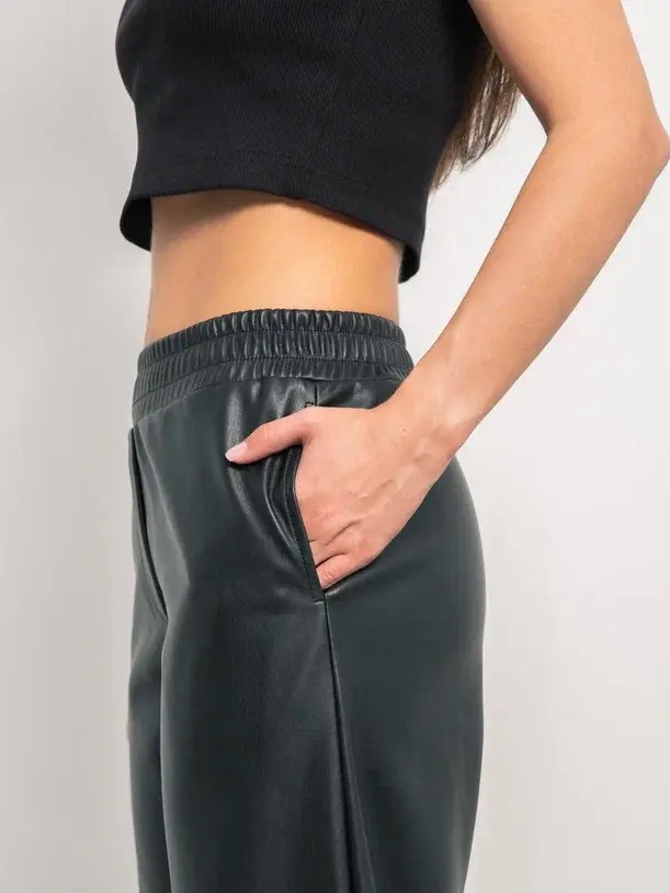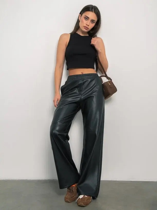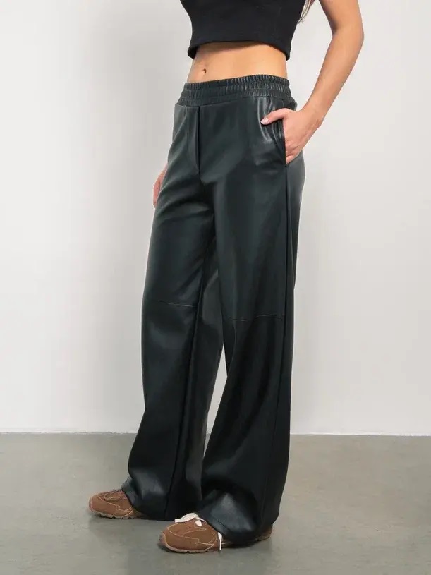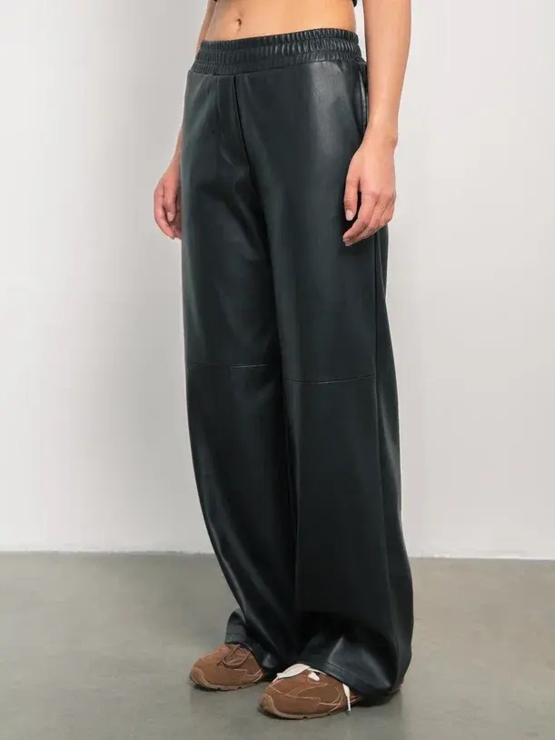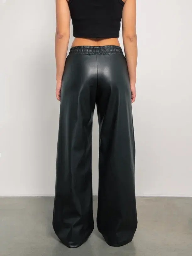 Брюки чёрные из экокожи на замше от бренда Kosmos. Брюки имеют свободный крой, что обеспечивает идеальную посадку и комфорт при ношении. Они оснащены удобной резинкой на поясе, которая обеспечивает идеальную посадку и не стесняет движения. Брюки также имеют удобные карманы. Этот стильный и практичный предмет гардероба подойдет как для повседневного образа, так и для особых случаев.