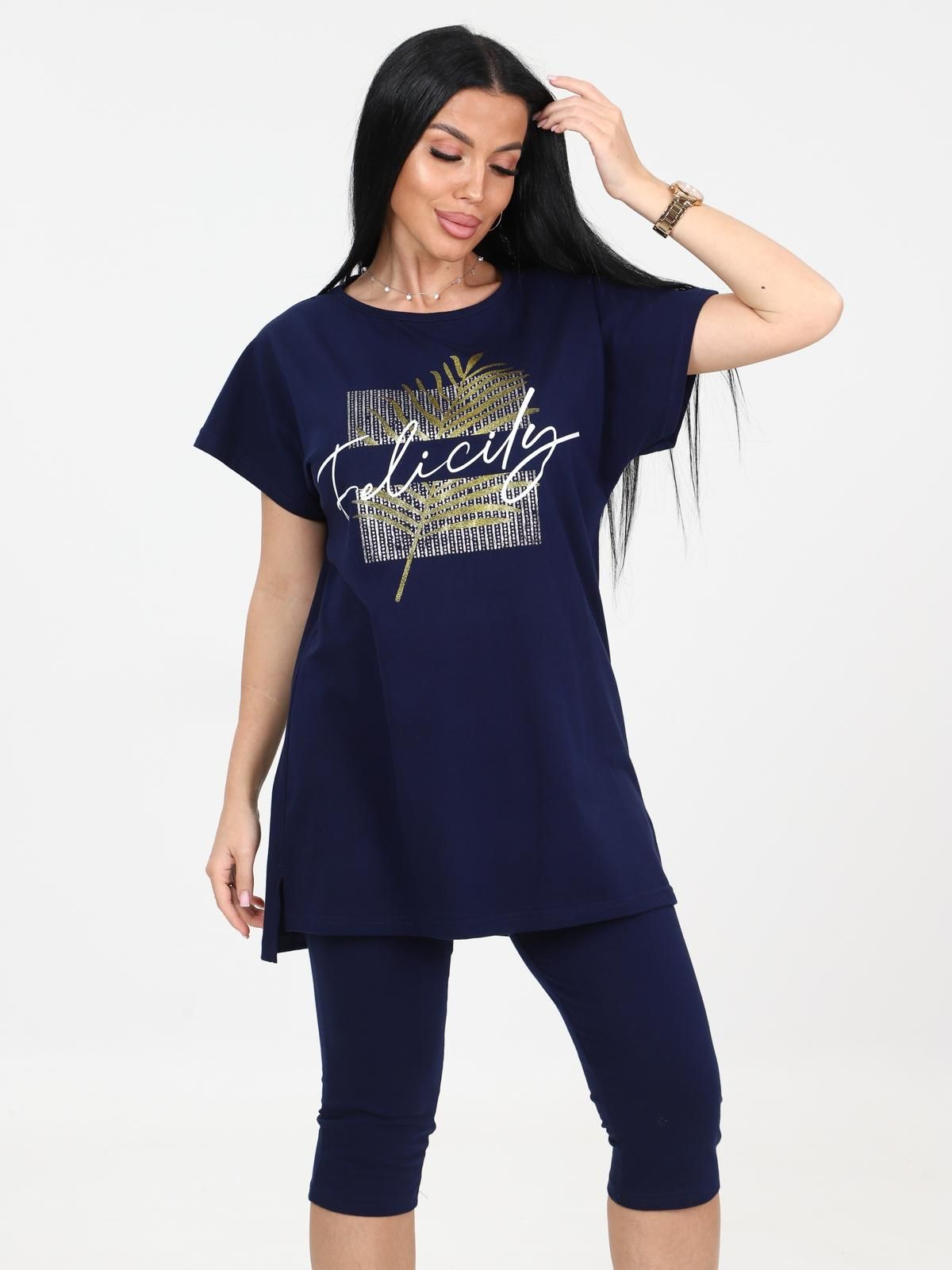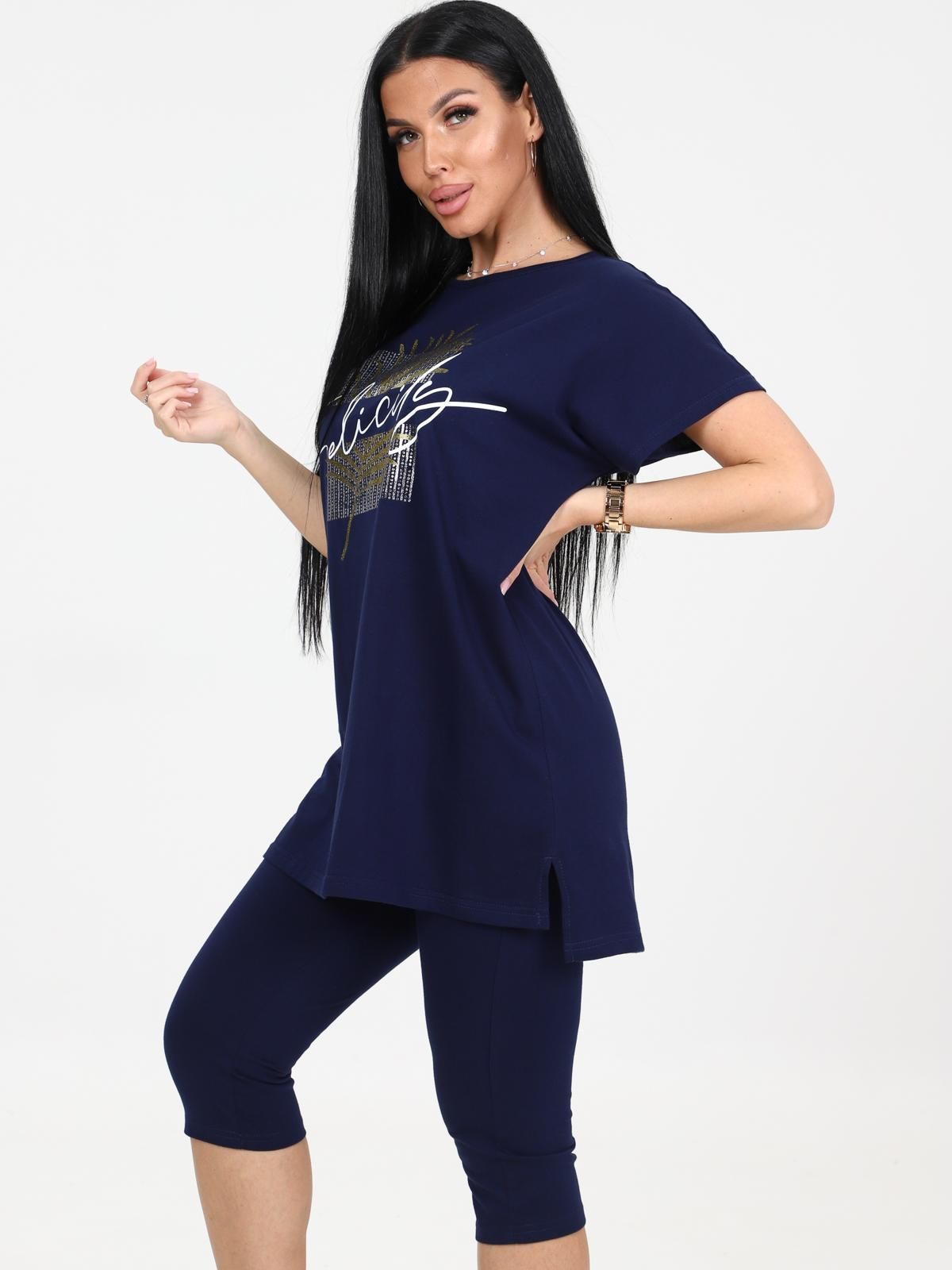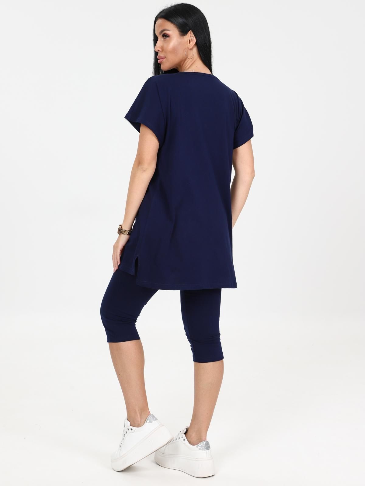 Костюм трикотажный с бриджами в чернильном цвете от бренда Iv-capriz. Футболка с круглым вырезом горловины, короткие рукава. Бриджи с поясом на резинке. Идеальный вариант для домашних дел.
