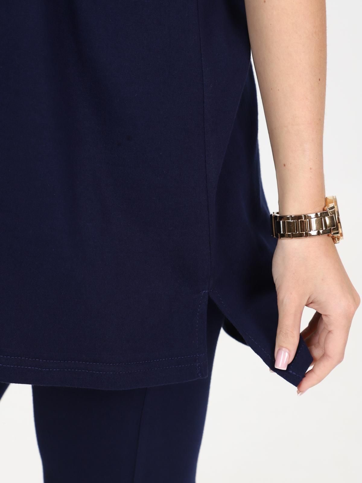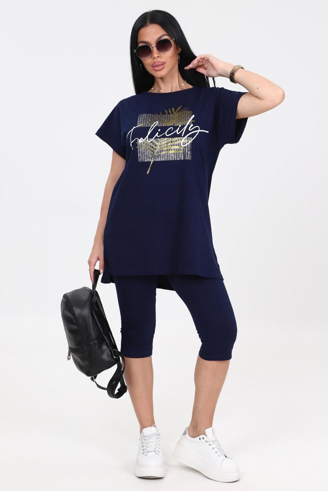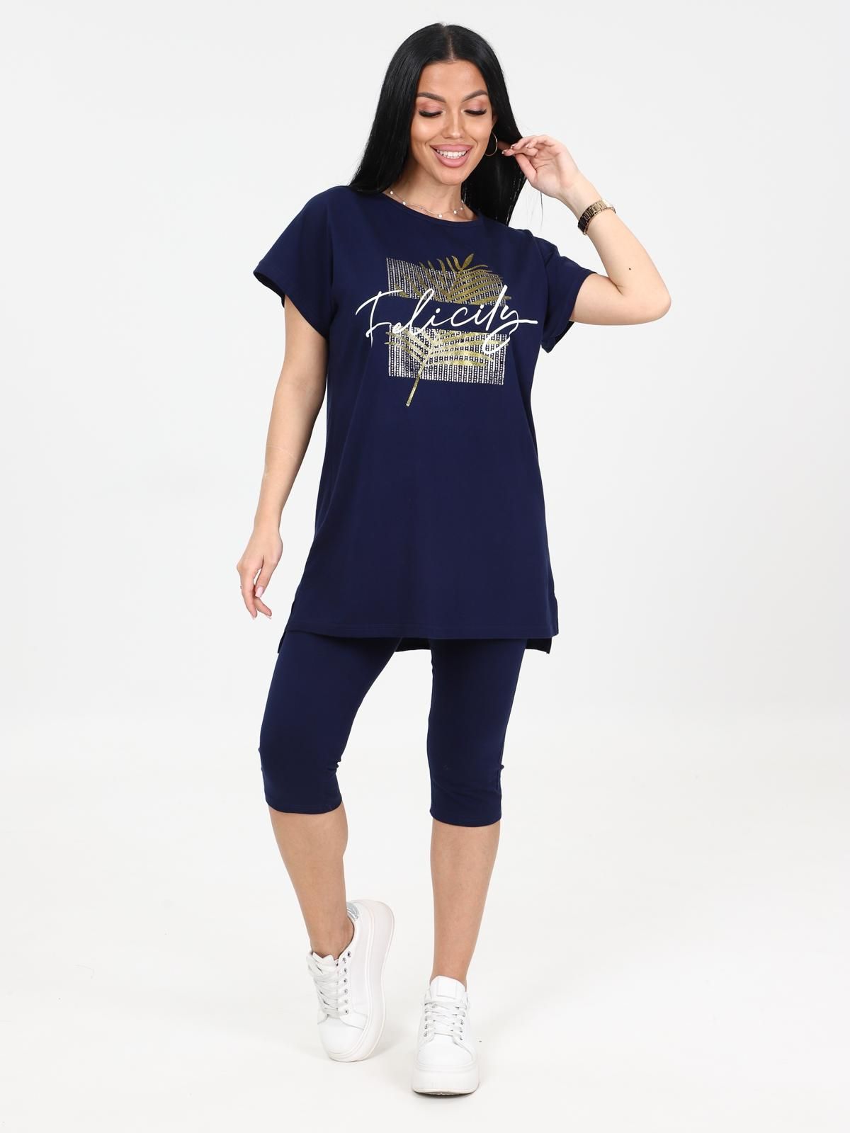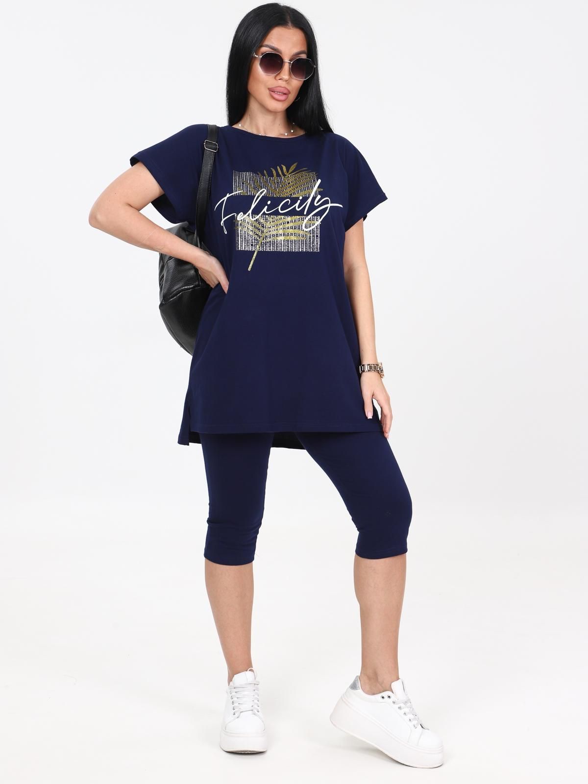 Костюм трикотажный с бриджами в чернильном цвете от бренда Iv-capriz. Футболка с круглым вырезом горловины, короткие рукава. Бриджи с поясом на резинке. Идеальный вариант для домашних дел.