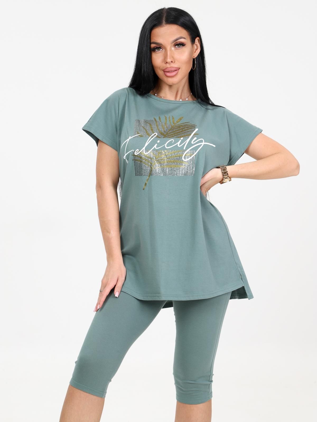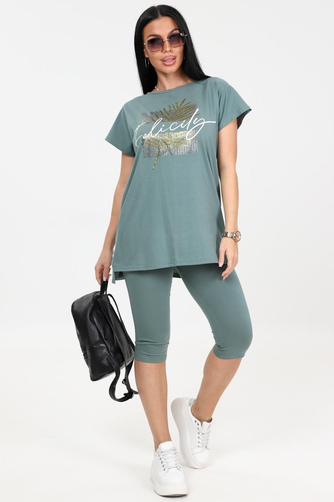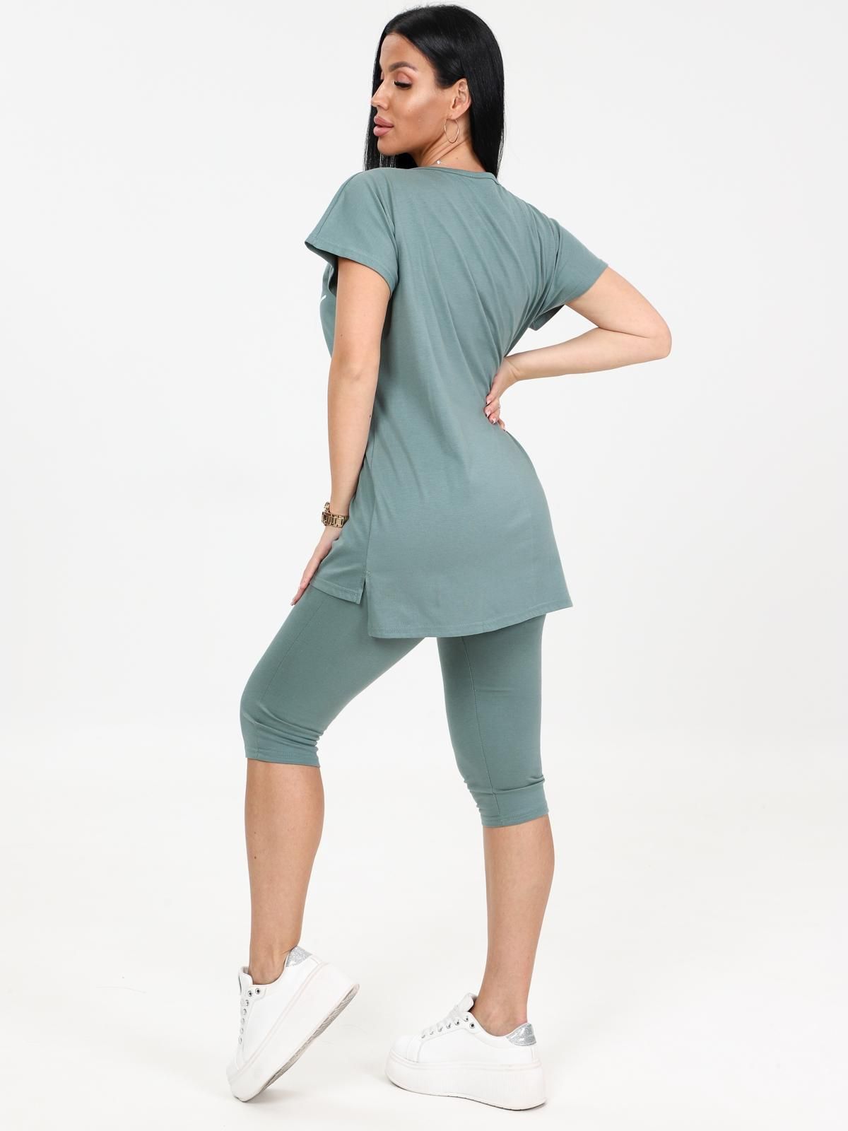 Костюм трикотажный с бриджами в цвете хаки от бренда Iv-capriz. Футболка с круглым вырезом горловины, короткие рукава. Бриджи с поясом на резинке. Идеальный вариант для домашних дел.