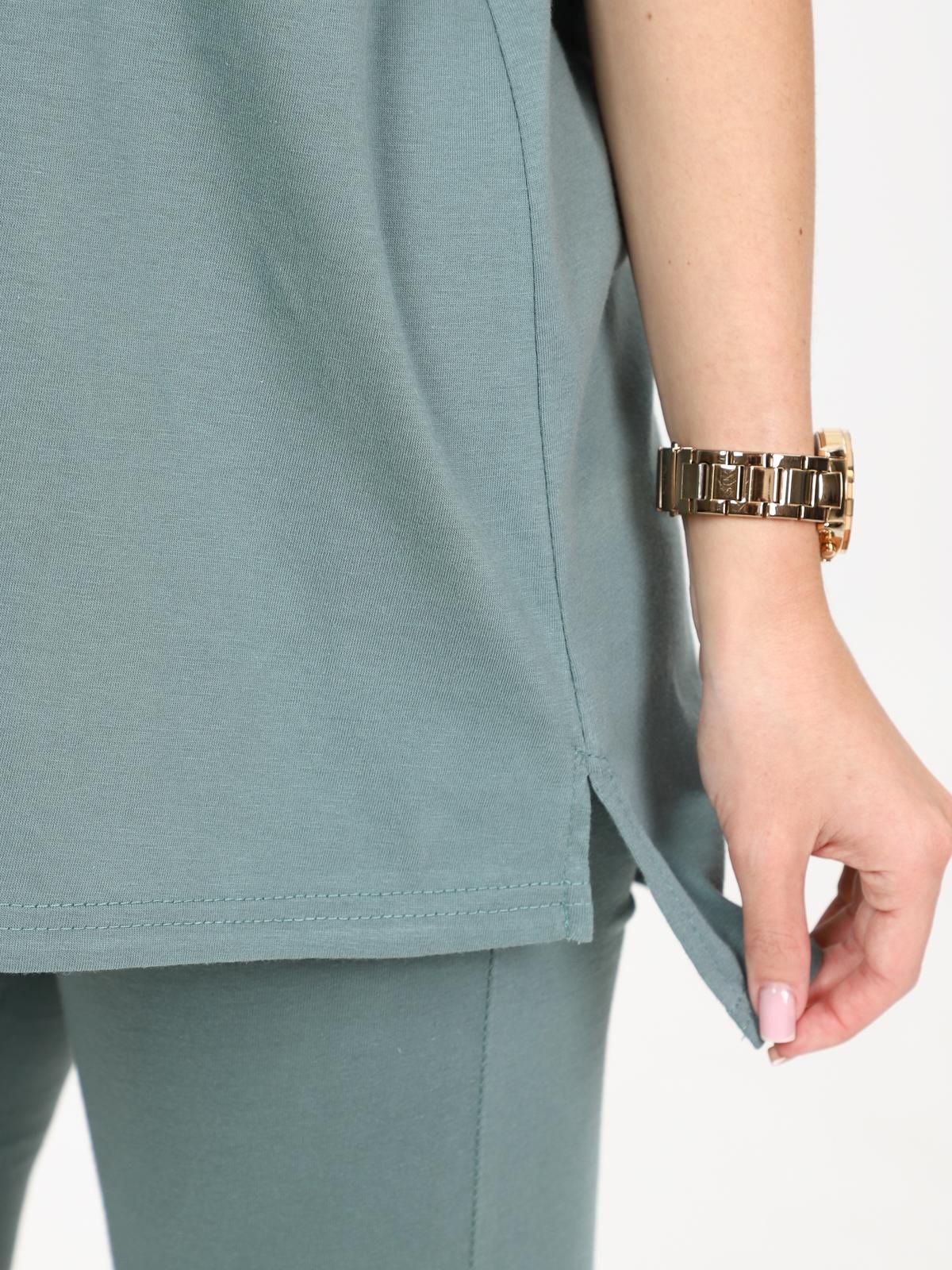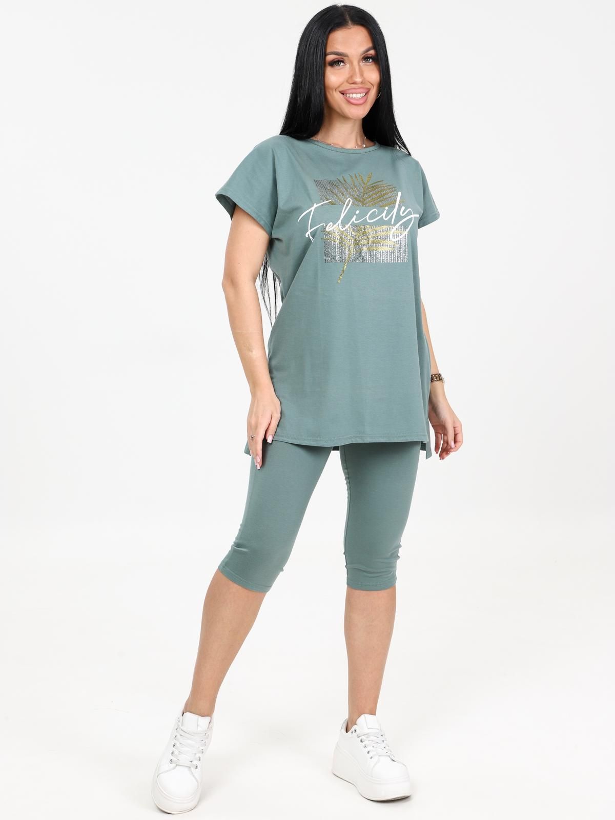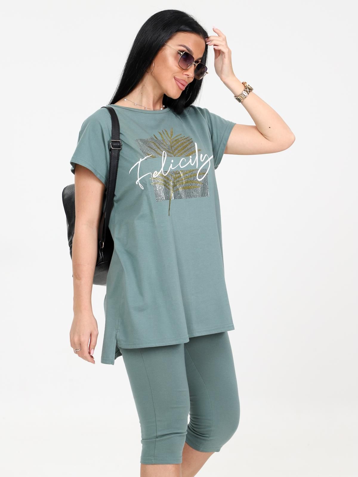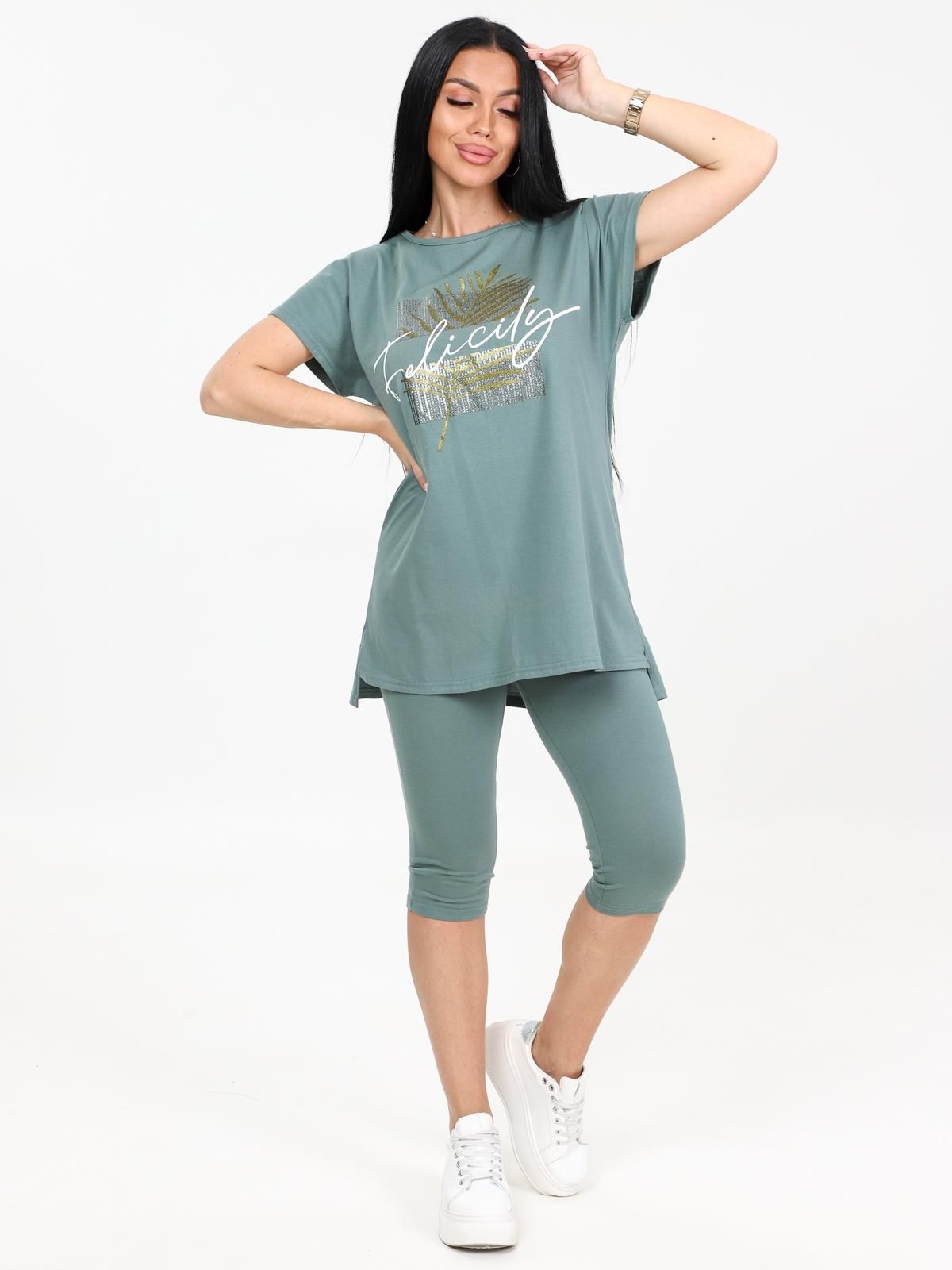 Костюм трикотажный с бриджами в цвете хаки от бренда Iv-capriz. Футболка с круглым вырезом горловины, короткие рукава. Бриджи с поясом на резинке. Идеальный вариант для домашних дел.