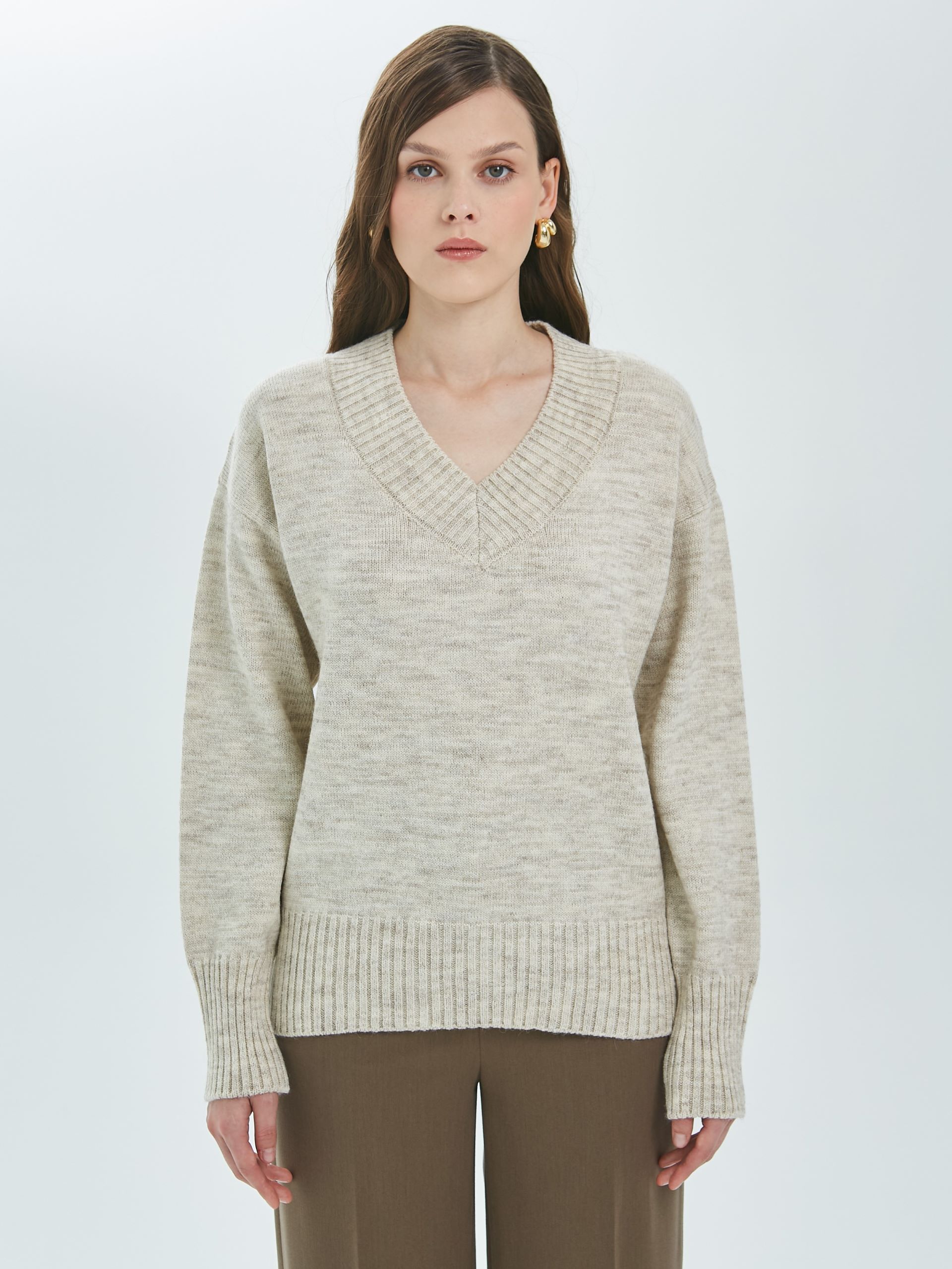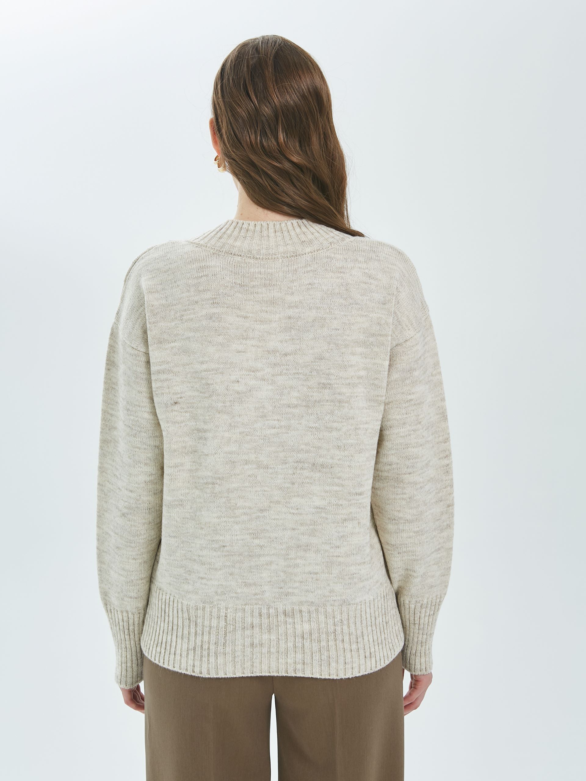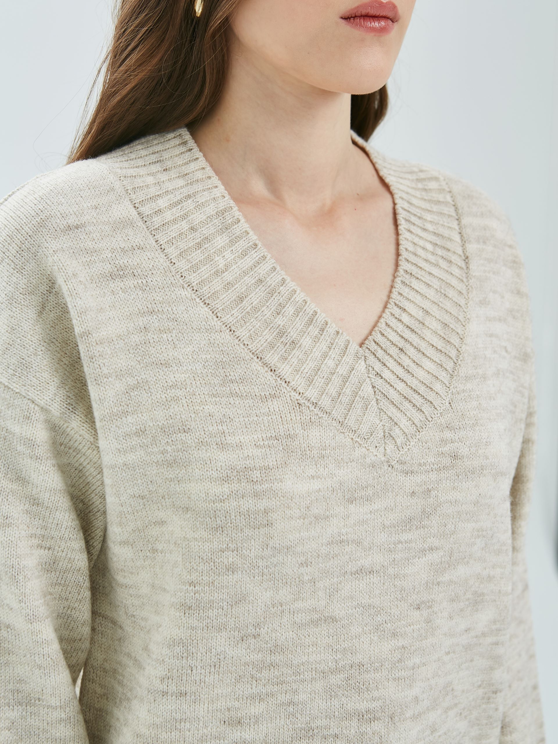 Джемпер вязаный с длинными рукавами от фабрики Priz. Модель прямого силуэта, в цвете слоновая кость. V-образный вырез горловины. Комфорт и стиль на каждый день.