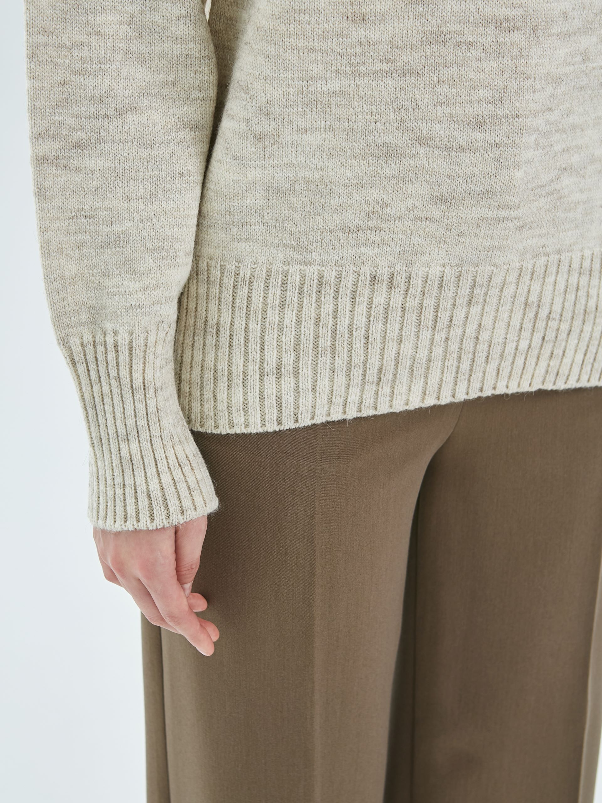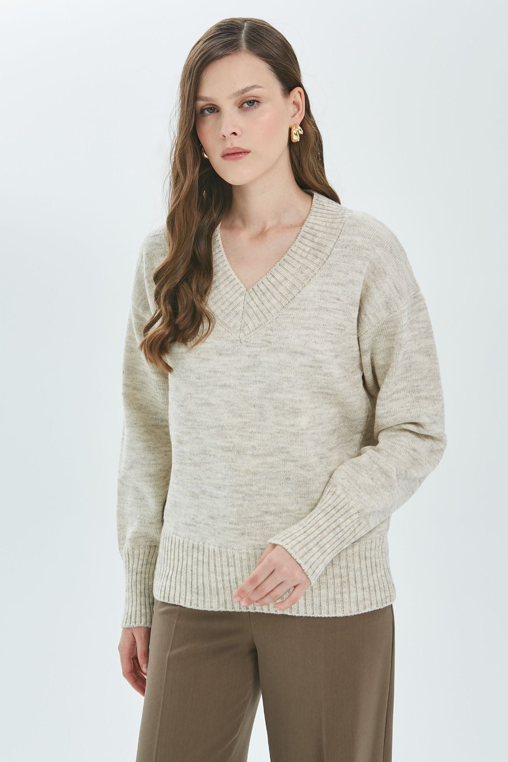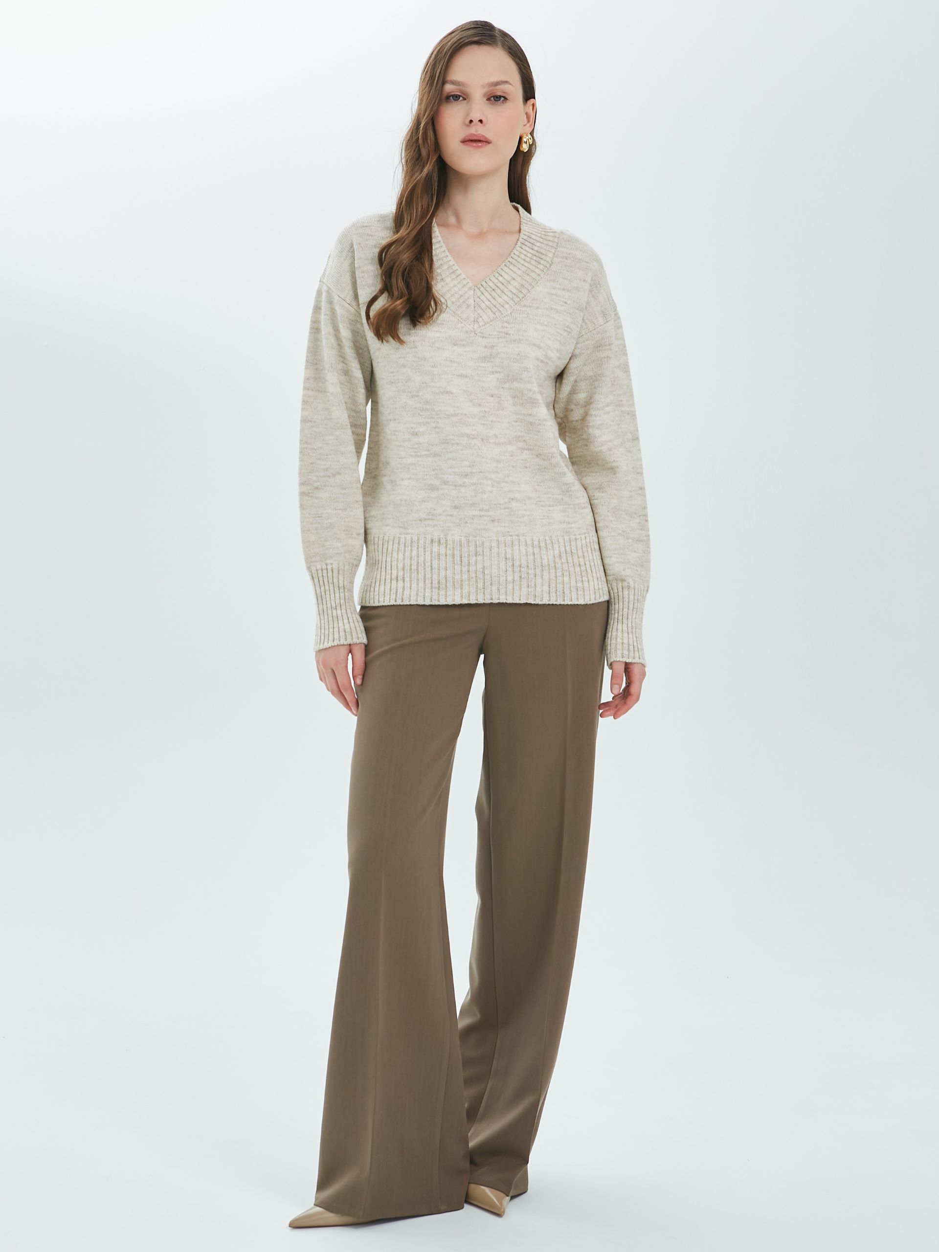 Джемпер вязаный с длинными рукавами от фабрики Priz. Модель прямого силуэта, в цвете слоновая кость. V-образный вырез горловины. Комфорт и стиль на каждый день.