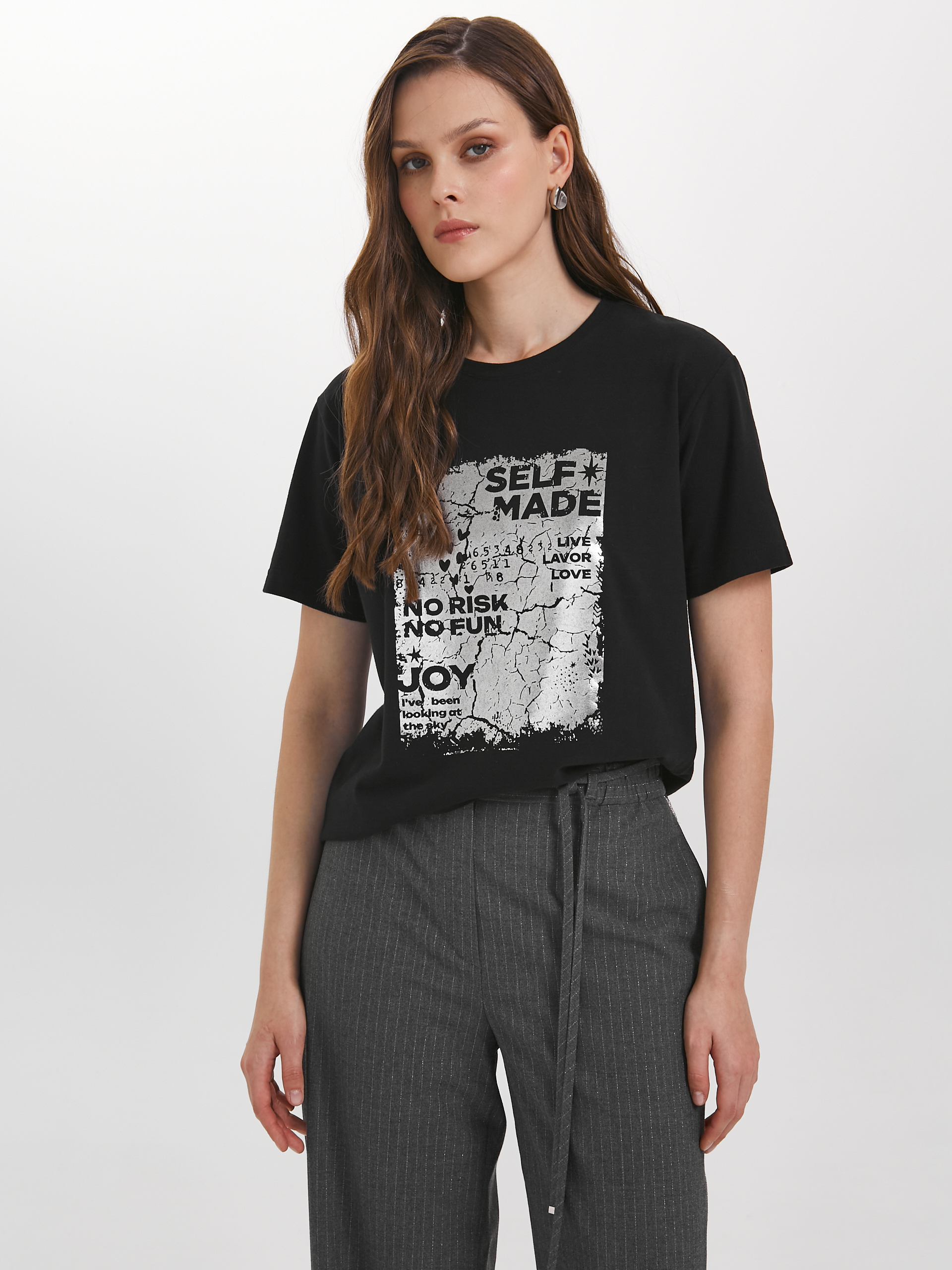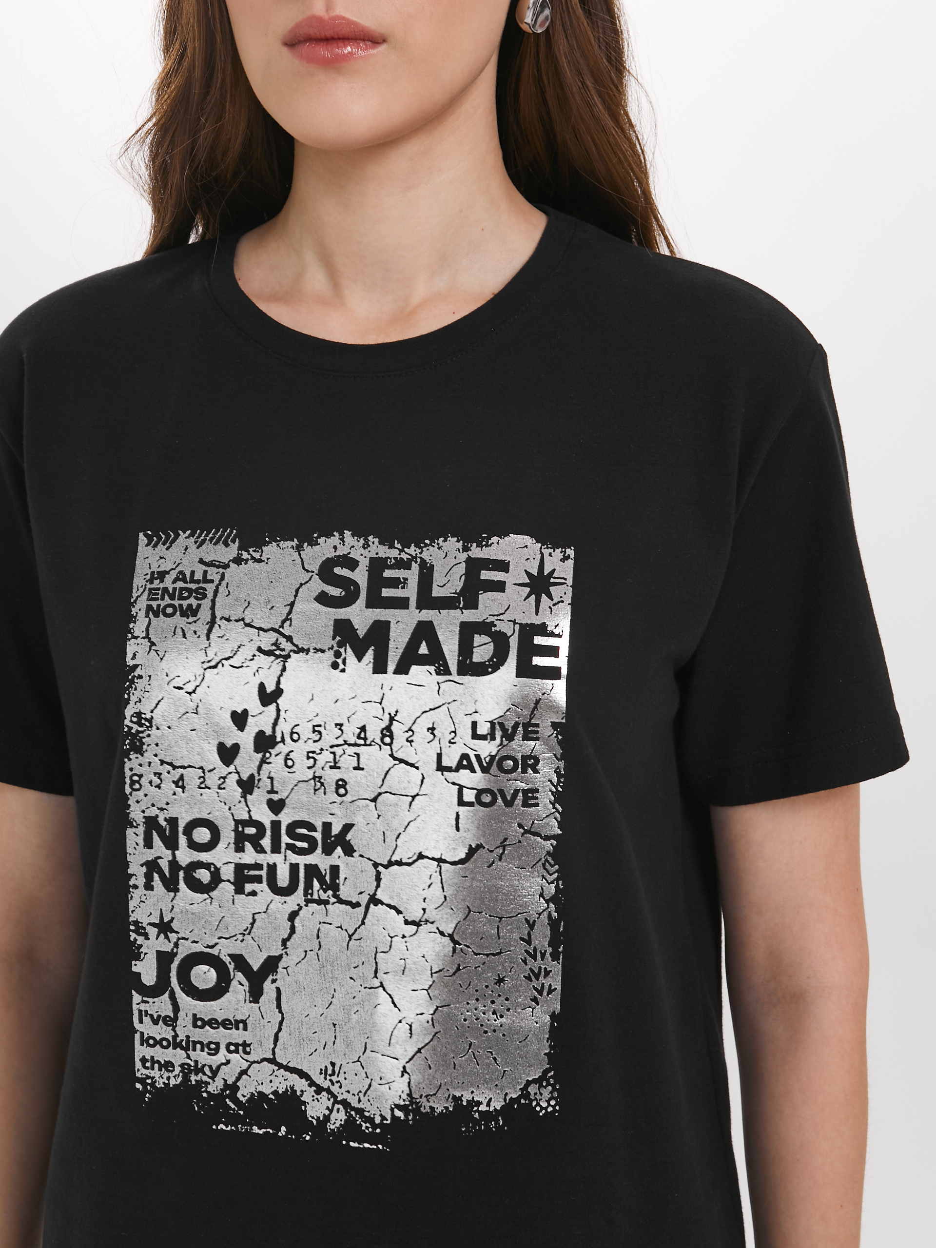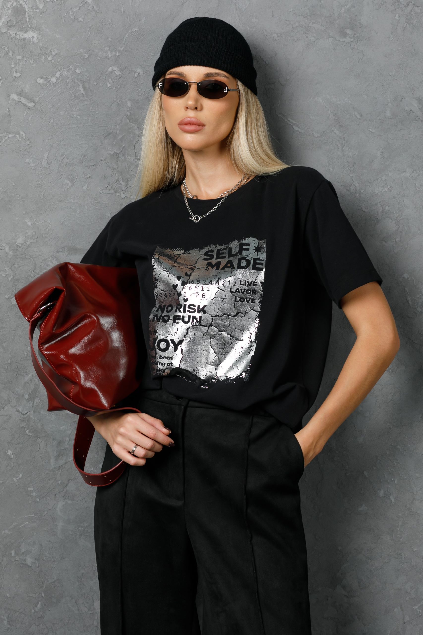 Футболка чёрнаяс принтом от фабрики Priz. Модель прямого кроя, выполнена из трикотажа. Рукав втачной, короткий. Плечо спущенное. Горловина обработана бейкой. Комфорт и стиль на каждый день.