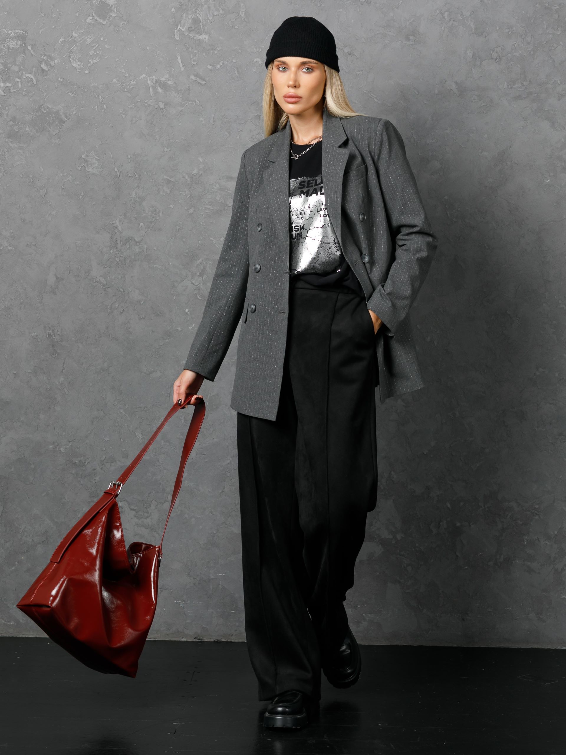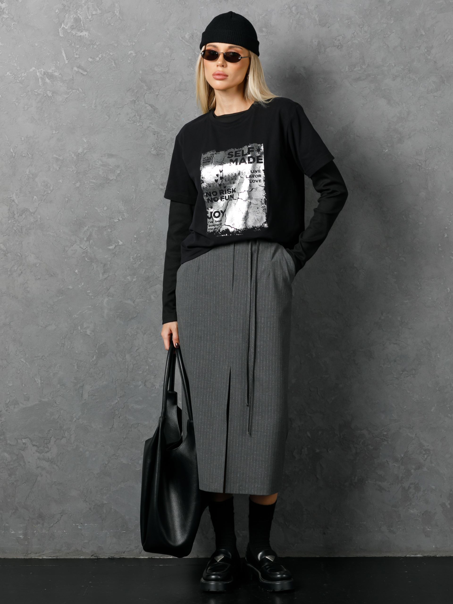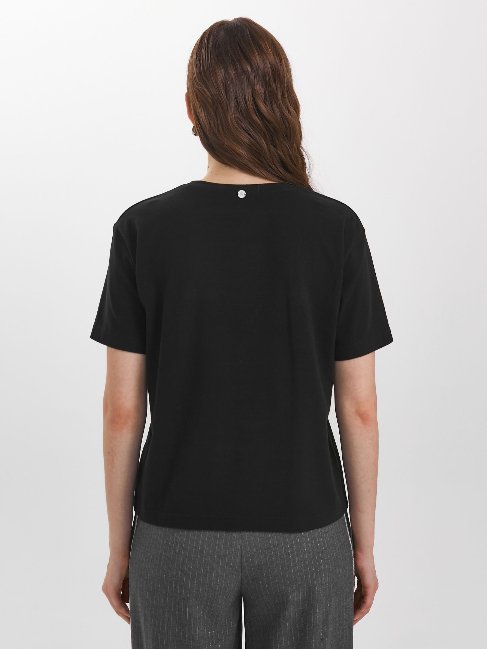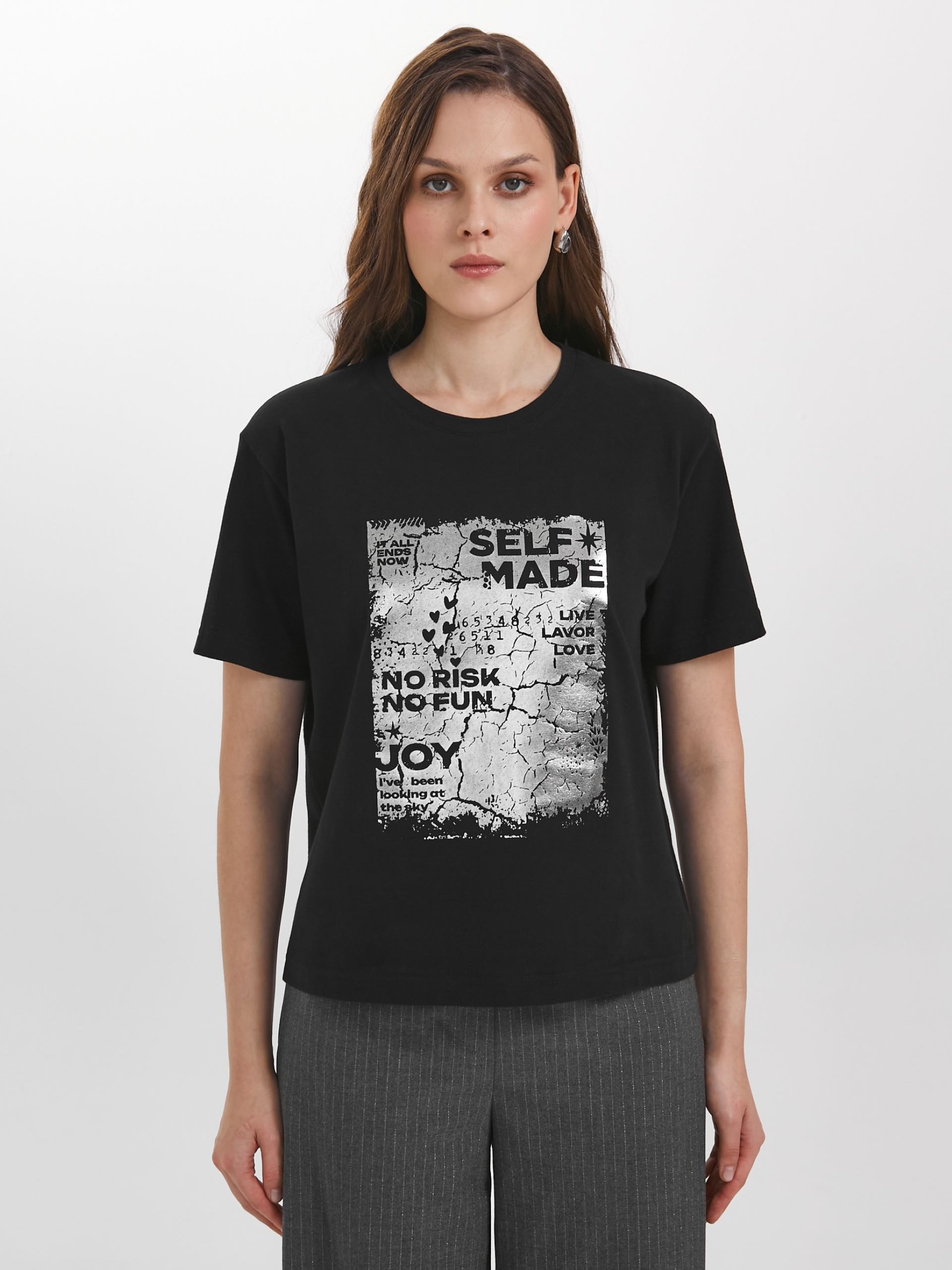 Футболка чёрнаяс принтом от фабрики Priz. Модель прямого кроя, выполнена из трикотажа. Рукав втачной, короткий. Плечо спущенное. Горловина обработана бейкой. Комфорт и стиль на каждый день.