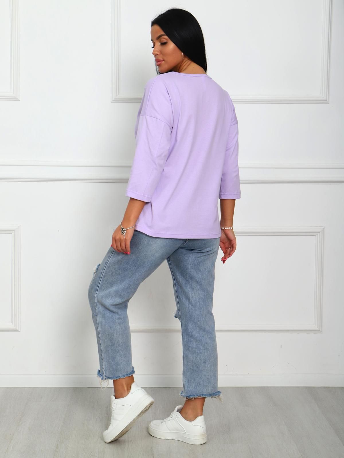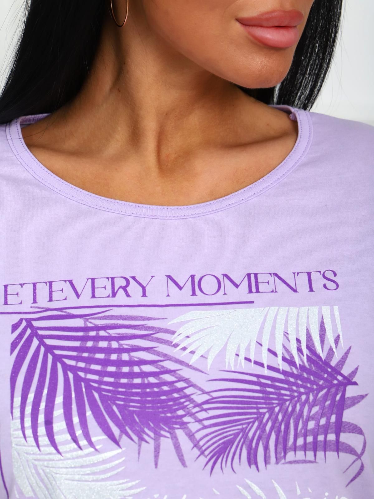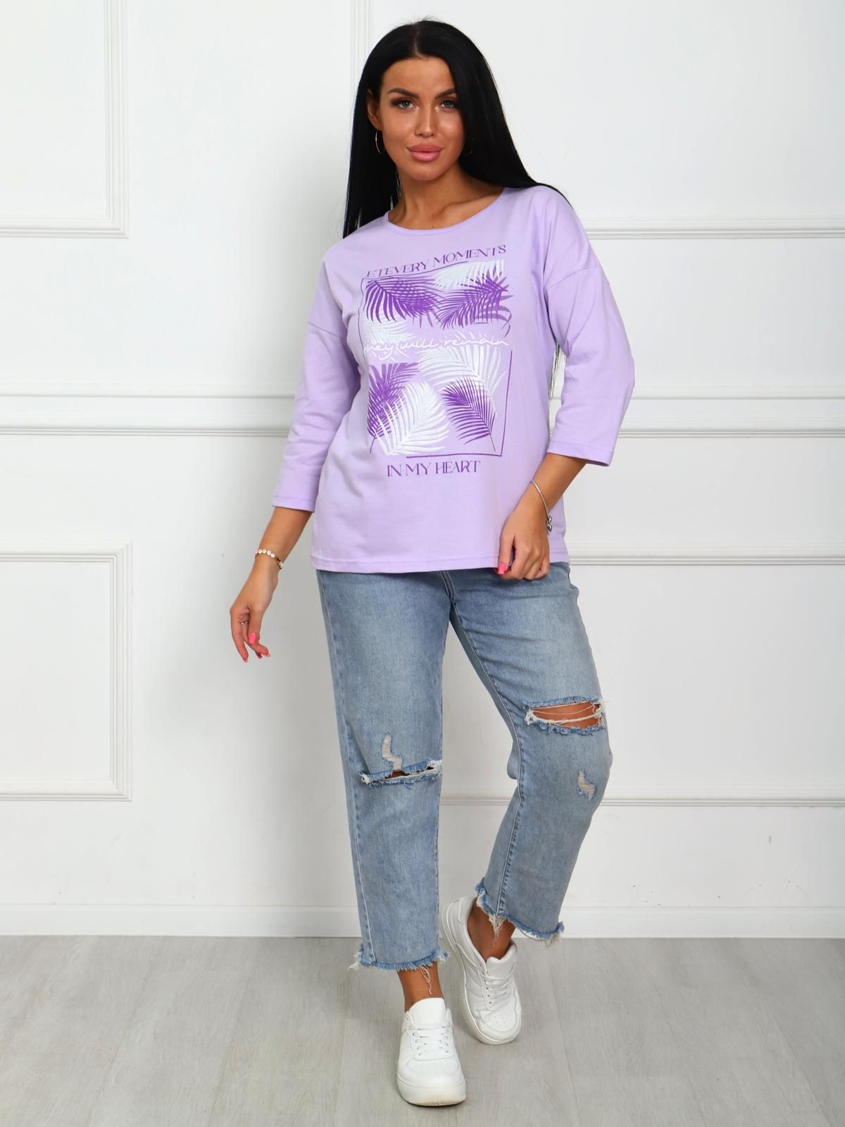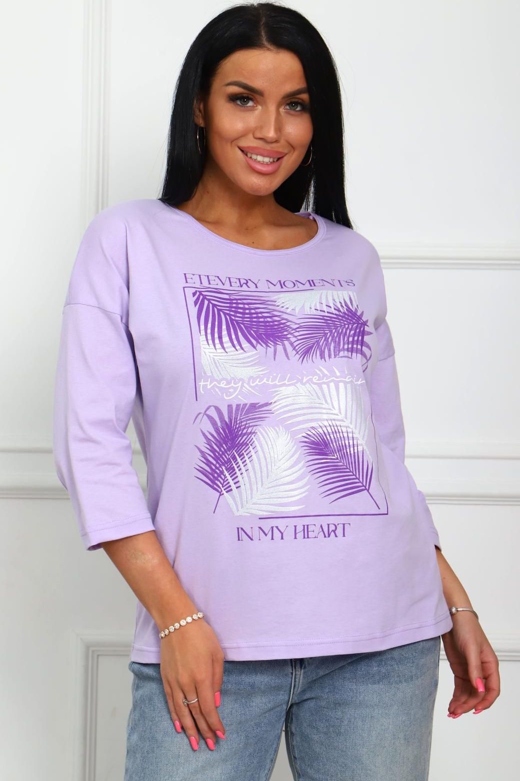 Футболка трикотажная лилового цвета от компании Iv-czpriz. Отличный вариант одежды, который позволяет скрыть все недостатки фигуры и подчеркнуть достоинства. Мягкие линии делают эту модель очень женственной. Горловина круглой формы. Полуприлегающий силуэт, рукав три четверти. Принт нанесен непосредственно в ткань футболки - не наклейка.