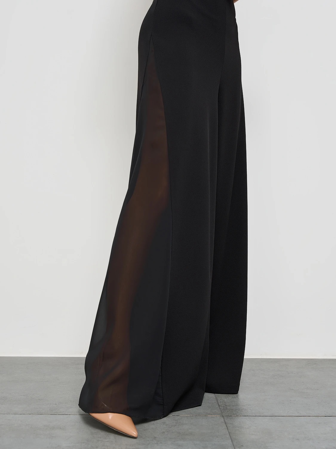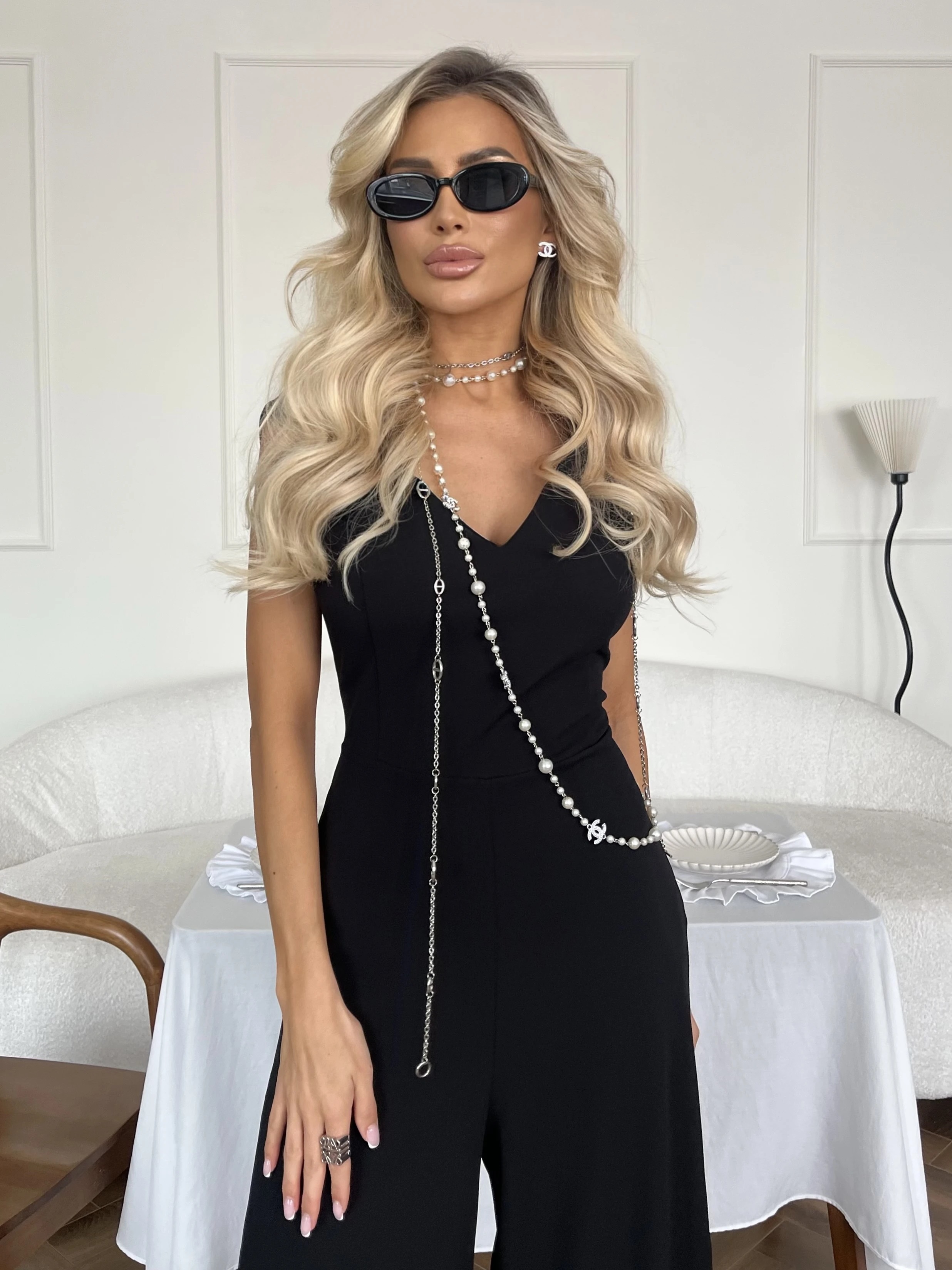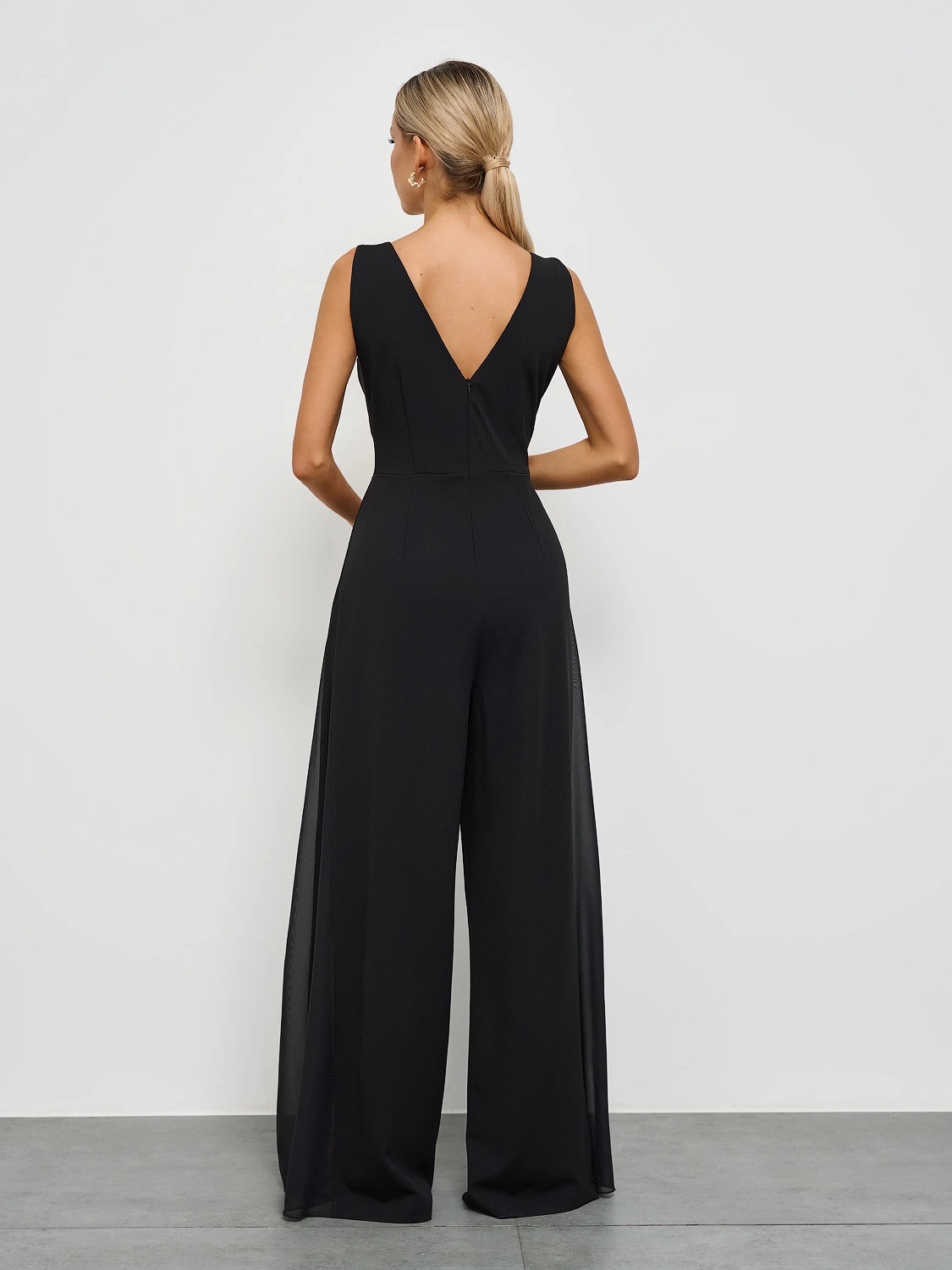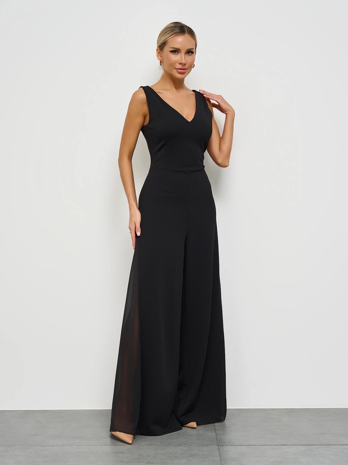 Комбинезон нарядный чёрного цвета от производителя Jetty, выполнен из креп-трикотажа. Модель прилегающего силуэта, отрезная по линии талии. Брюки широкие со вставками по бокам из шифона. V-образный вырез по переду и по спинке. Потайная застежка молния расположена в среднем шве спинки. Стильный вариант для торжественного мероприятия.