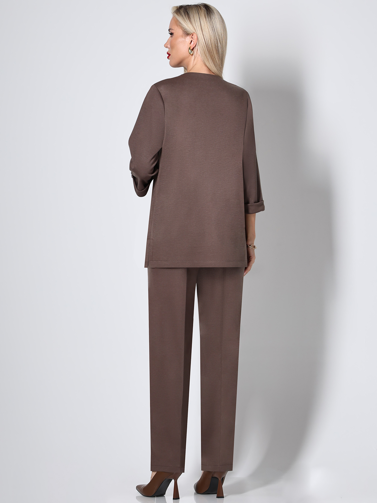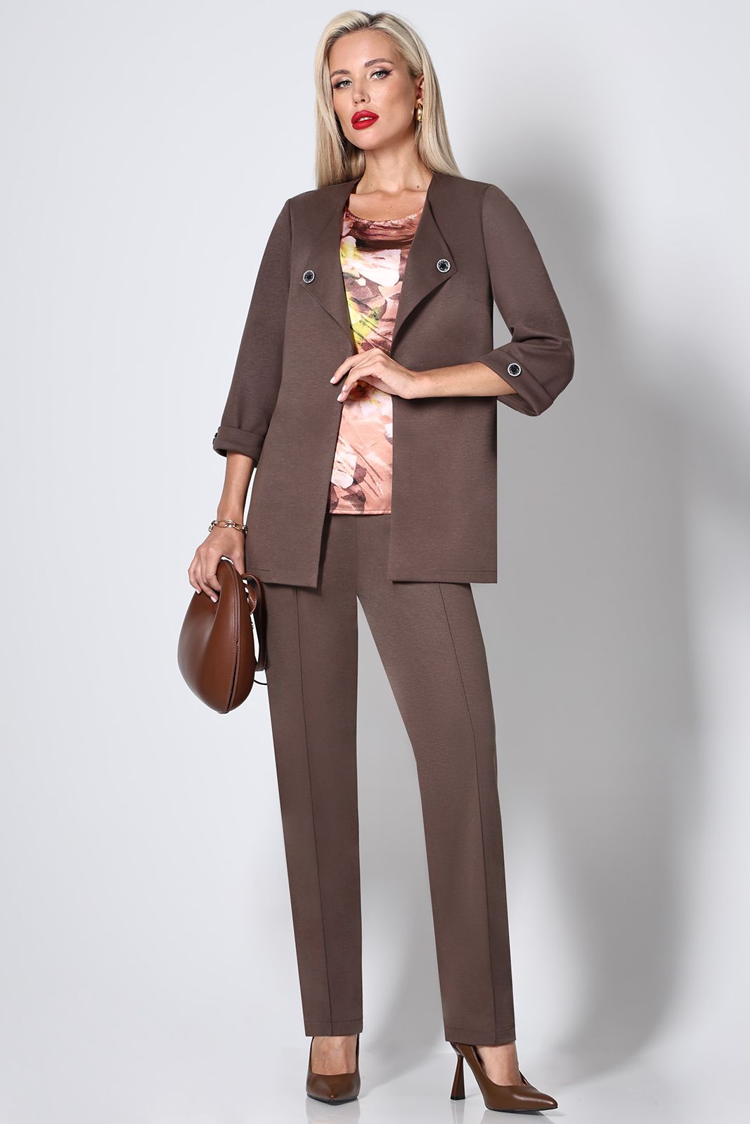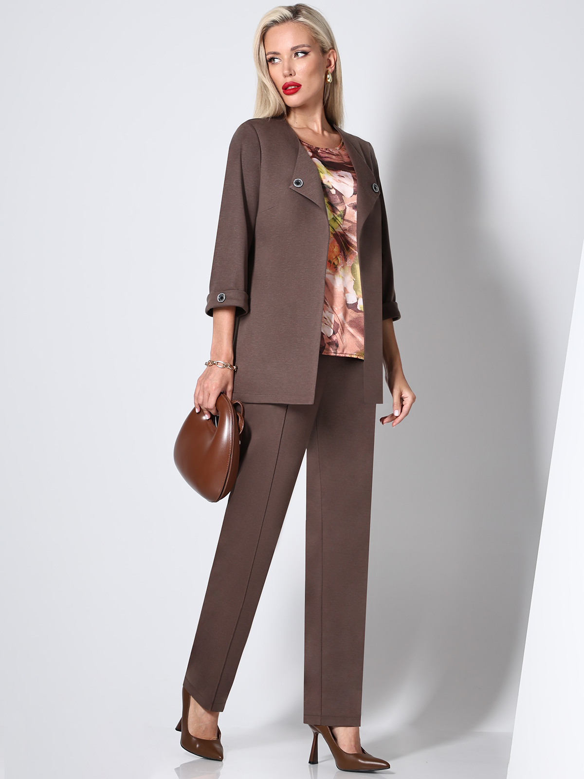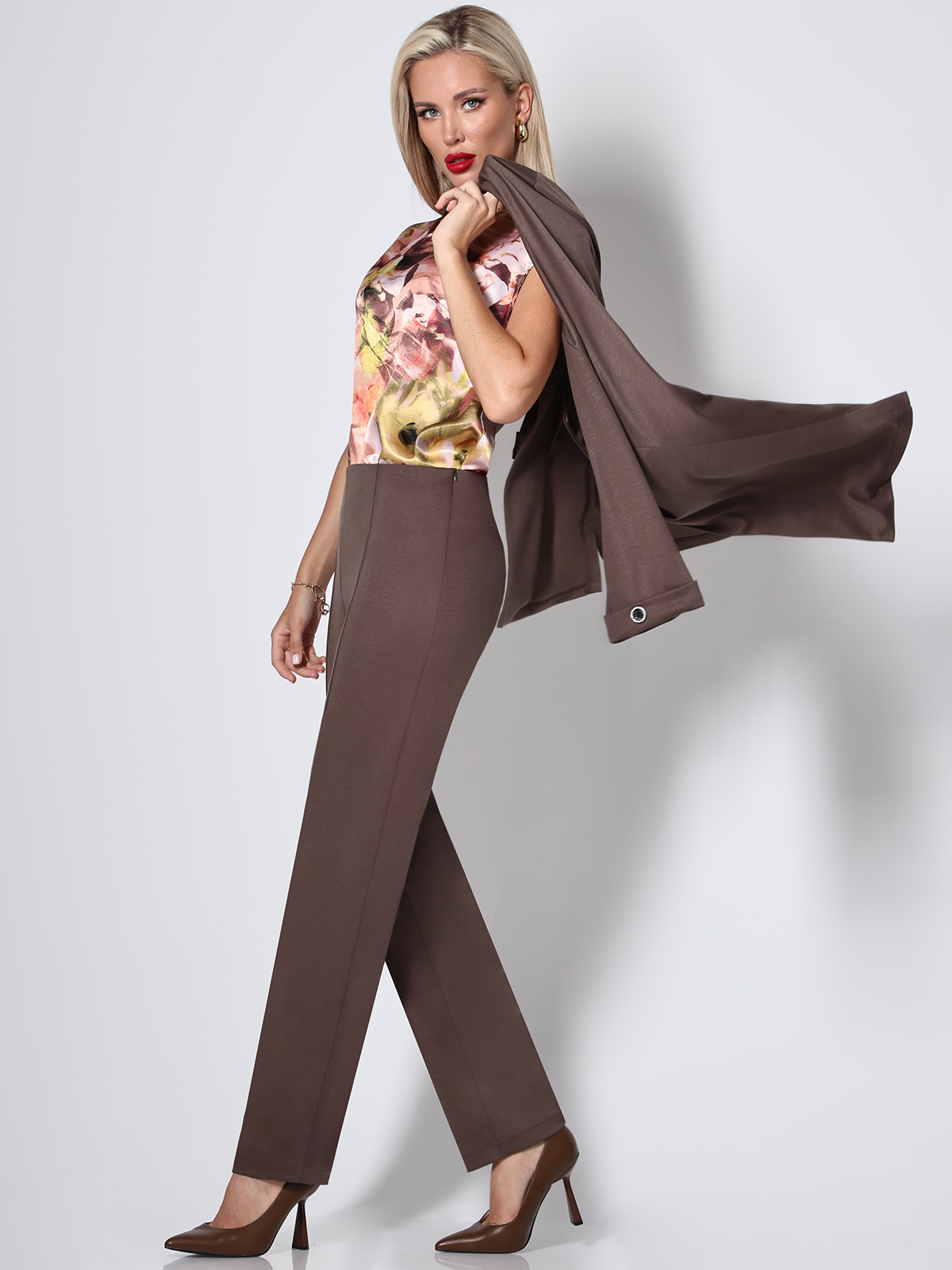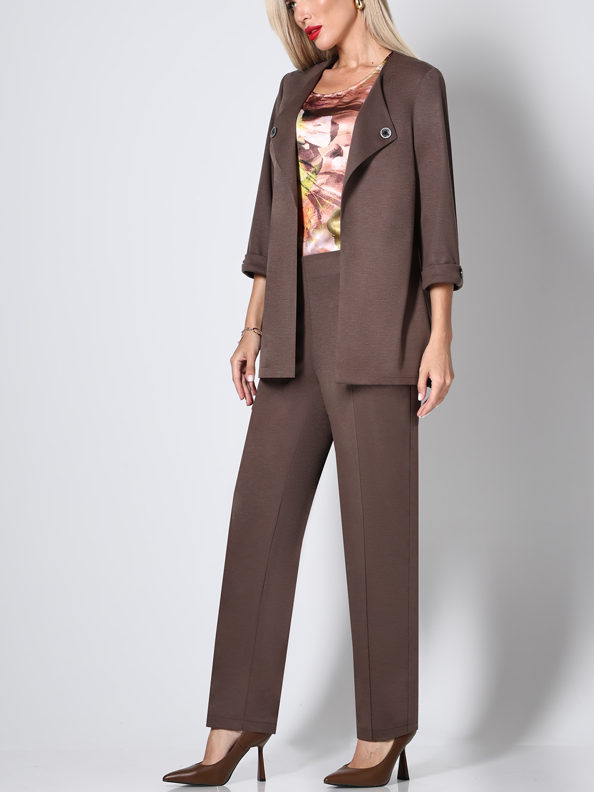 Костюм-тройка с брюками в коричневом цвете от бренда SelenaSonata, выполнен из трикотажного полотна. Блуза прямого силуэта, выполнена из атласа с принтом. Круглый вырез горловины, короткие рукава. Жакет прямого силуэта, с V-образным вырезом горловины, втачные рукава длиной 3/4, без застёжки. Брюки прямого силуэта, со стрелками, сбоку застёжка на молнию. Хороший выбор для делового образа. Рекомендована ручная стирка при 30 С.