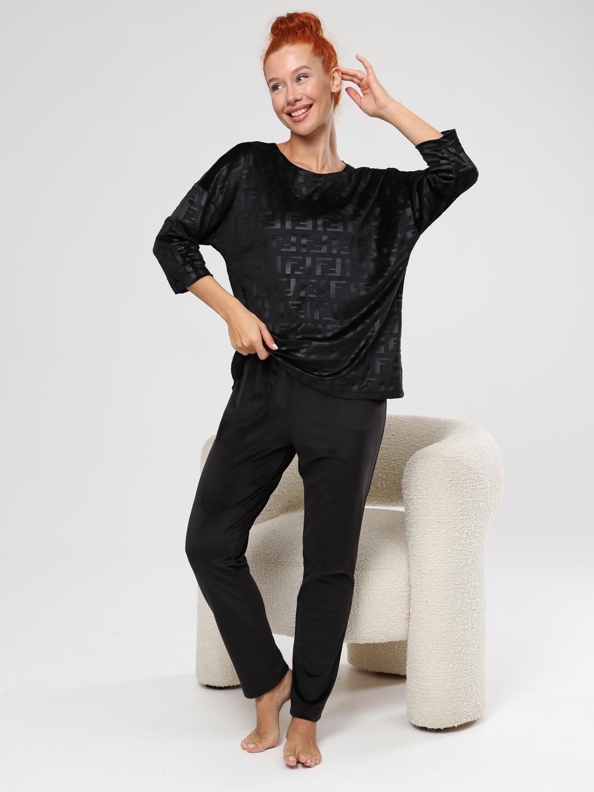 Костюм велюровый с брюками в чёрном цвете от бренда Iv-capriz. Кофта прямого силуэта со спущенной линией плеча. Рукав укороченныйй. Брюки зауженные, верх на эластичной тесьме, в боковых швах карманы. Идеальный вариант для прогулки по городу.