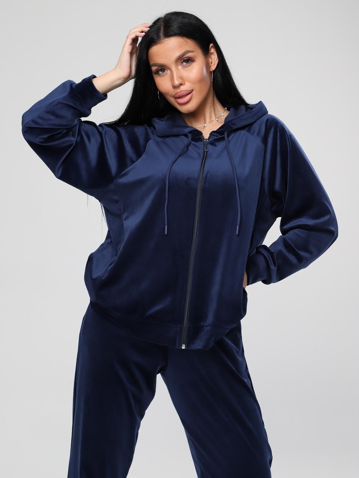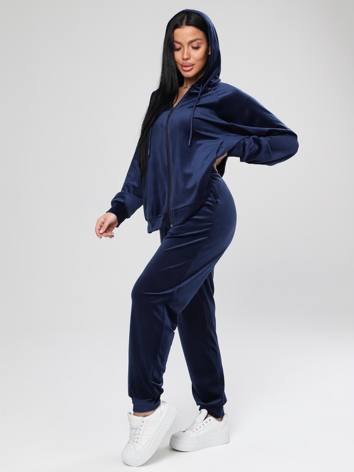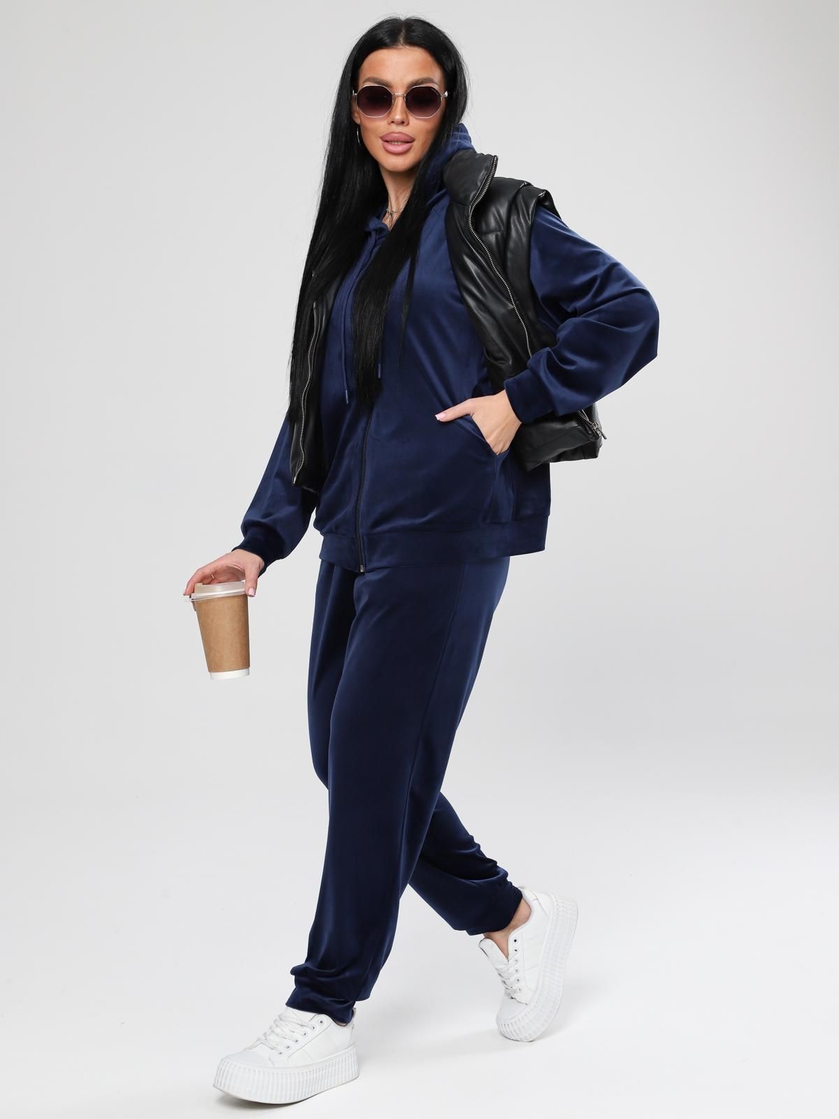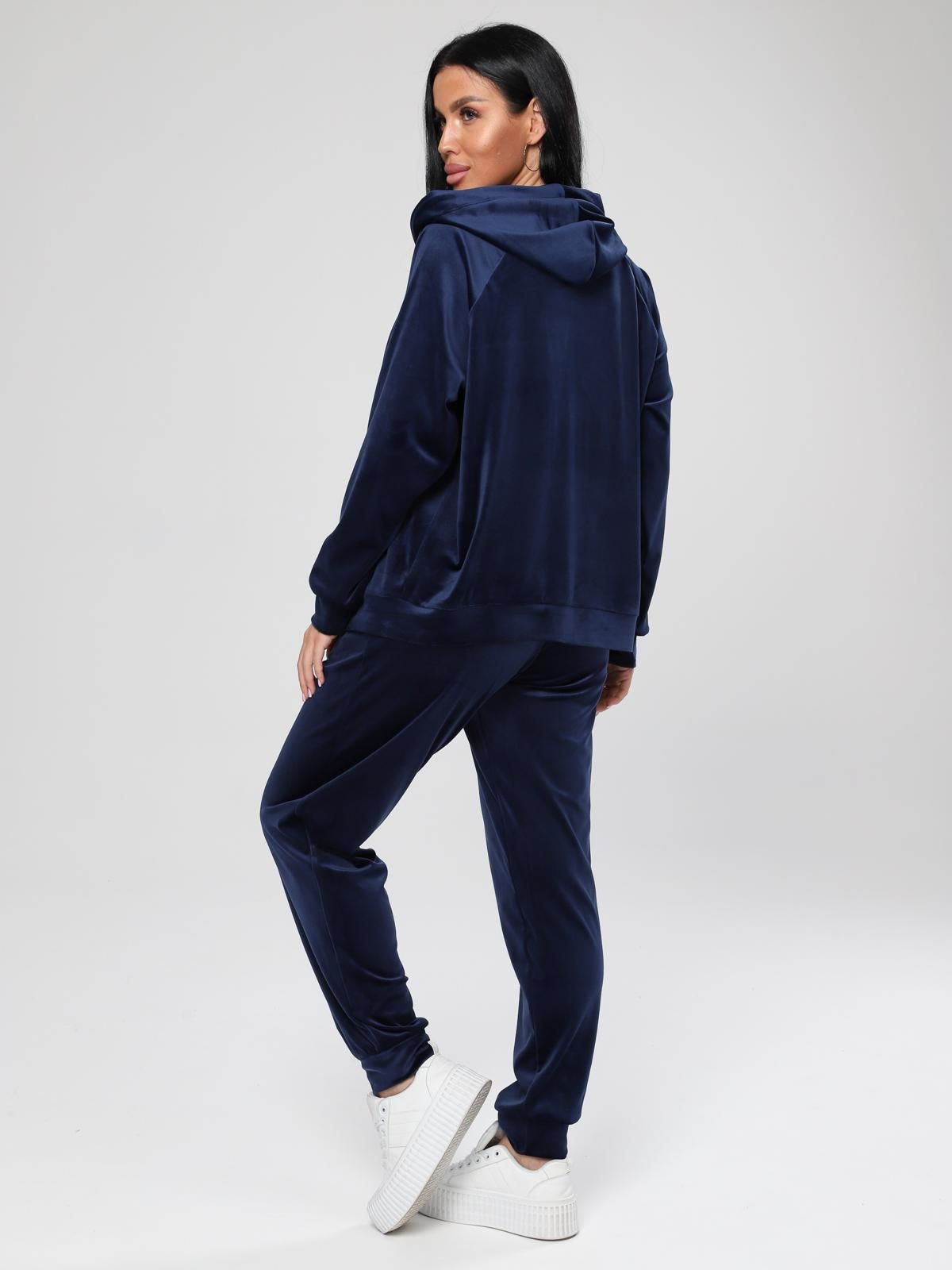 Костюм велюровый синий с брюками от бренда Iv-capriz. Кофта прямого силуэта со спущенной линией плеча, с капюшоном. Рукав длинный. По переду застёжка на молнию. Брюки удобные, верх на эластичной тесьме, в боковых швах карманы. Идеальный вариант для прогулки по городу.