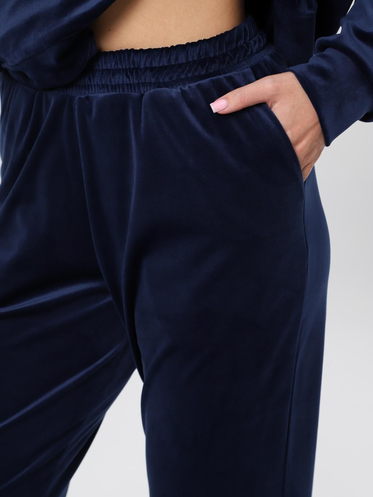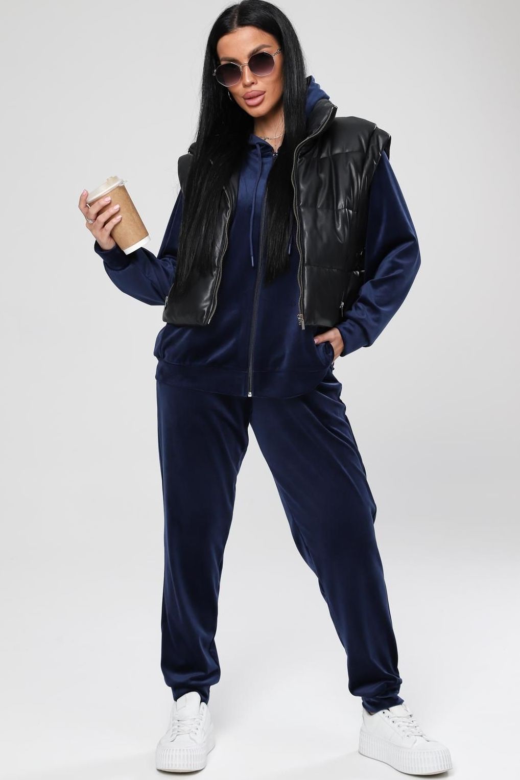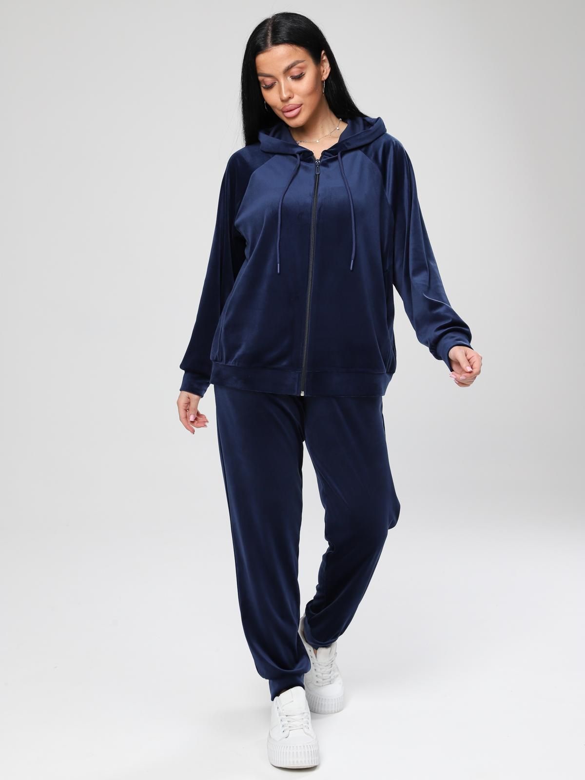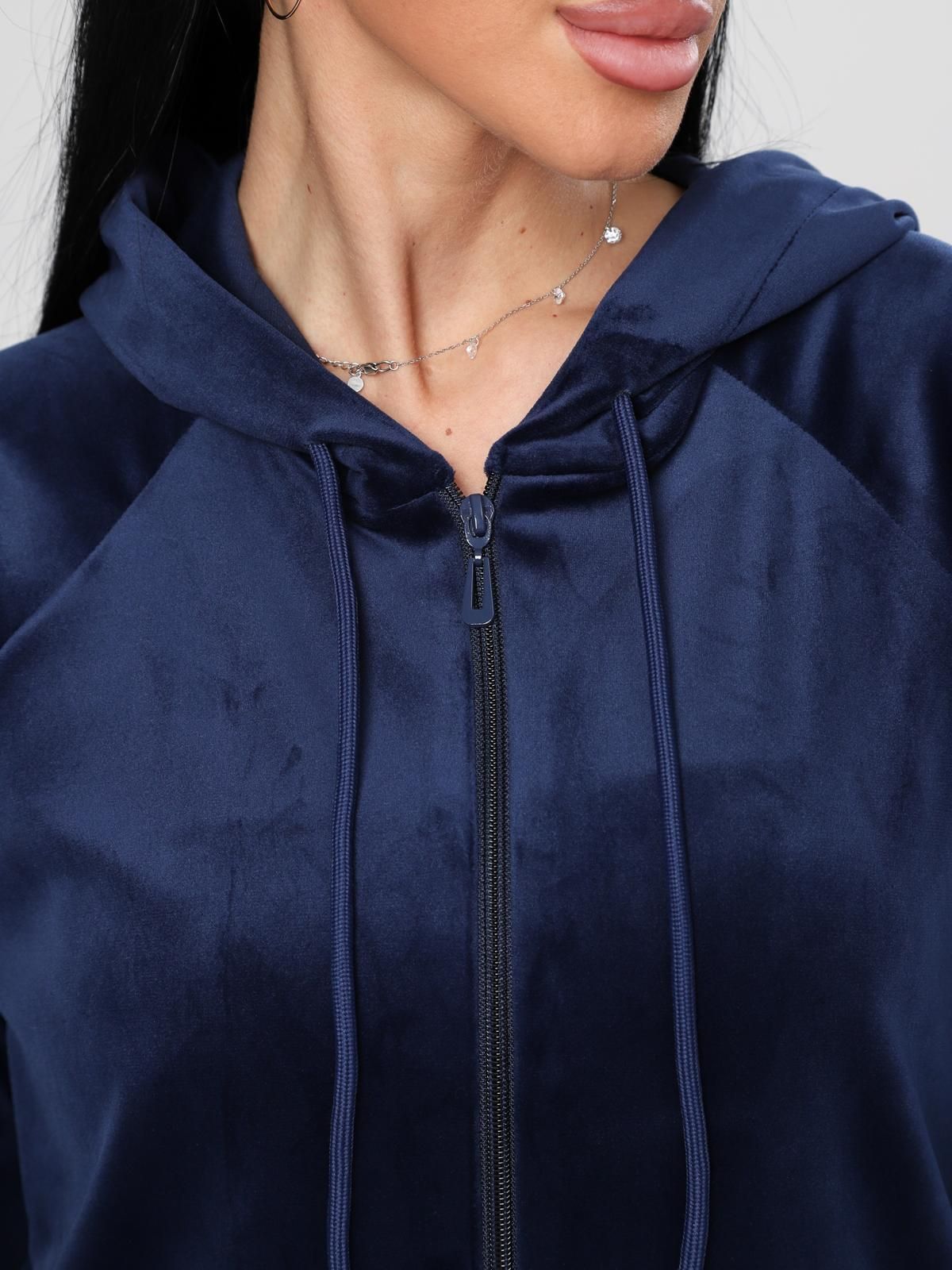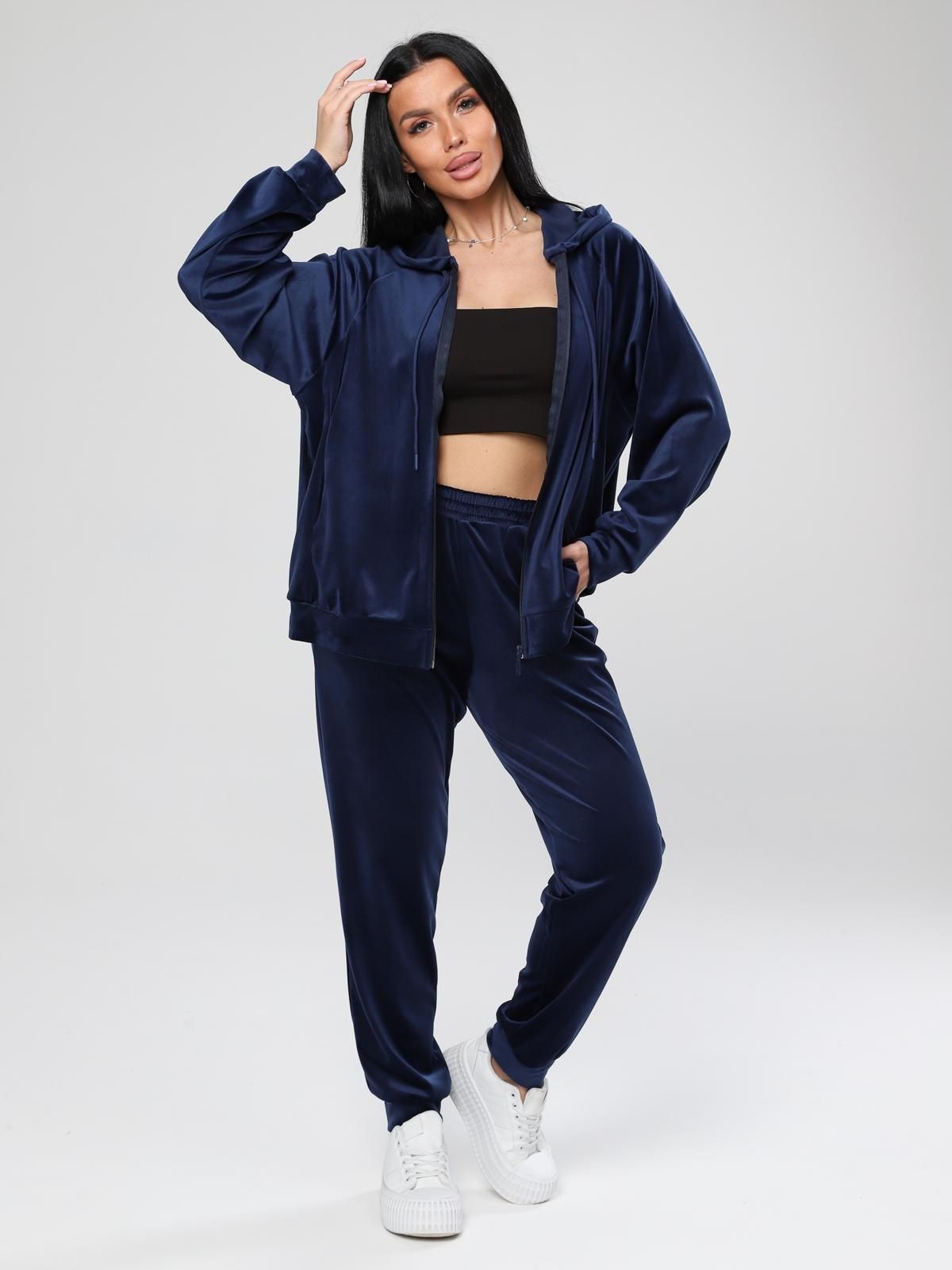 Костюм велюровый синий с брюками от бренда Iv-capriz. Кофта прямого силуэта со спущенной линией плеча, с капюшоном. Рукав длинный. По переду застёжка на молнию. Брюки удобные, верх на эластичной тесьме, в боковых швах карманы. Идеальный вариант для прогулки по городу.
