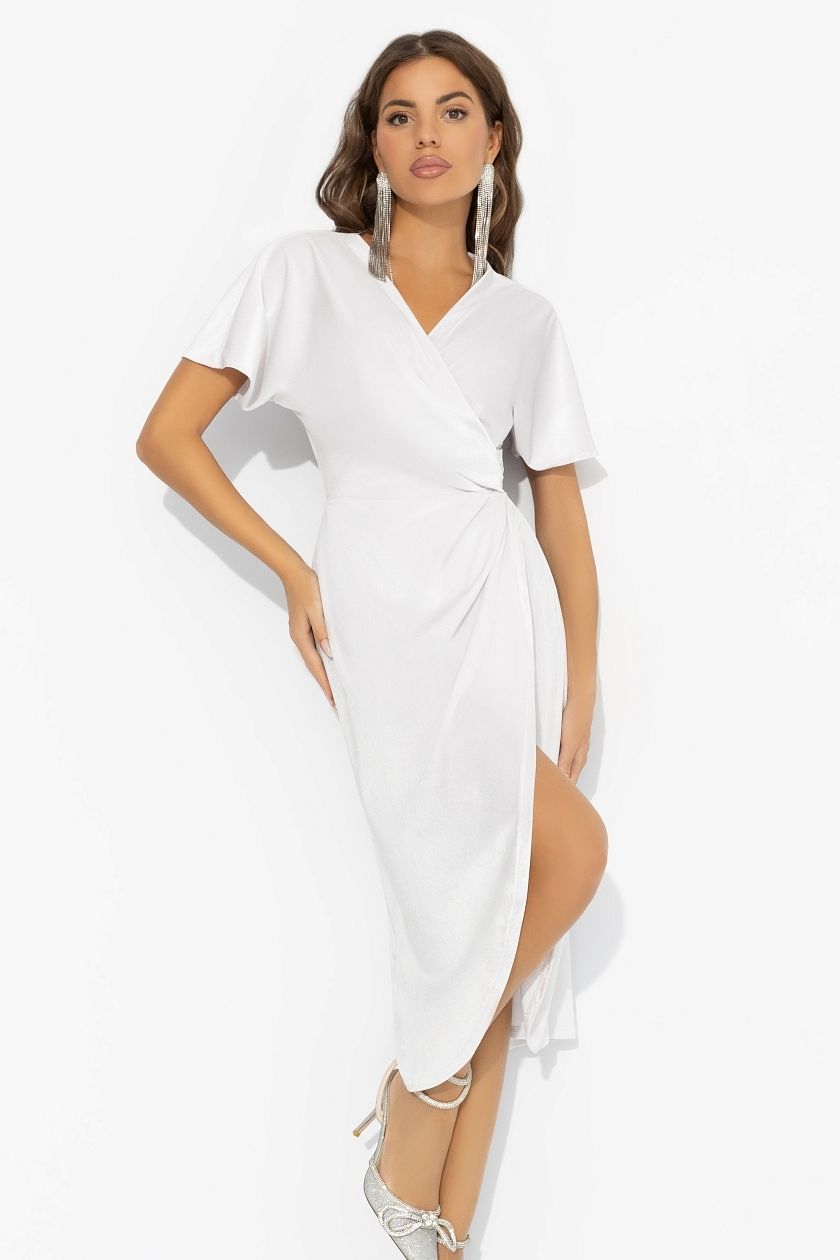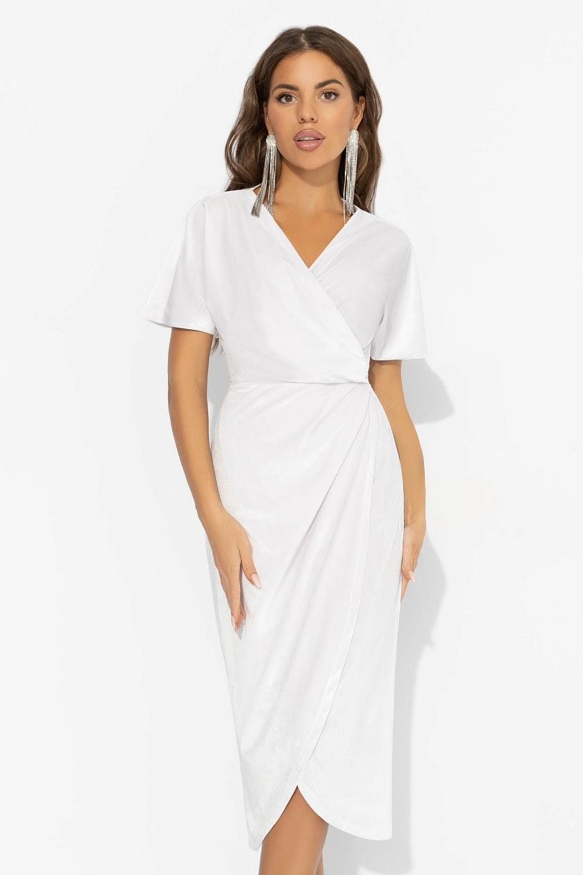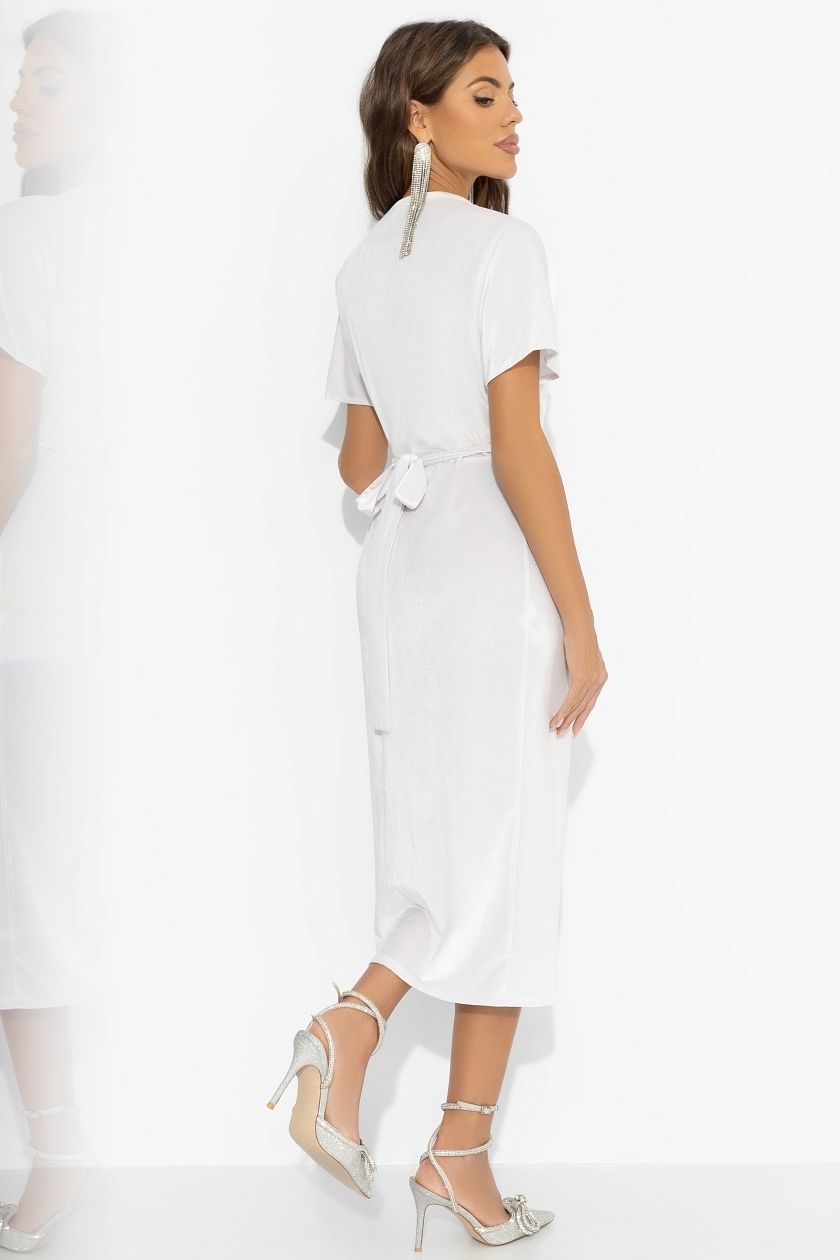 Платье бархатное на запах белого цвета от компании Charutti. Модель полуприлегающего силуэта. V-образный вырез горловины. Цельнокроеные короткие рукава. Платье с эффектной драпировкой. Идеальный выбор для создания женственного образа.