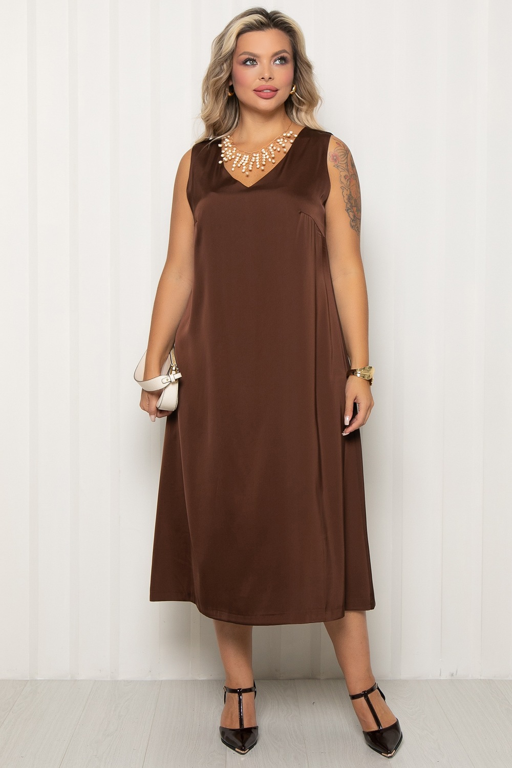 Платье в бельевом стиле шоколадного цвета из плотного шёлка от бренда Agata. Модель А-силуэта, открытая пройма рукава. V-образный вырез. Широкие бретели. Низ ровный, слегка расклешенный, без разрезов. Стильный вариант для встречи с подругами.