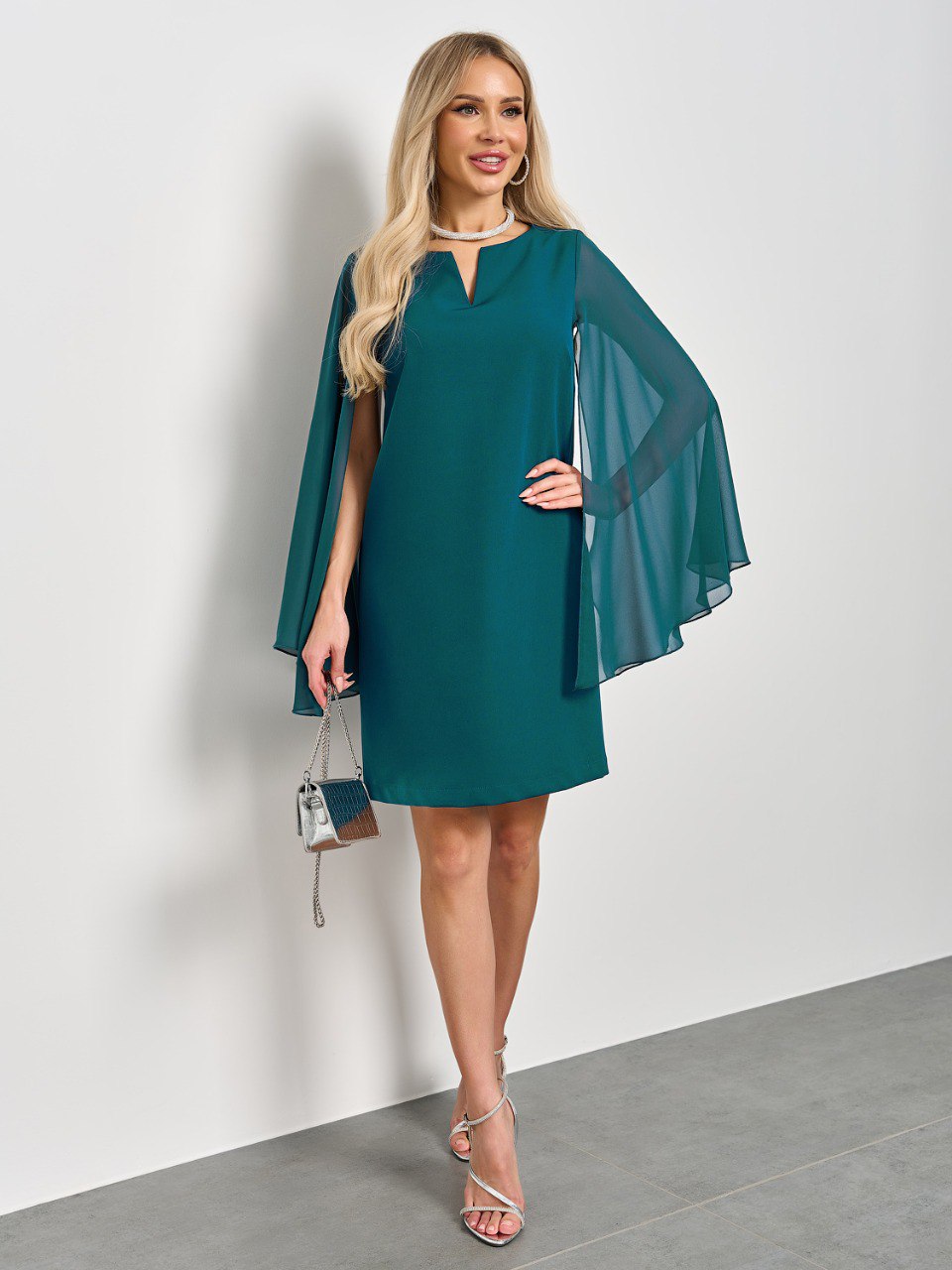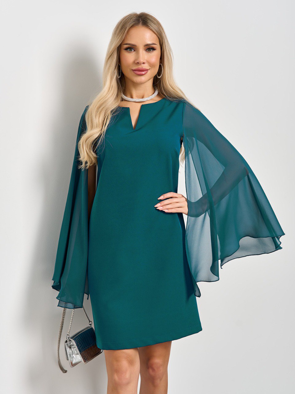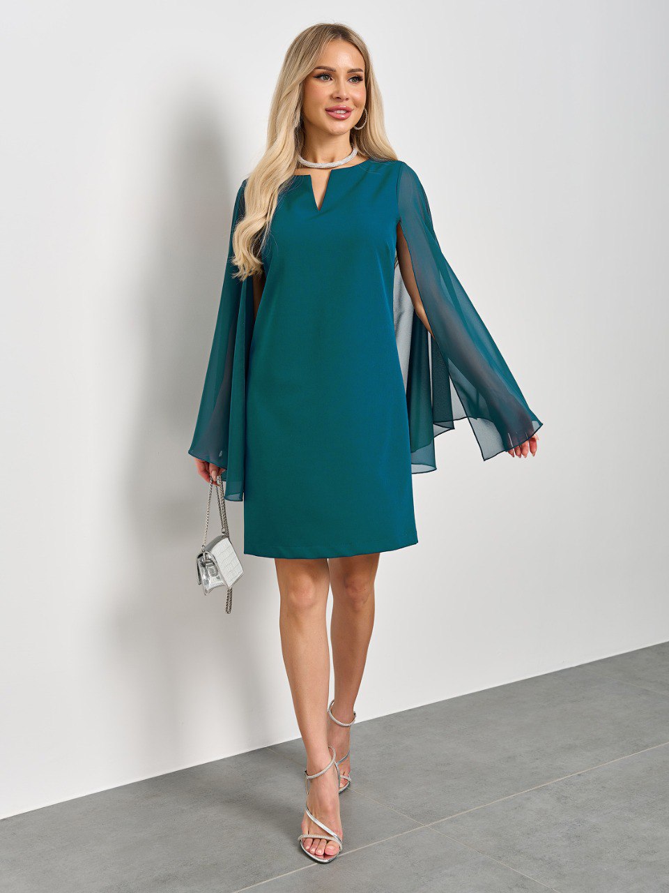 Длинные летящие рукава расклешенные к низу. Это элегантное платье создаст утонченный и роскошный образ для любого мероприятия.
