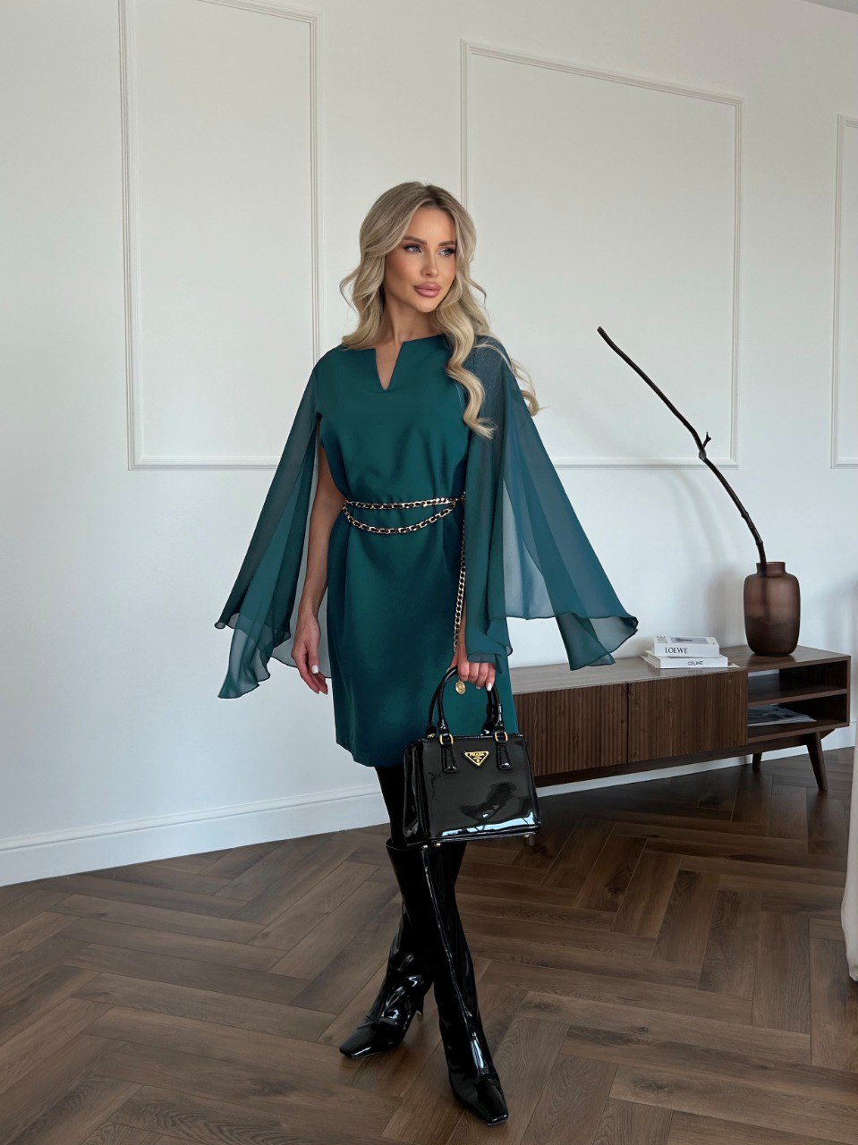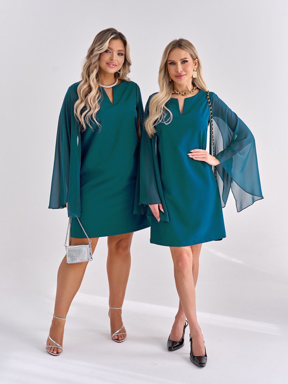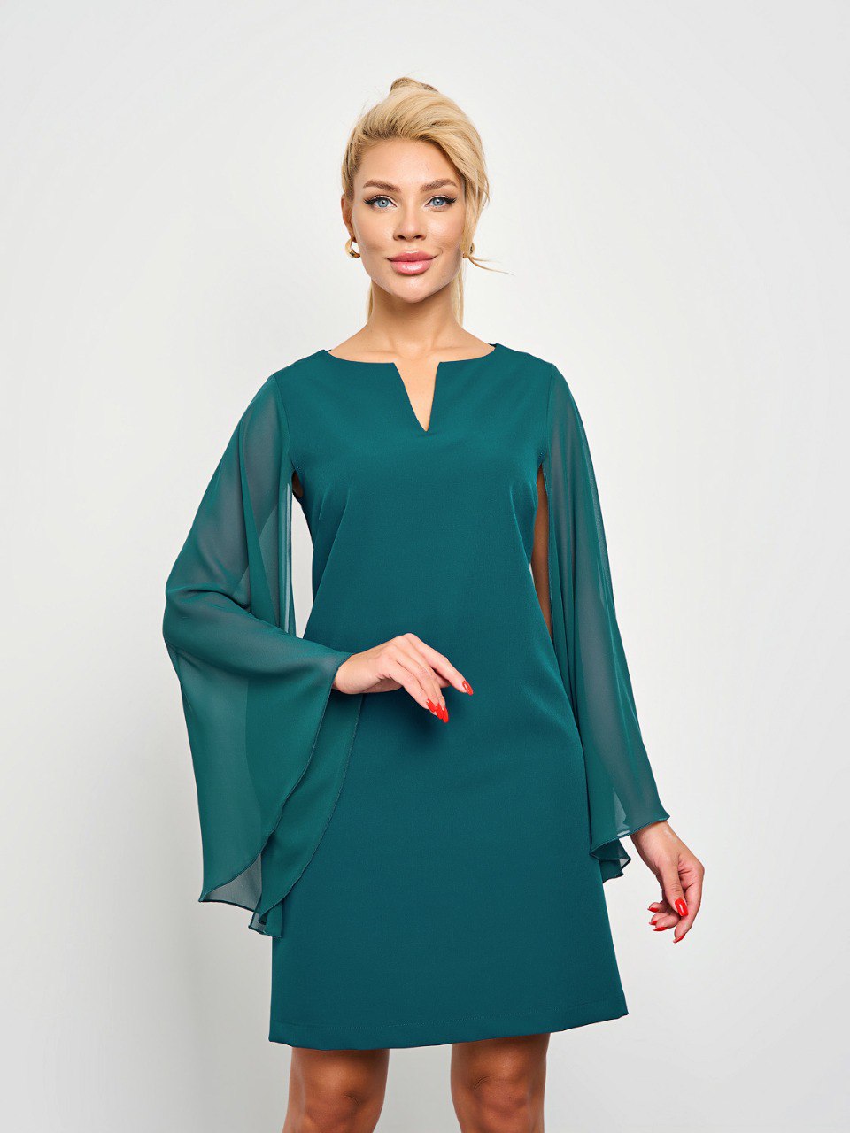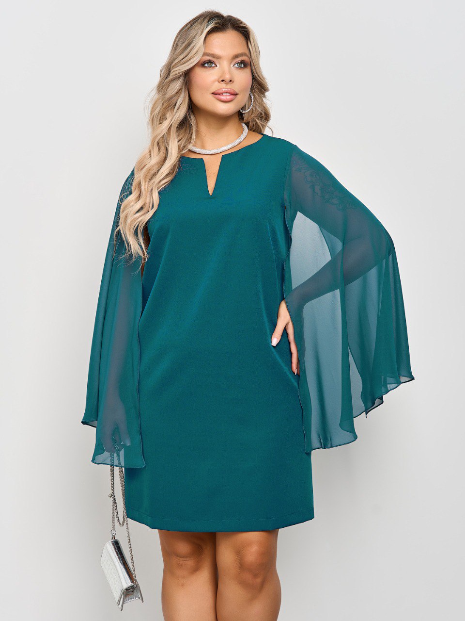 Длинные летящие рукава расклешенные к низу. Это элегантное платье создаст утонченный и роскошный образ для любого мероприятия.