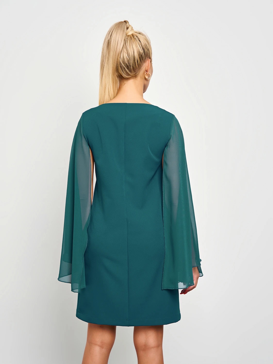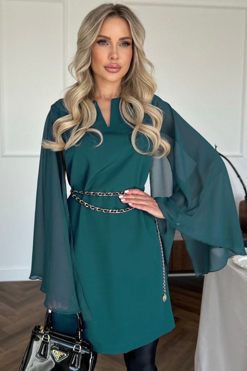 Платье изумрудного цвета с рукавами из шифона от компании Jetty. Модель прямого силуэта с вырезом лодочкой, дополненый V-образным вырезом , выполнено из костюмной ткани .