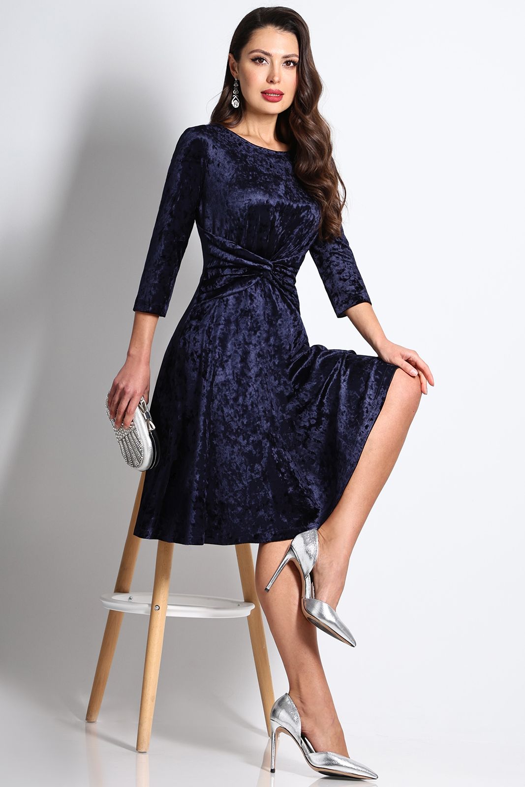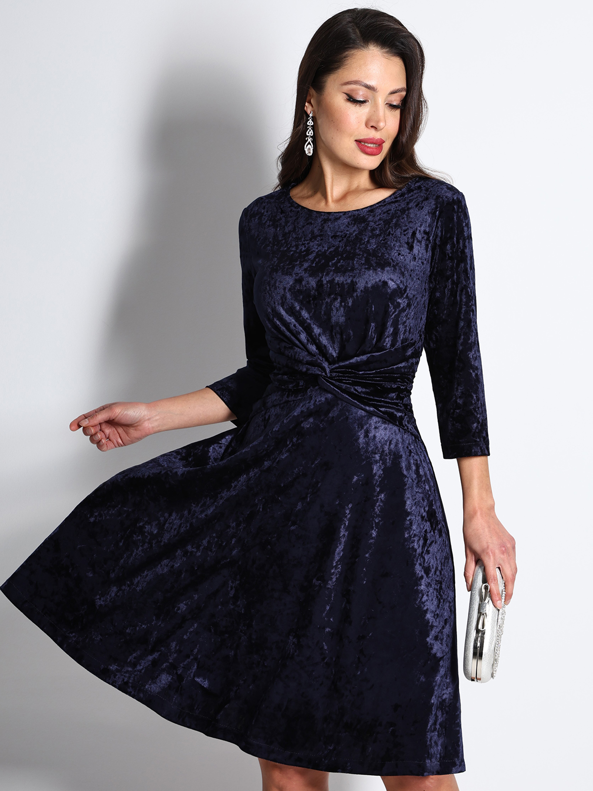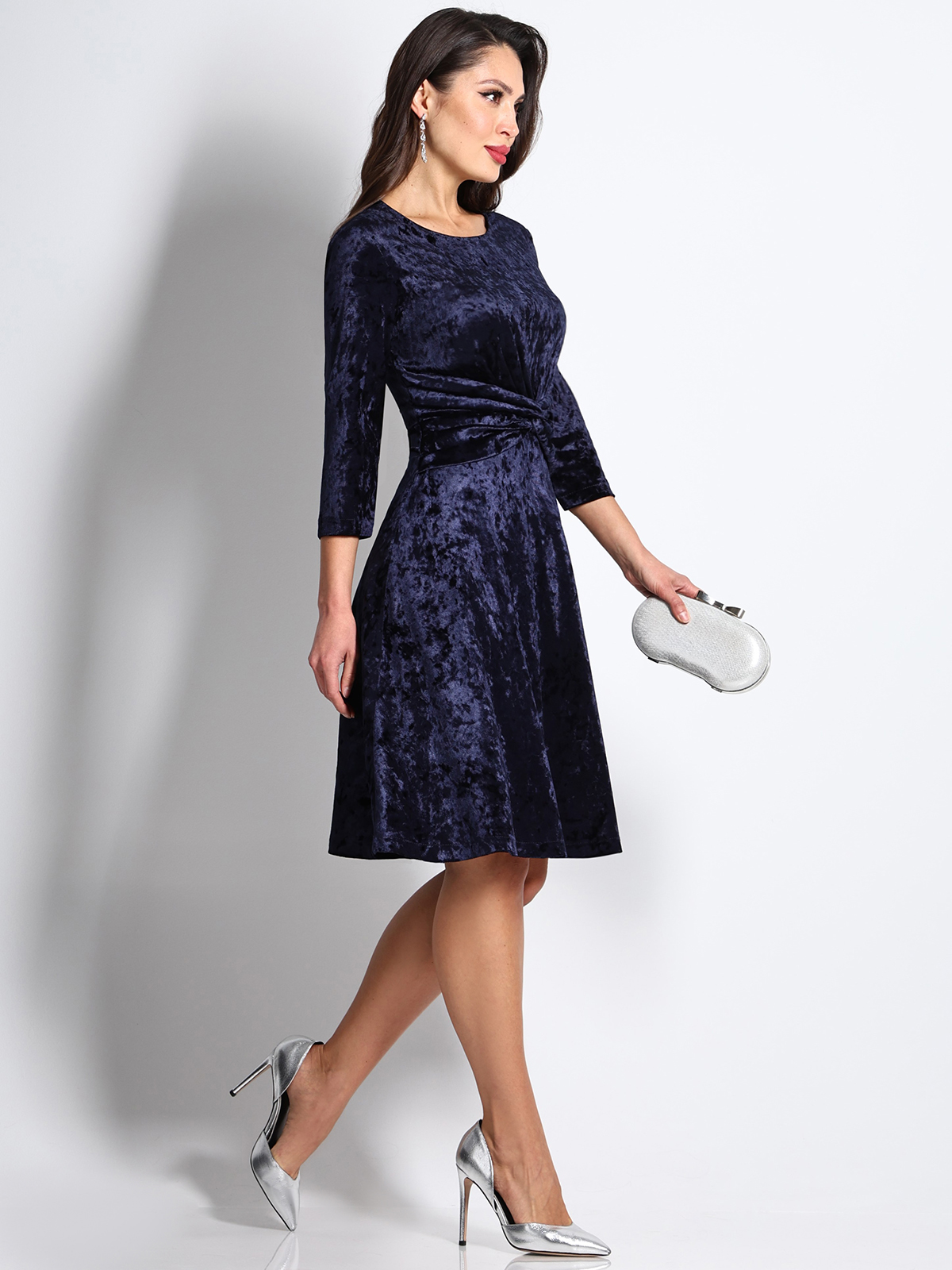 Платье бархатное синее с узлом от бренда SelenaSonata. Модель расширенного к низу силуэта. Круглый вырез горловины. Втачные укороченные рукава. Стильный вариант для торжественного мероприятия.