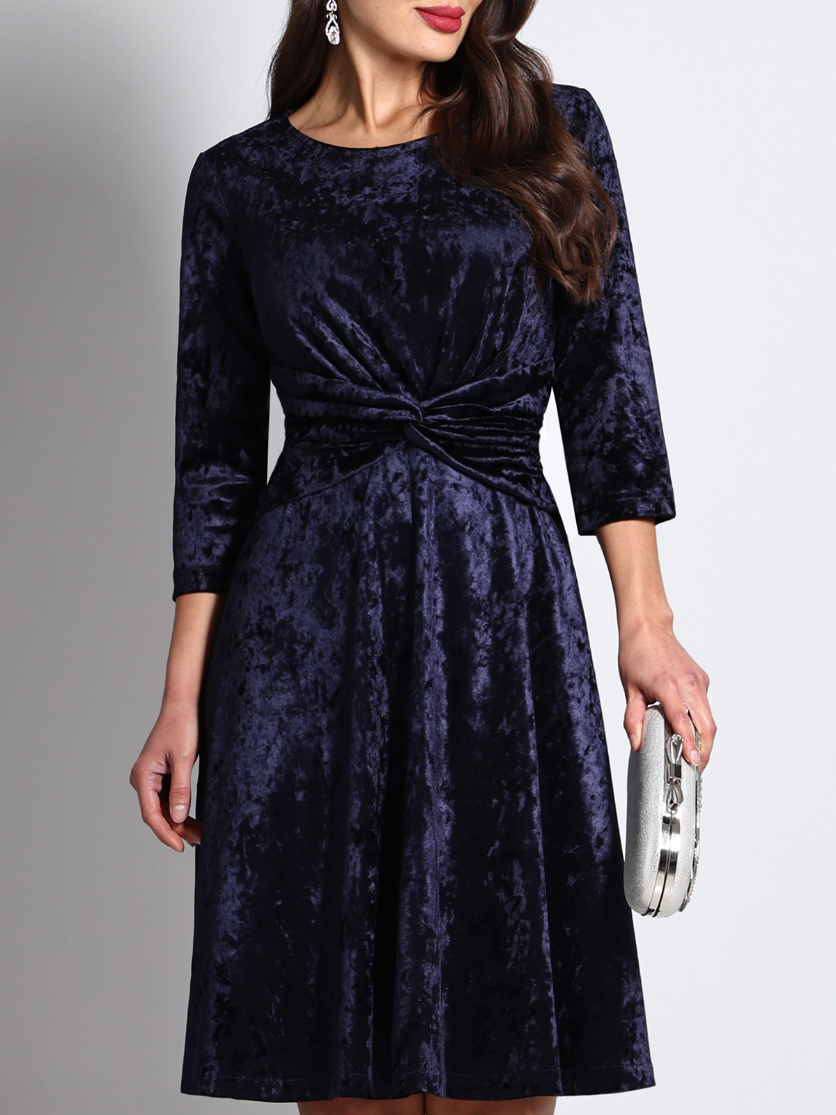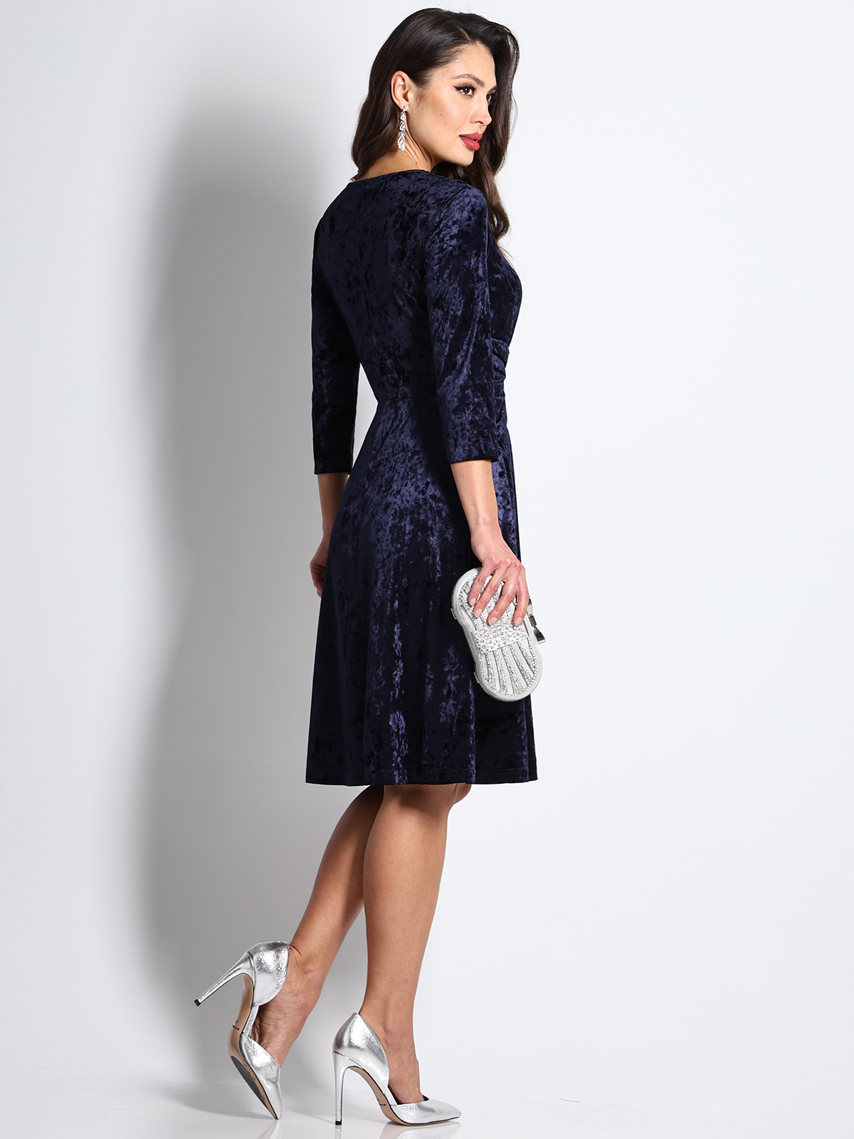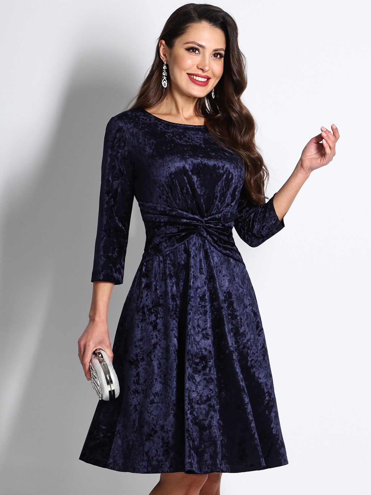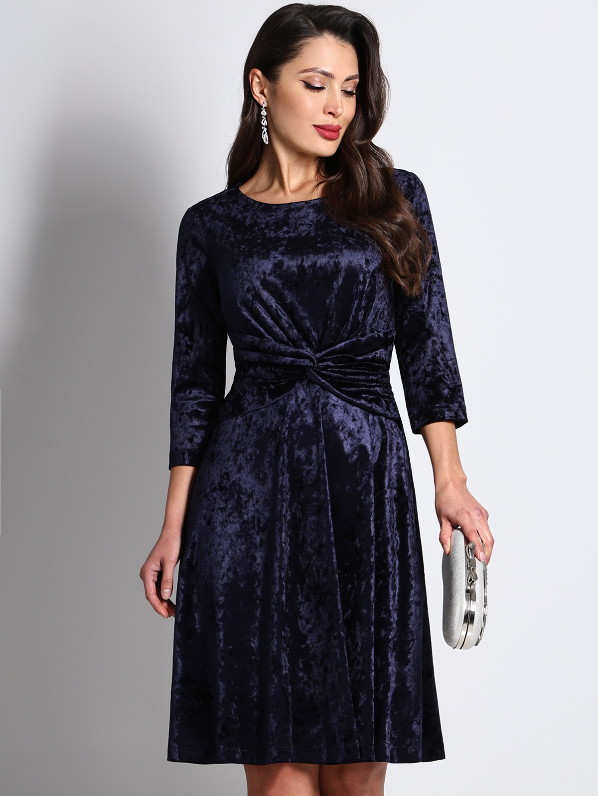 Платье бархатное синее с узлом от бренда SelenaSonata. Модель расширенного к низу силуэта. Круглый вырез горловины. Втачные укороченные рукава. Стильный вариант для торжественного мероприятия.