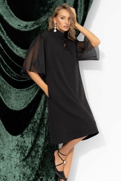 Платье чёрное с рукавами из органзы от компании Charutti. Модель свободного силуэта, выполнена из костюмной ткани "барби". Воротник-стойка с V-разрезом и завязками. Втачные рукава длиной 3/4, со спущенной линией плеча. По бокам удобные карманы. Идеальный выбор для создания базового образа.