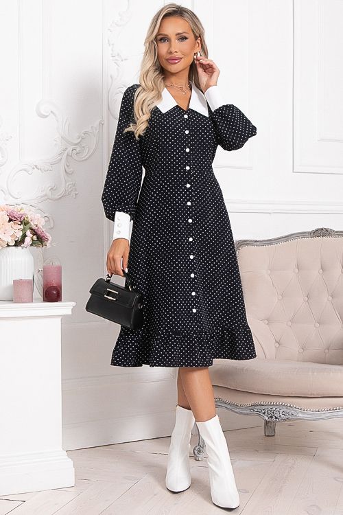 Платье чёрное в горошек от бренда Avili. Модель полуприлегающего силуэта, выполнена из текстильного полотна, в боковых швах талии пояски-завязки, можно завязать сзади и скорректировать талию. Отрезная юбка А-образного силуэта с воланом по низу. Изюминка платья-белый воротник ,манжеты и шикарные жемчужные пуговицы. По полочке центральная застежка до волана. Стильный вариант для элегантного образа.