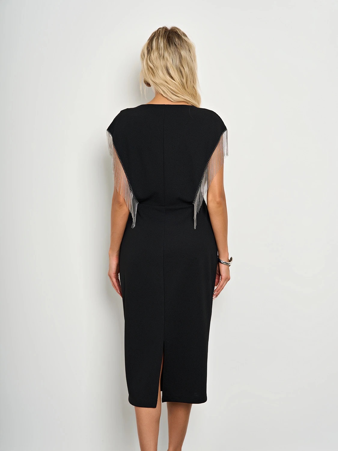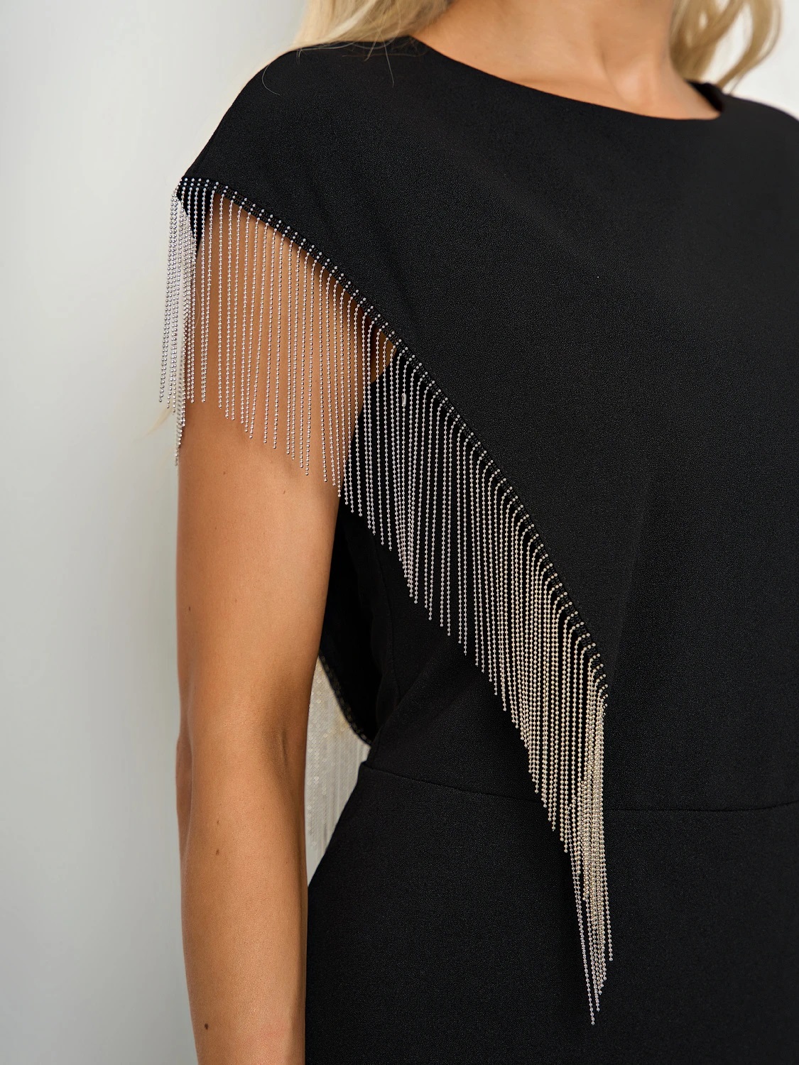 Платье-футляр чёрное с металлической бахромой от производителя Jetty. Модель прилегающего силуэта, выполнена из креп-трикотажа. Круглый вырез горловины. Отрезное по линии талии. Спинка изделия со средним швом и шлицей сзади. Идеальный выбор для создания вечернего образа.