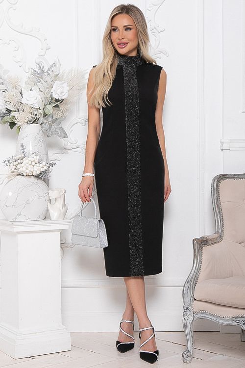 Платье нарядное чёрное без рукавов от бренда Avili. Модель полуприлегающего силуэта, выполнена из костюмной ткани. В среднем шве спинки застежка молния и разрез по низу. По переду декоративная вставка из трикотажа с блеском. Стильный вариант для торжественного мероприятия.