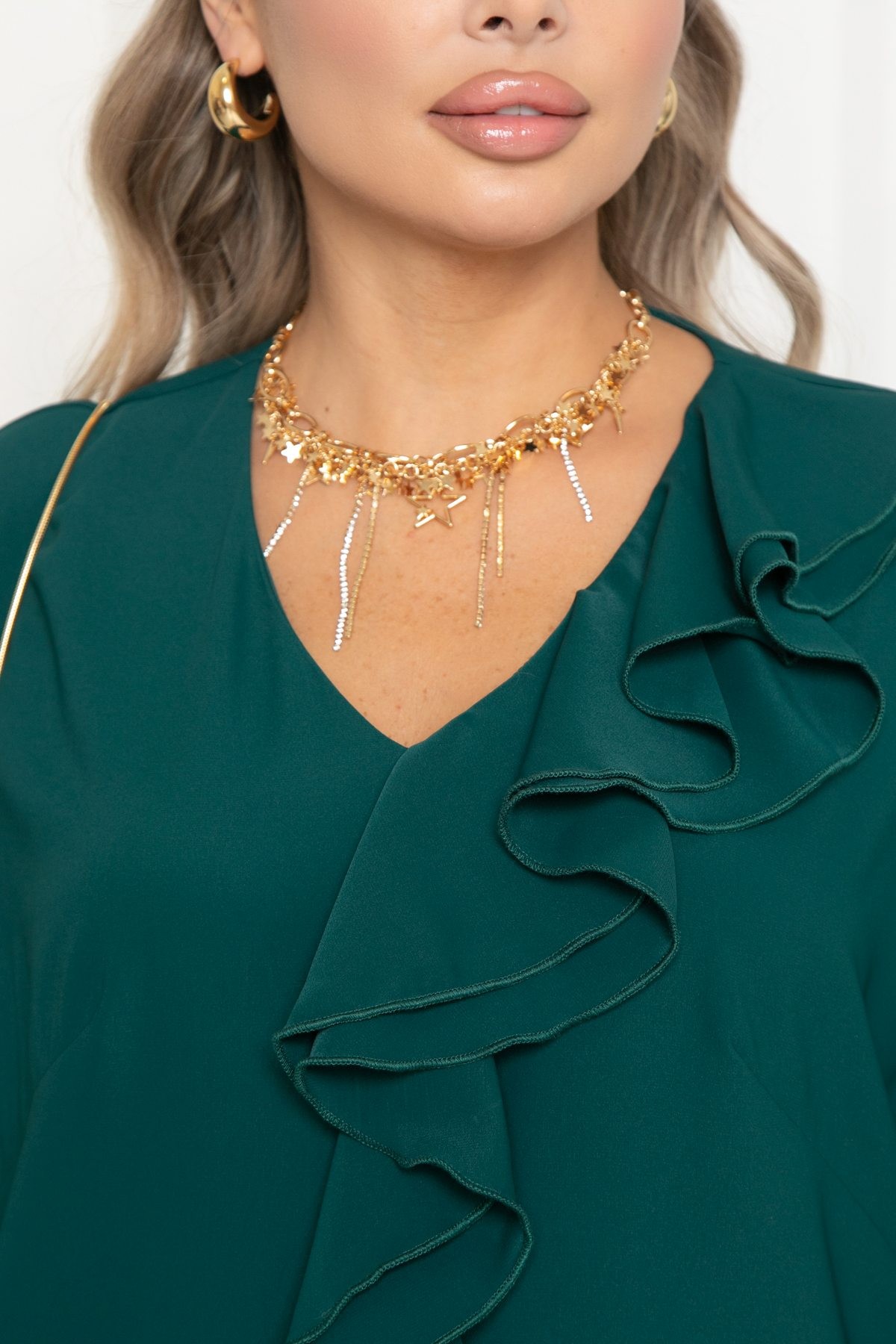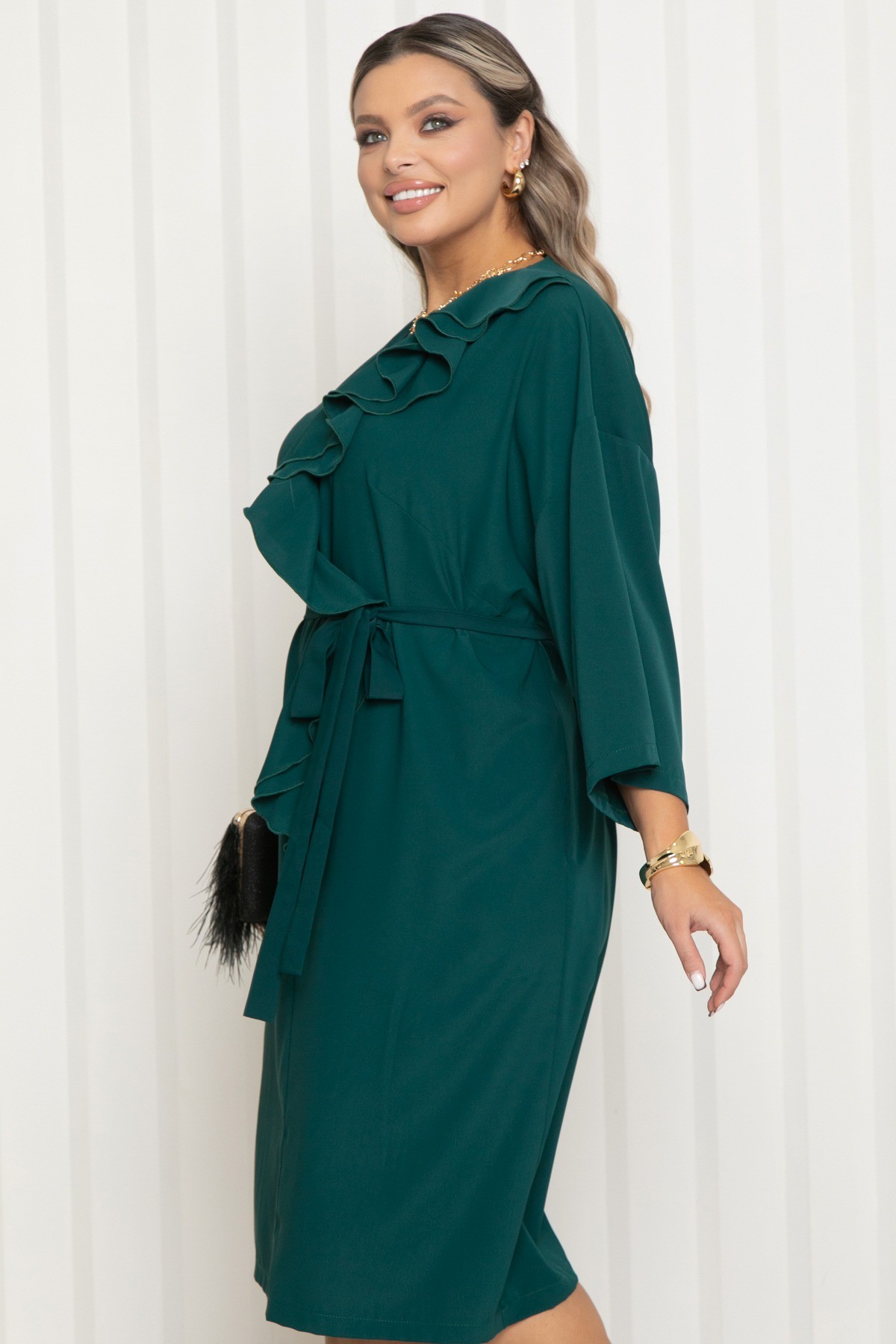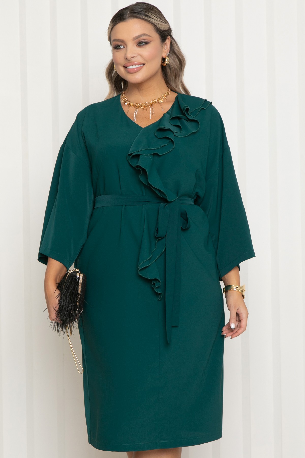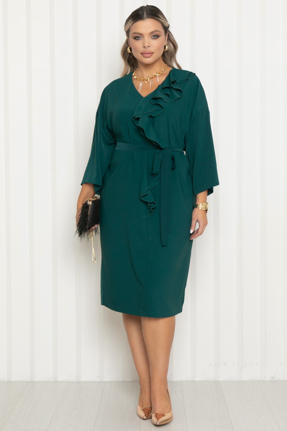 Платье нарядное изумрудного цвета с поясом от бренда Agata. Модель свободного кроя с V-образным вырезом горловины и свободным рукавом длиной 3/4. Модель с мягкой линией плеча и эффектным двойным воланом по переду- визуально вытягивают силуэт и добавляют образу легкость. Платье выполнено из комфортной пткани, приятной к телу и не требующей сложного ухода - плательного шелка. Подходит для офиса, торжеств и повседневного выхода.