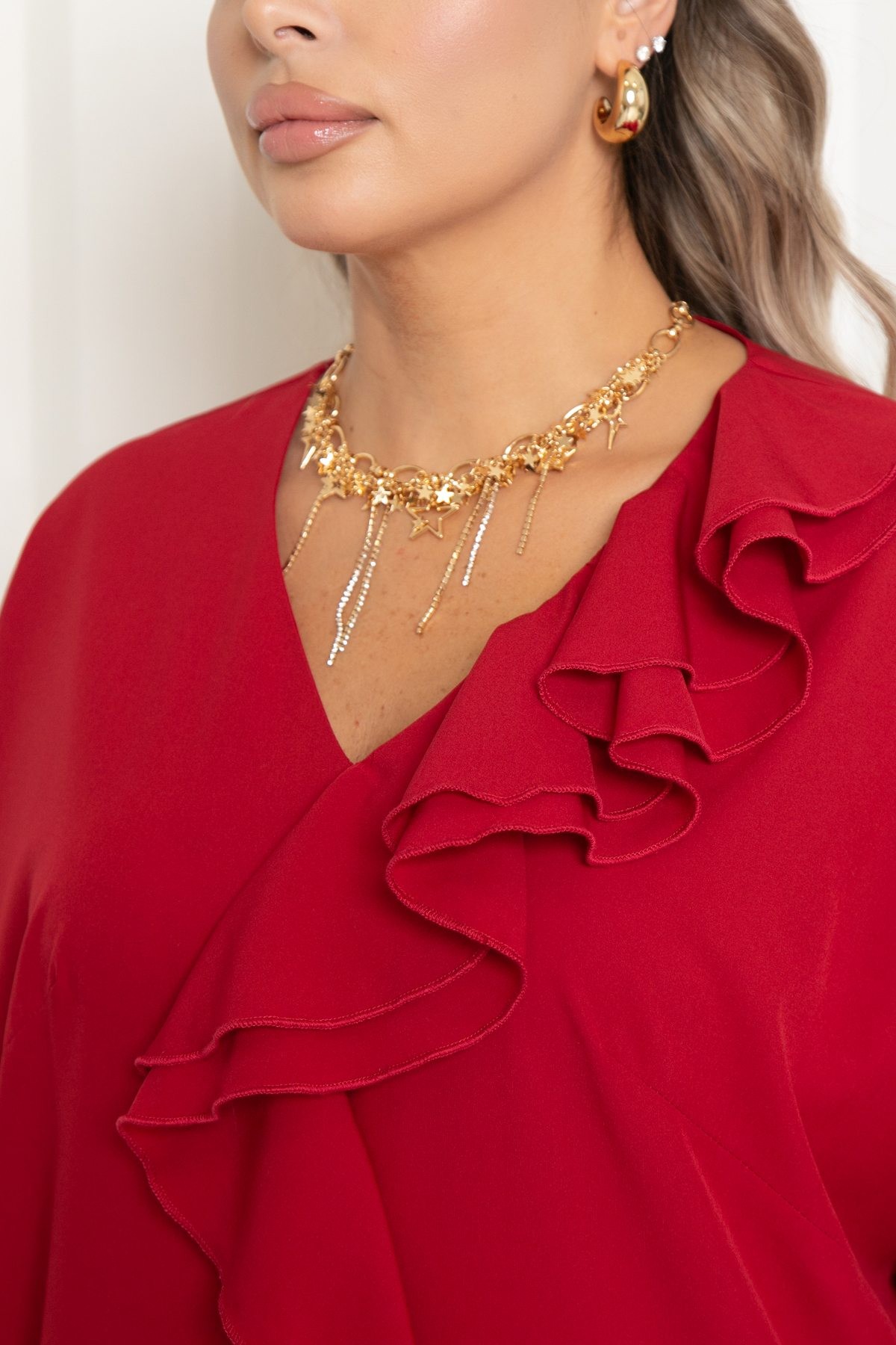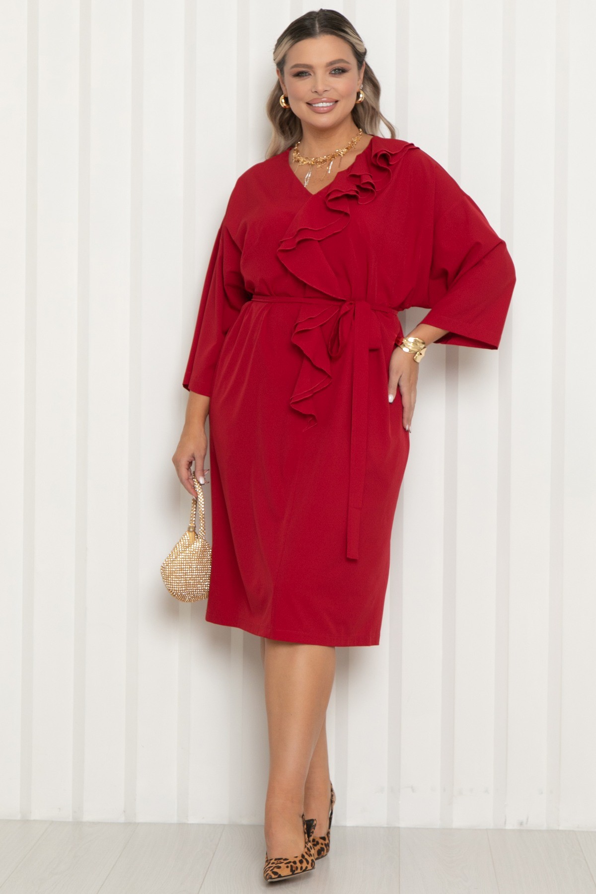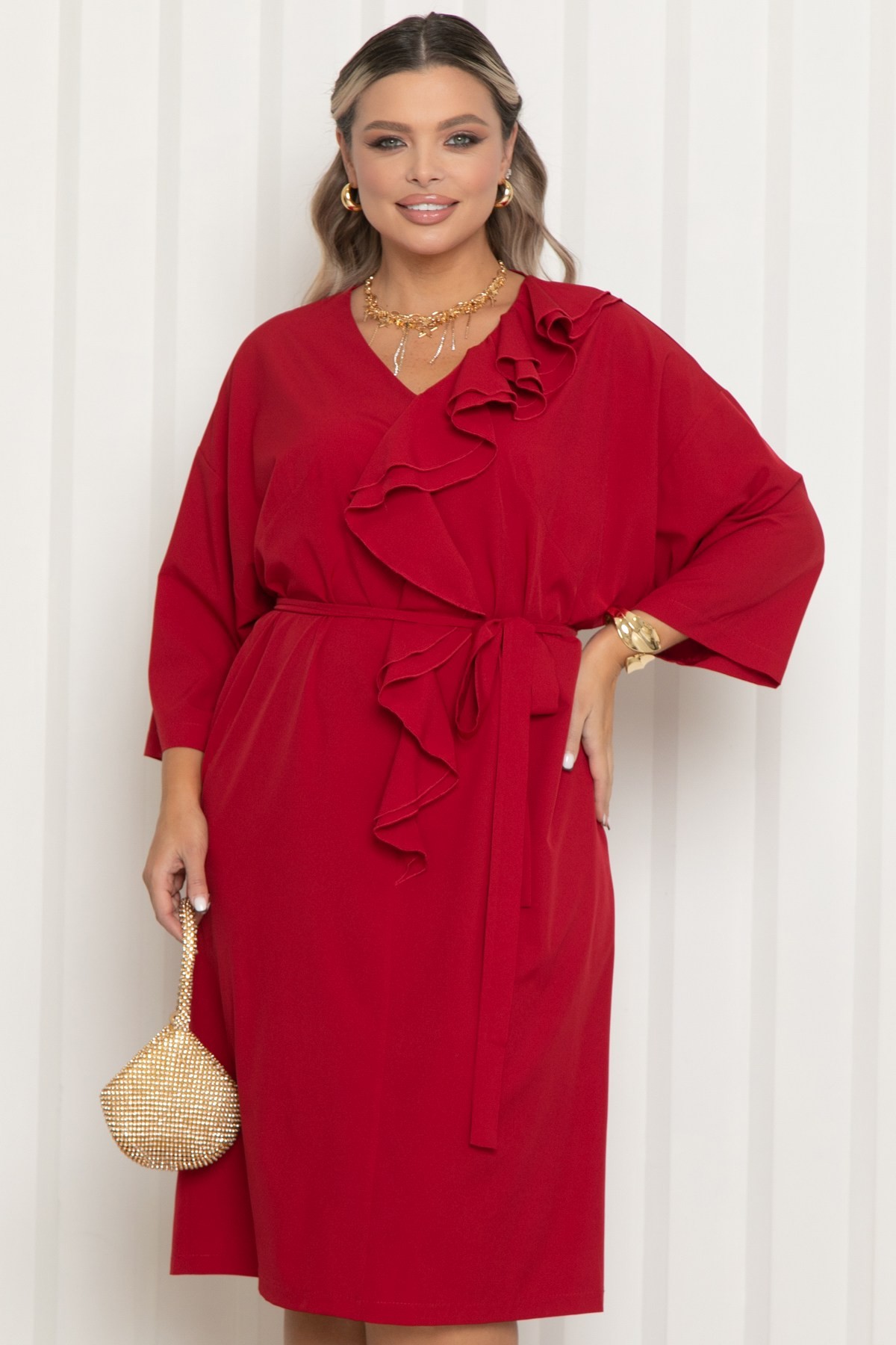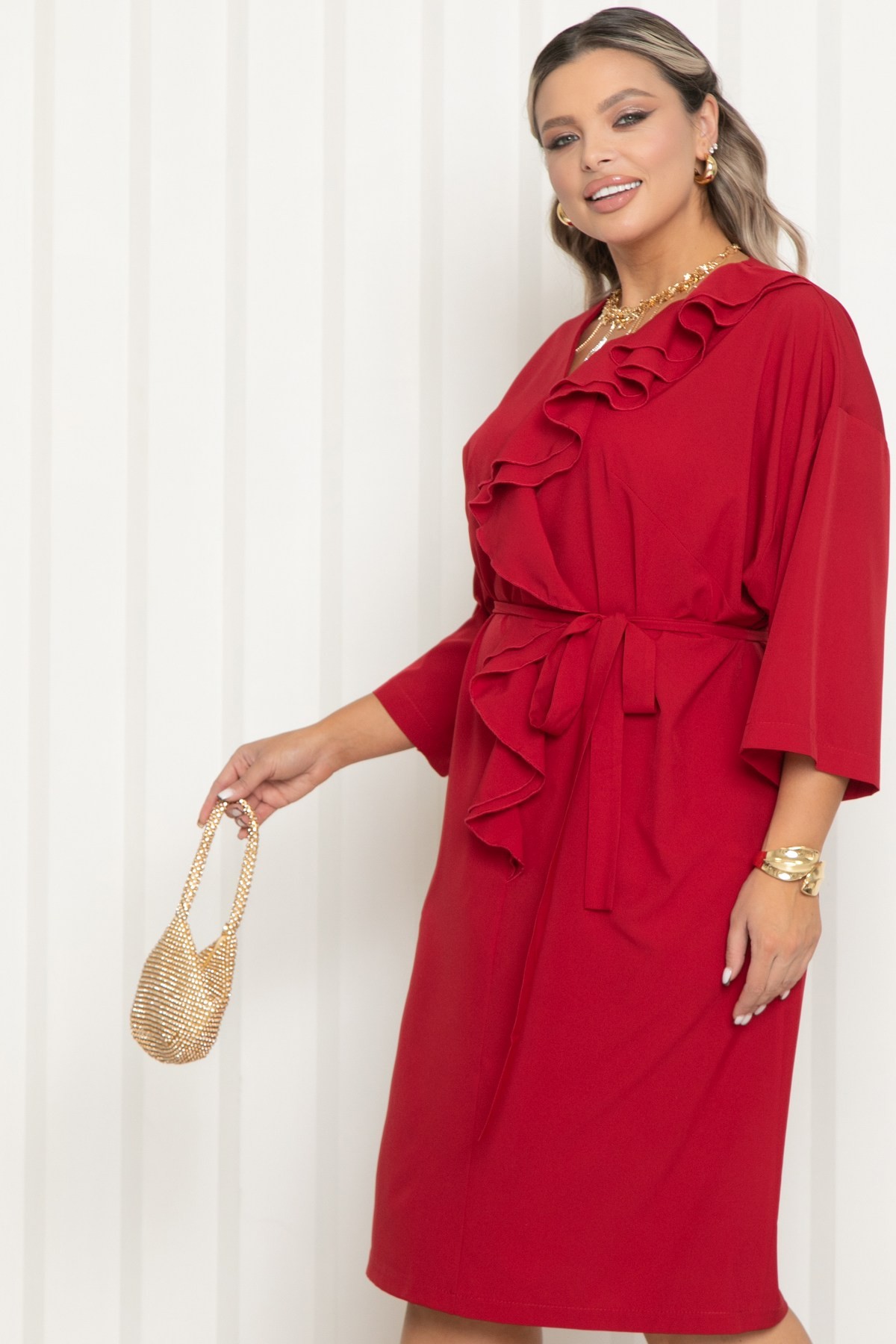Платье нарядное тёмно-красного цвета с поясом от бренда Agata. Модель свободного кроя с V-образным вырезом горловины и свободным рукавом длиной 3/4. Модель с мягкой линией плеча и эффектным двойным воланом по переду- визуально вытягивают силуэт и добавляют образу легкость. Платье выполнено из комфортной пткани, приятной к телу и не требующей сложного ухода - плательного шелка. Подходит для офиса, торжеств и повседневного выхода.