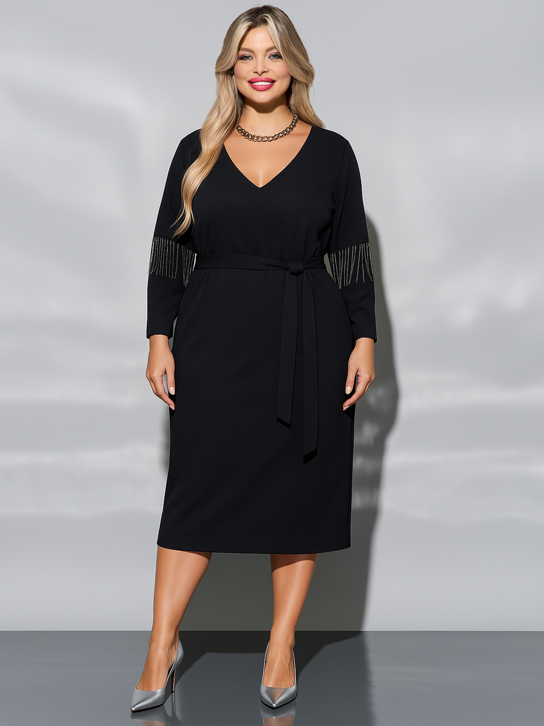Платье-трансформер чёрное с поясом от компании Dora. Модель полуприлегающего силуэта, выполнена из трикотажного полотна "Скуба". Можно носить с округлым вырезом горловины, а так же с V-образным вырезом горловины. Втачные рукава 7/8 "летучая мышь" с метализированной бахрамой. Низ прямой без разрезов. Прекрасный вариант для создания женственного образа.
