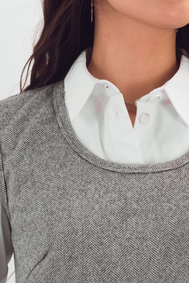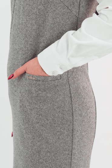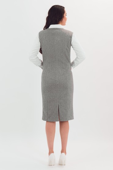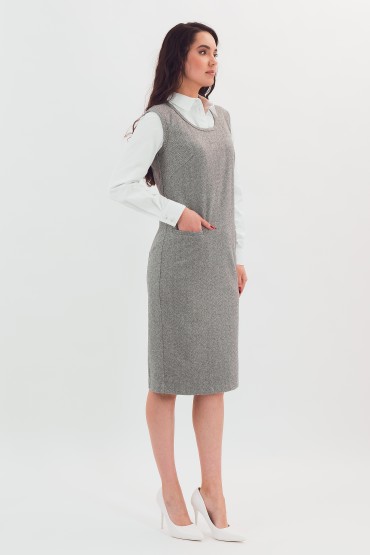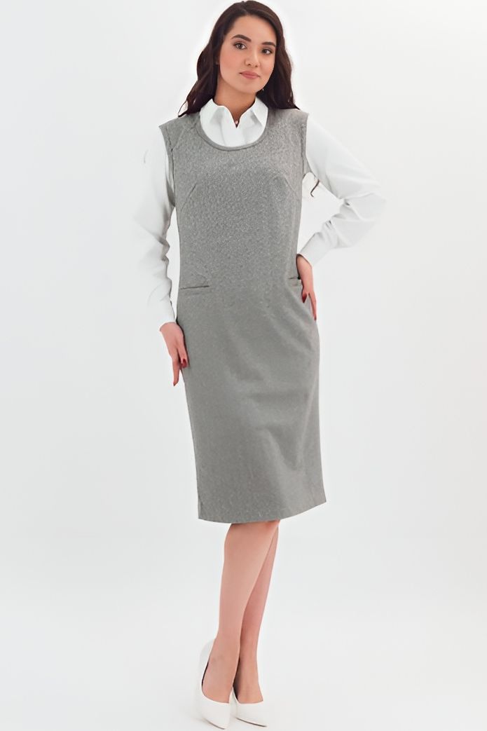 Сарафан трикотажный серый с карманами от бренда Braslava. Модель полуприлегающего силуэта, круглый вырез горловины. Такая модель сарафана стильно смотрится с классическими блузами, водолазками и рубашками.