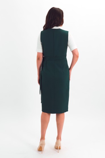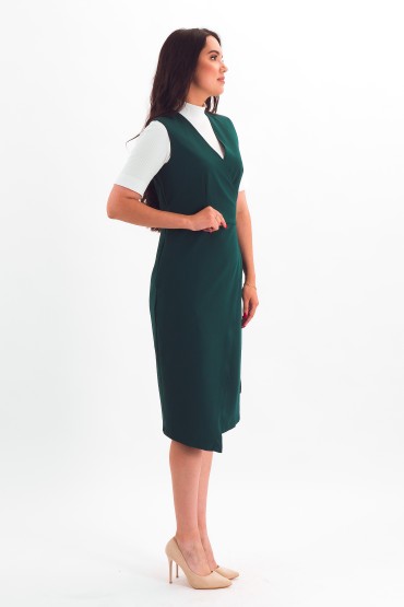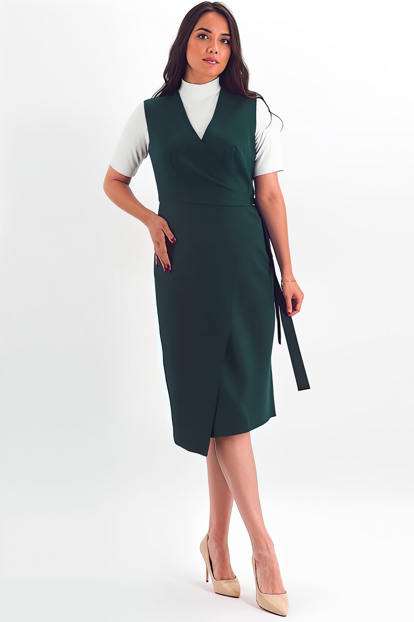 Сарафан тёмно-зелёный с запахом от бренда Braslava. Модель полуприлегающего силуэта, выполнена из костюмной ткани. Карманы в боковых швах позволят держать необходимые мелочи под рукой. Завязывающийся пояс даёт возможность регулировать ширину по талии.. Стильный вариант для делового образа.