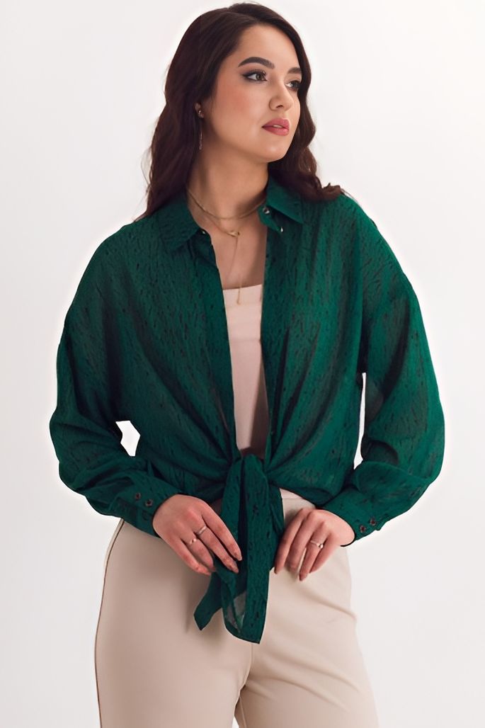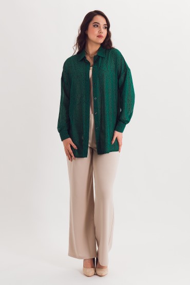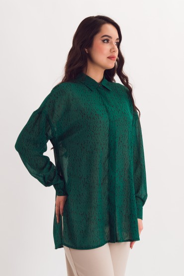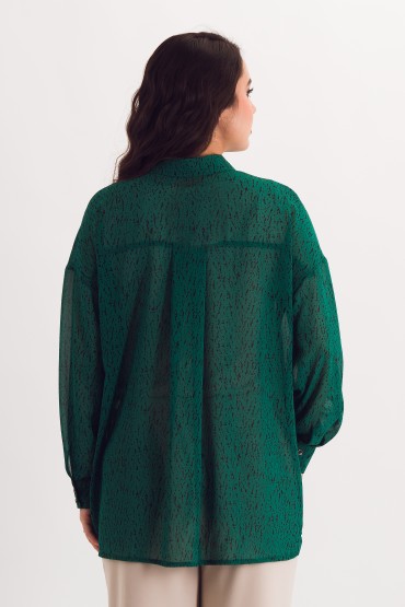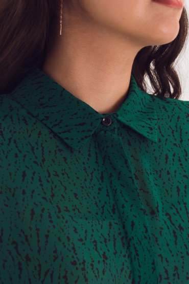 Рубашка шифоновая зелёная с принтом от бренда Braslava. Модель оверсайз со спущенным плечом и супатной застежкой невероятно удобна и впишется в любой образ! Длинный и широкий рукав со складками и манжетами на пуговицах позволяет регулировать объем, также его можно закатать, что придаст рубашке менее формальный вид. Складка по спинке от кокетки гарантирует комфорт движений. Стильный вариант для повседневной носки.