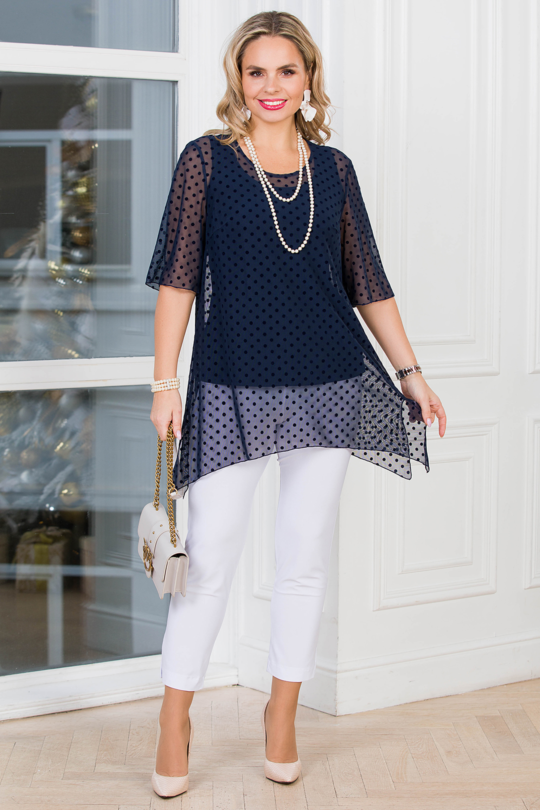 Туника синяя в горошек от торговой марки Lavira. Модель свободного силуэта, состоит из двух элементов сшитых вместе: внутренний топ выполнен из комфортного, приятного к телу стрейч-шёлка масла, а верхняя накидка из воздушного, лёгкого и летящего шифона. Круглый вырез горловины. Втачные короткие рукава. Низ асимметричный. Идеальный выбор для Вашего стильного гардероба.