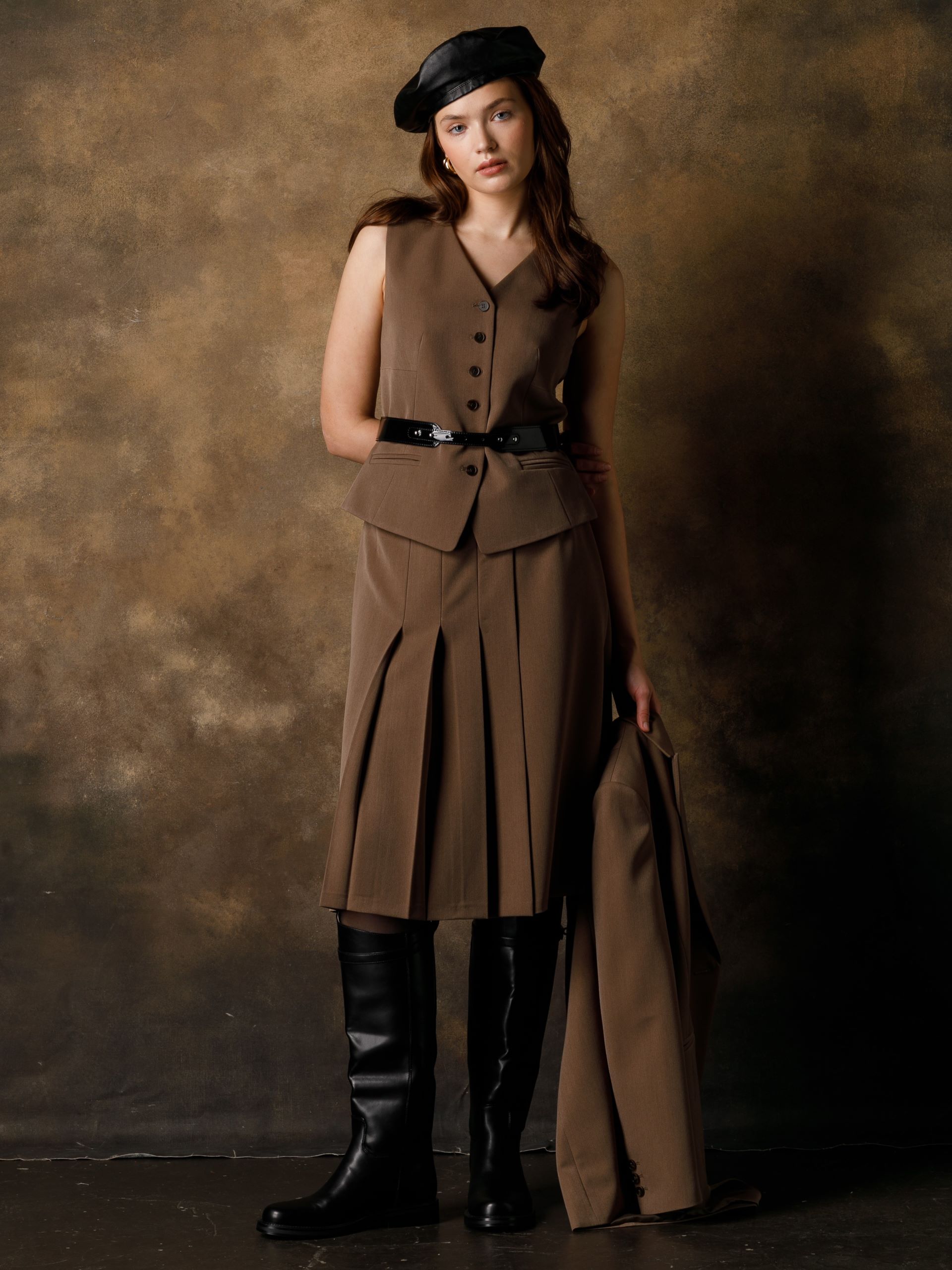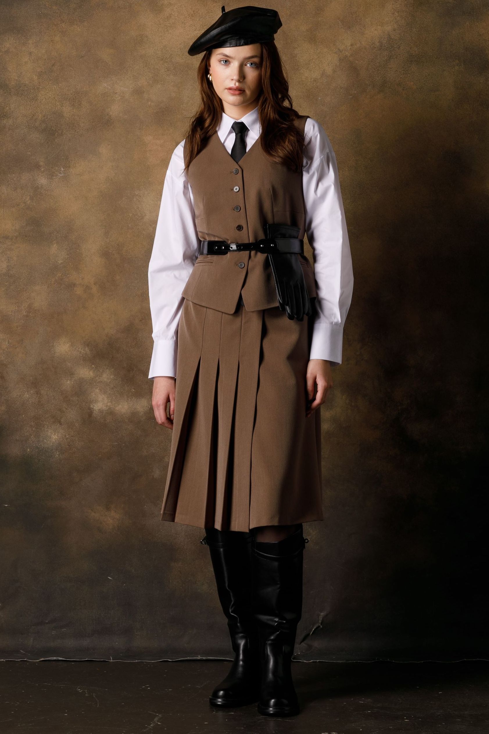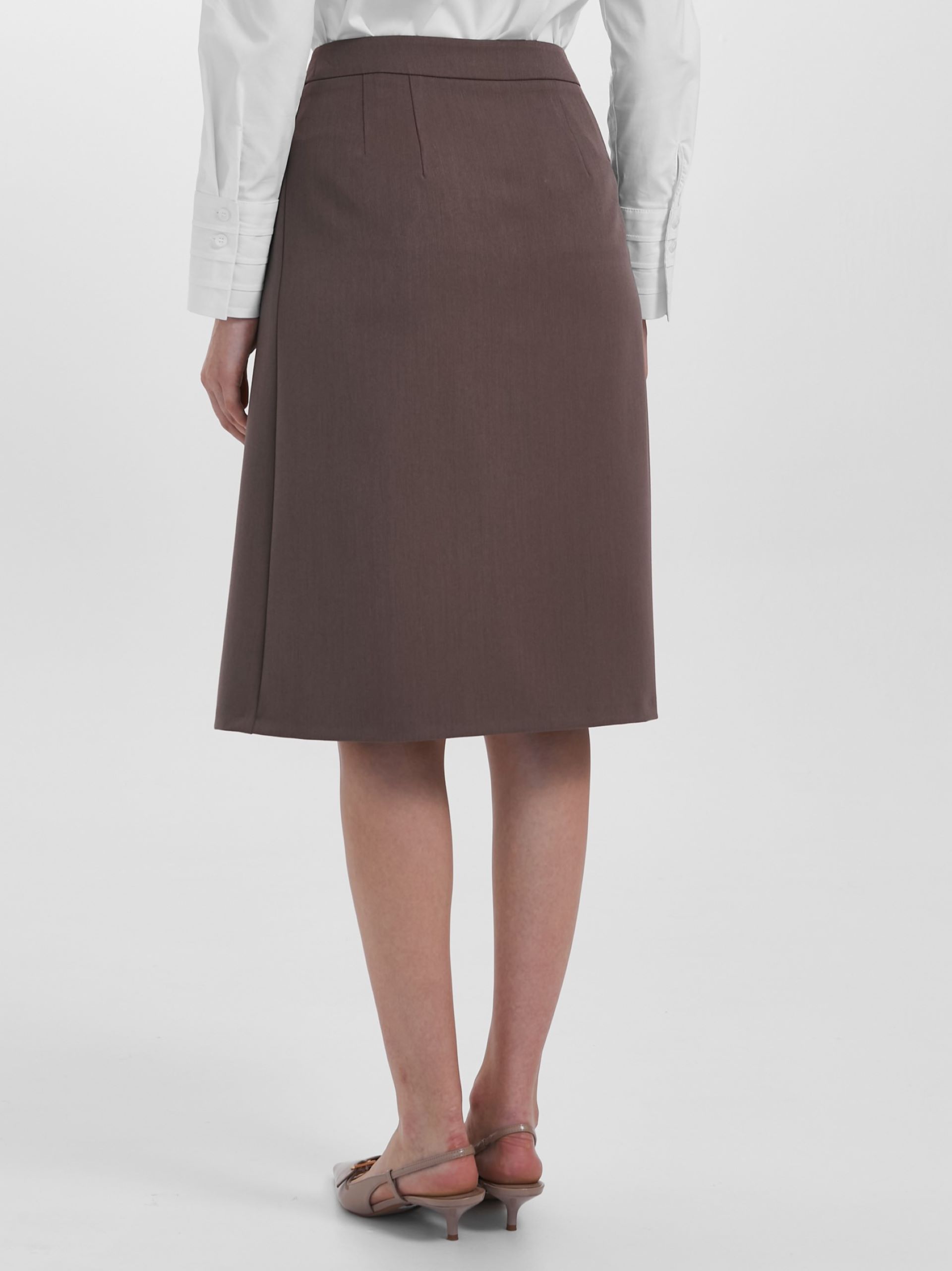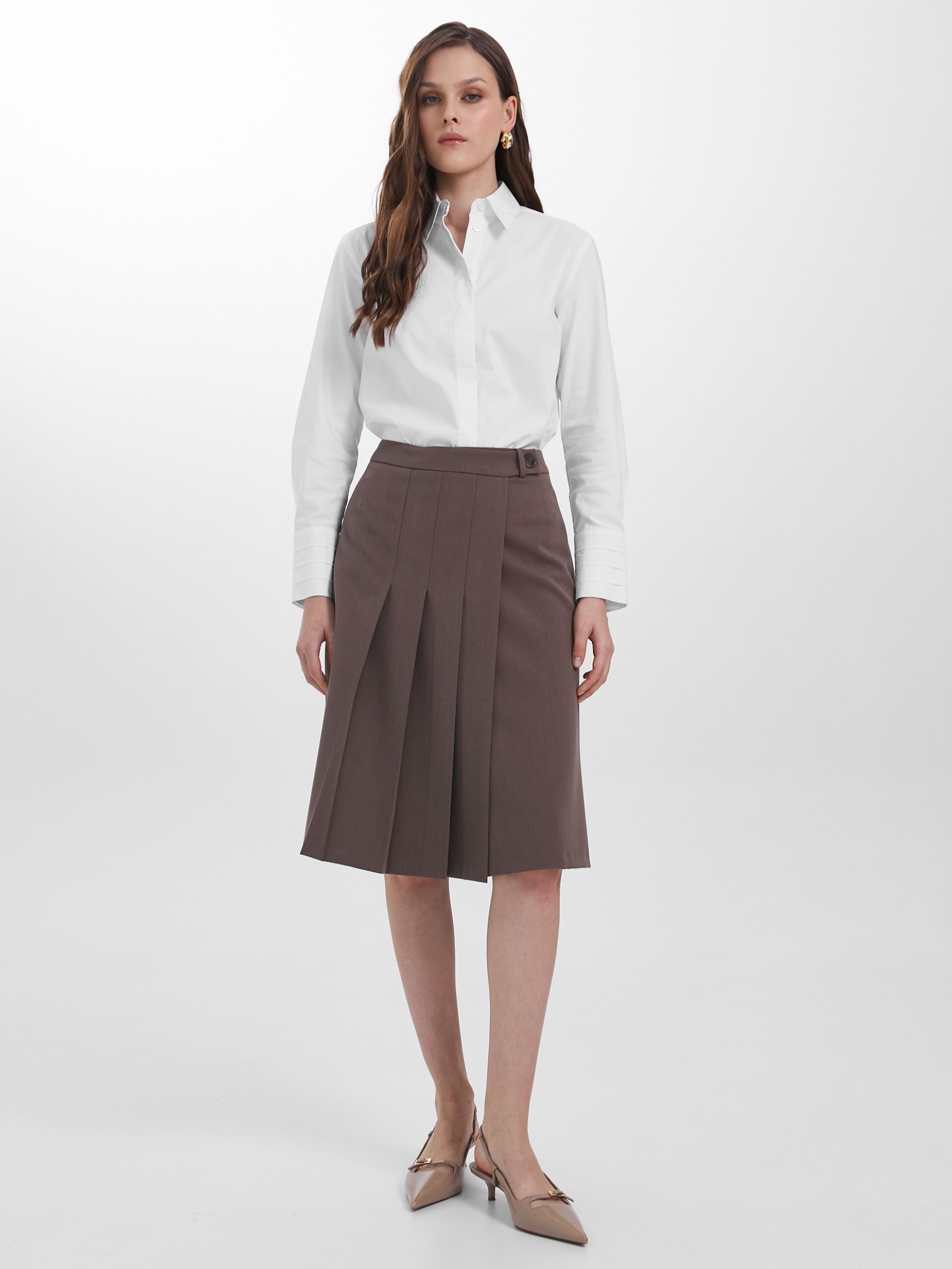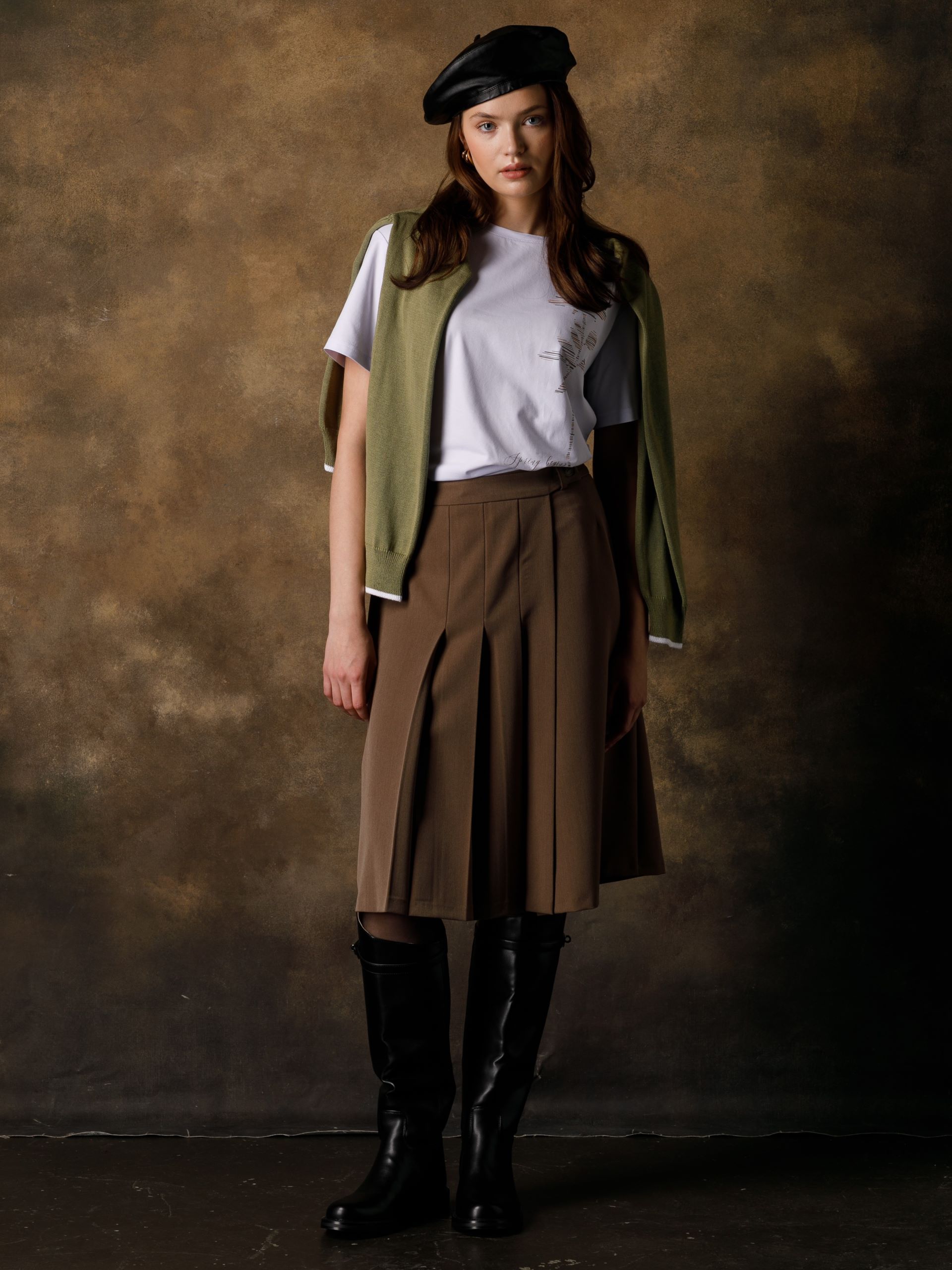 Юбка миди с запахом в оливковом цвете от фабрики Priz. Модель А-образного силуэта, без подклада, на подкройном поясе. На поясе шлёвка и застёжка на петли и пуговицы. Спереди частично застрочены односторонние складки. Комфорт и стиль на каждый день.