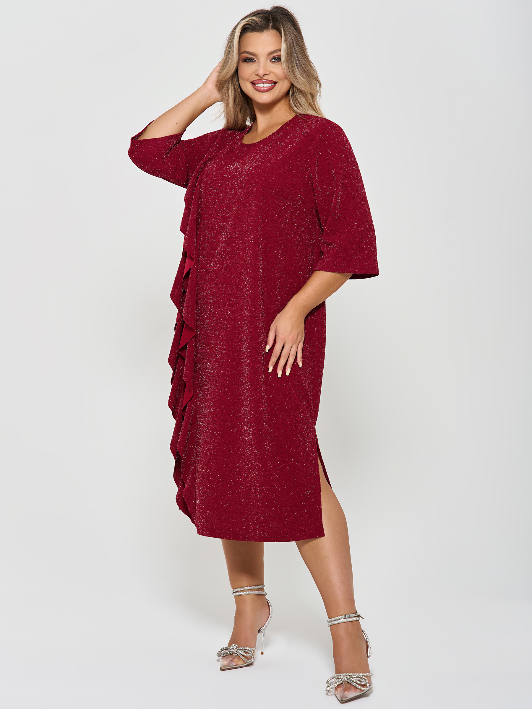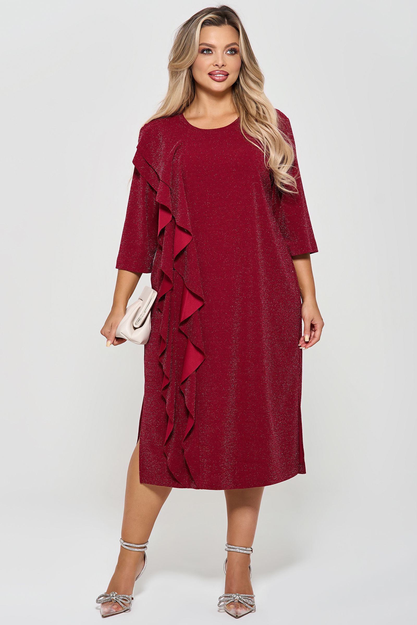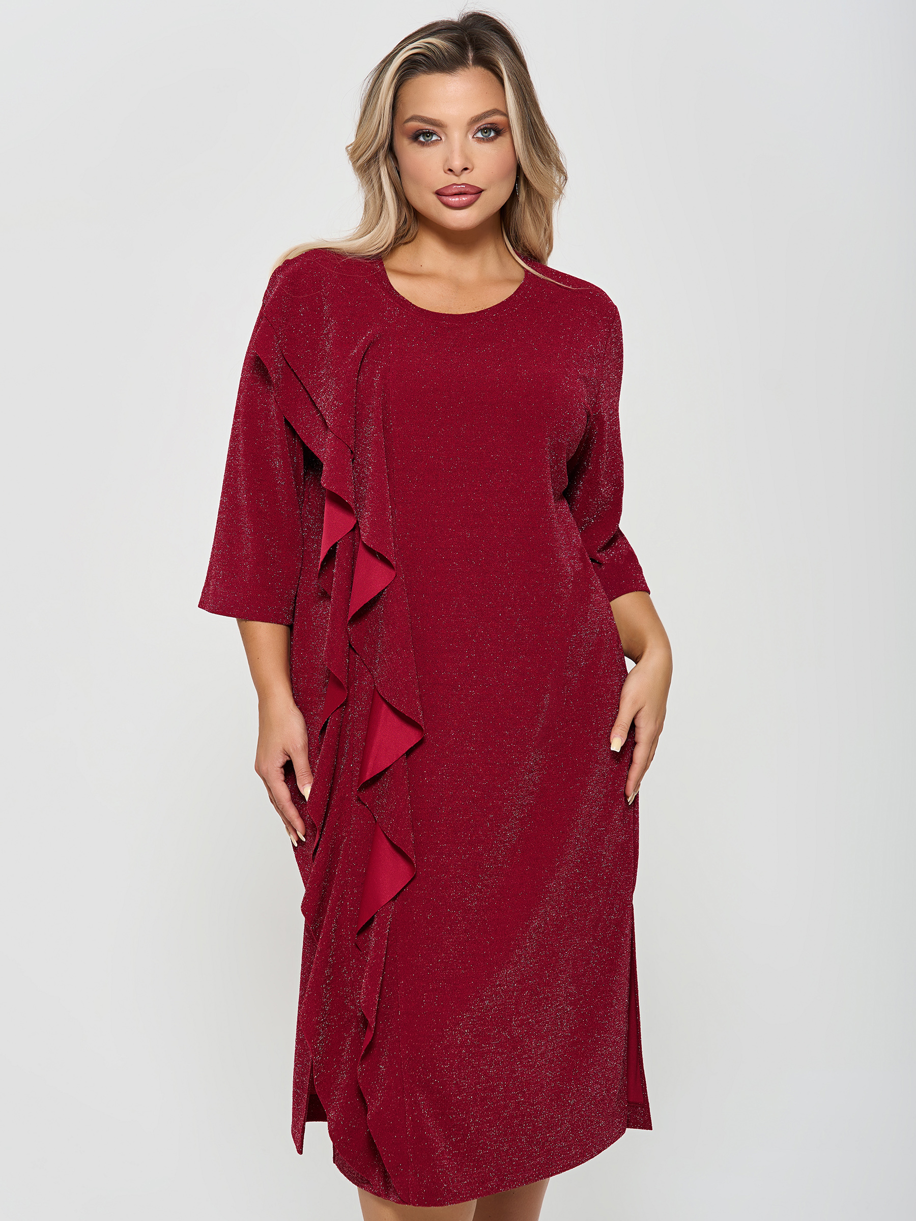 Платье вечернее с воланами от компании Dora. Модель полуприлегающего силуэта, выполнена из трикотажа "Скуба" с люрексом в ягодном цвете. Округлый вырез горловины. Втачные рукава 3/4. Низ ровный, сбоку элегантный разрез. Идеальный вариант для создания элегантного образа.