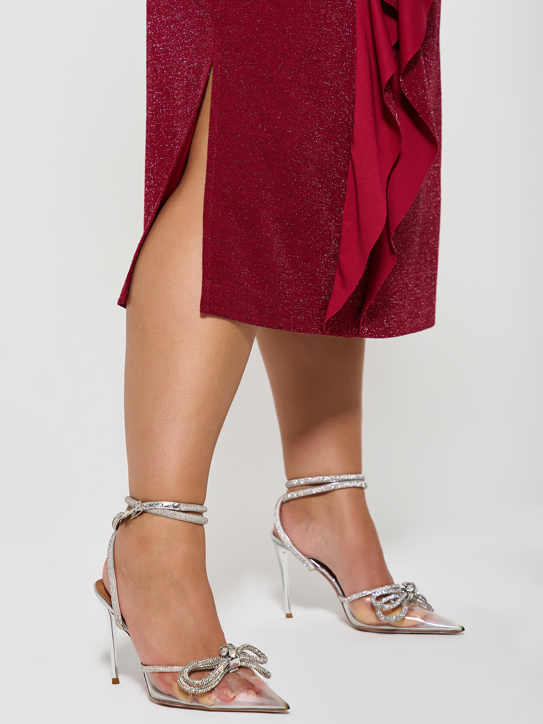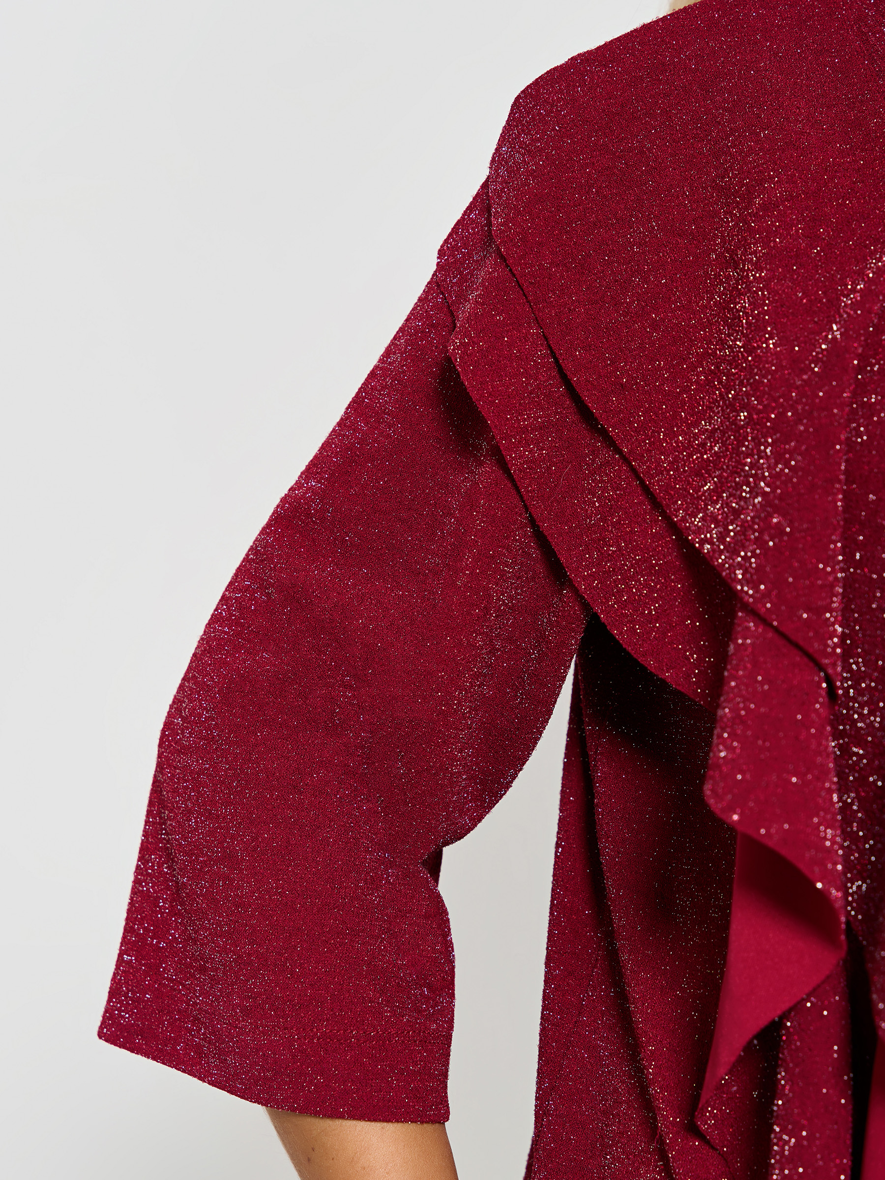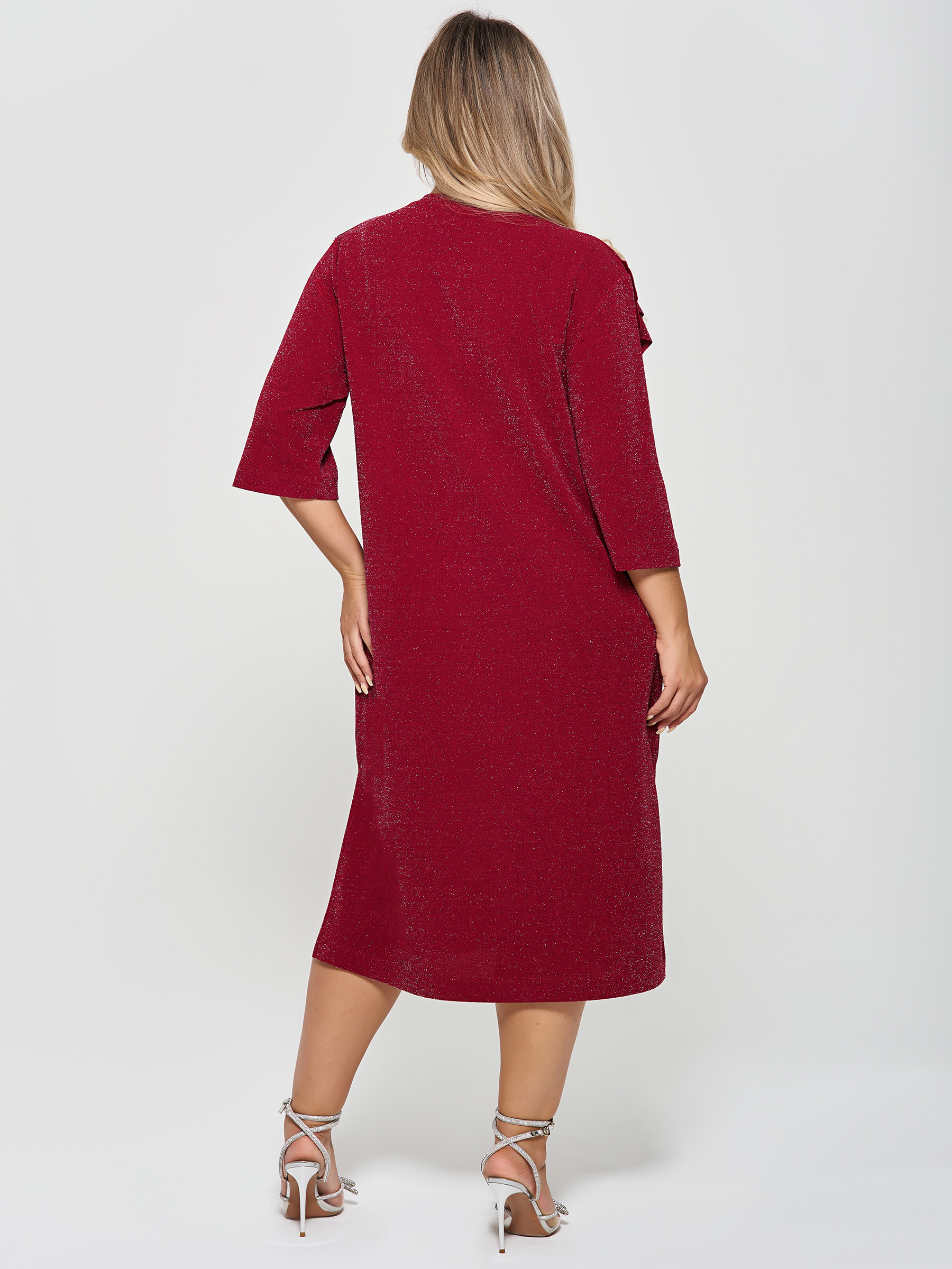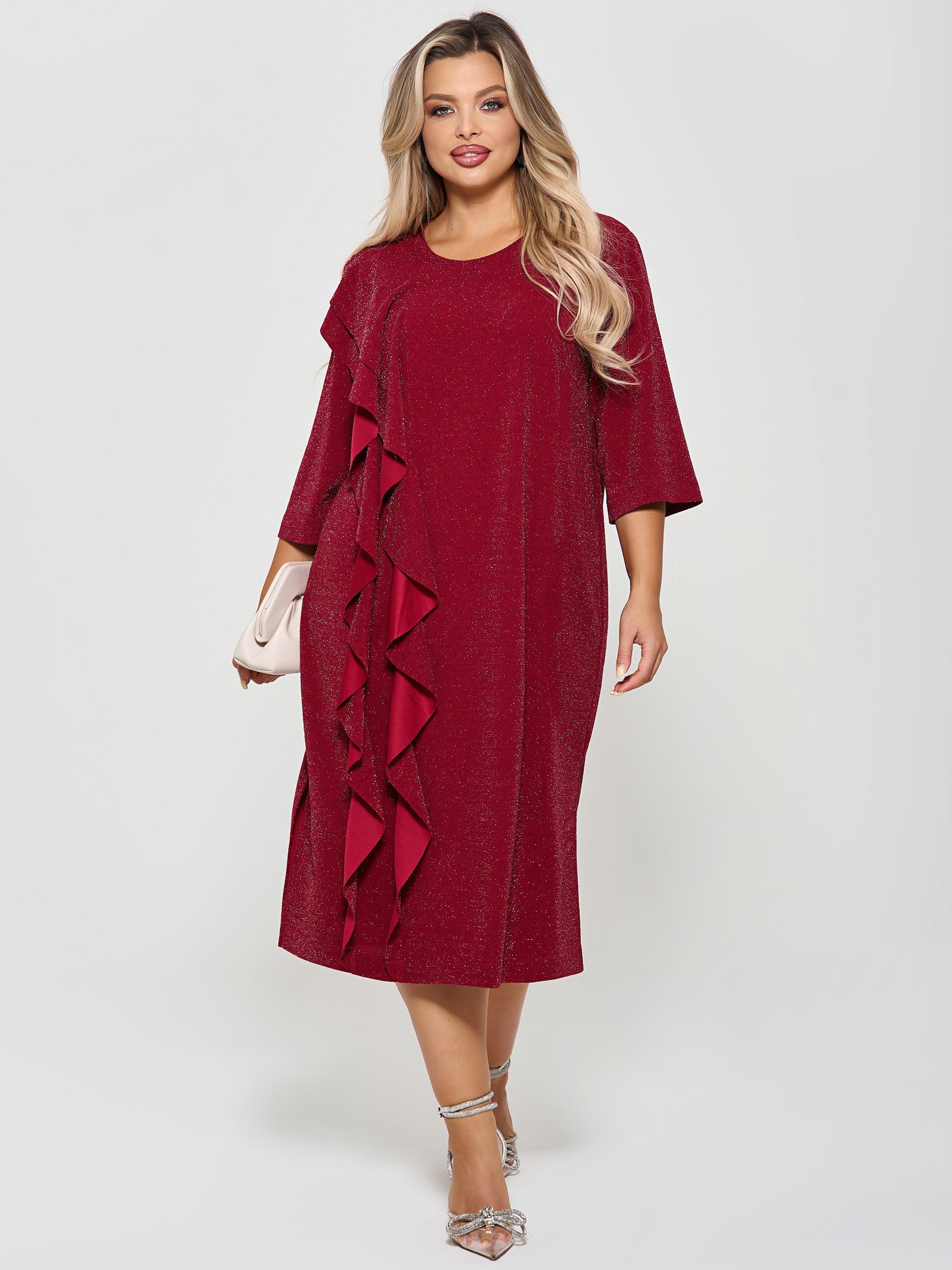 Платье вечернее с воланами от компании Dora. Модель полуприлегающего силуэта, выполнена из трикотажа "Скуба" с люрексом в ягодном цвете. Округлый вырез горловины. Втачные рукава 3/4. Низ ровный, сбоку элегантный разрез. Идеальный вариант для создания элегантного образа.