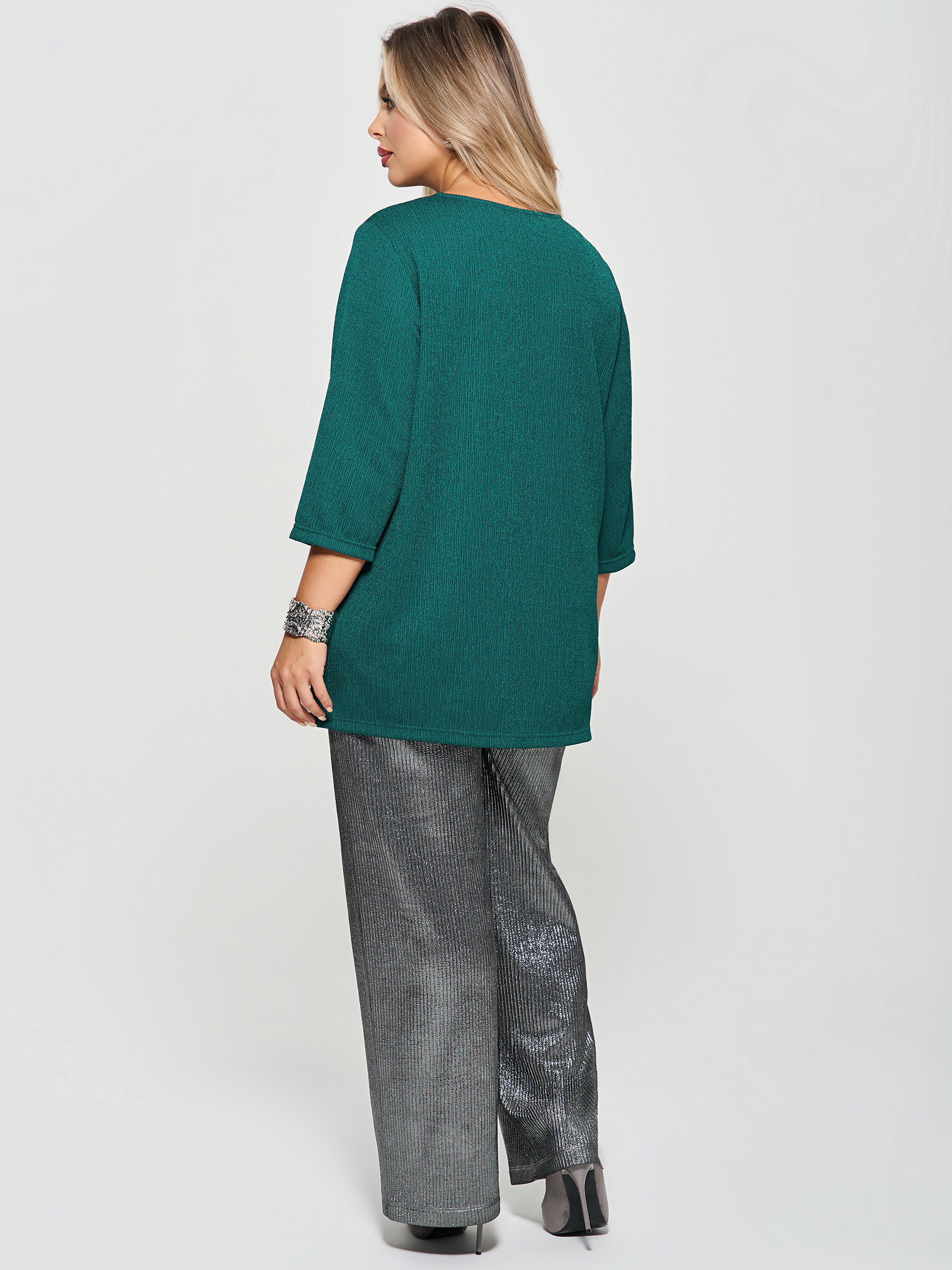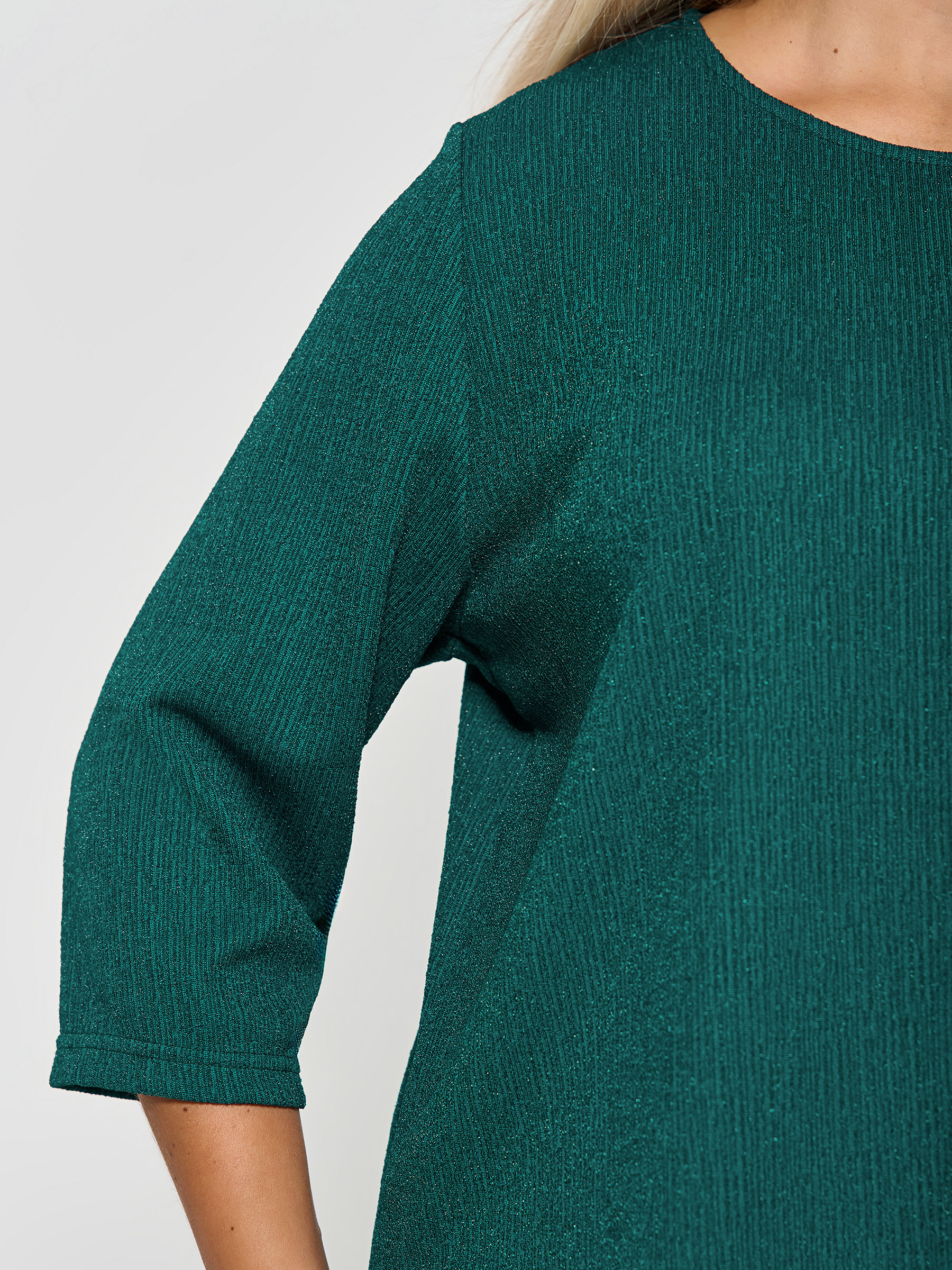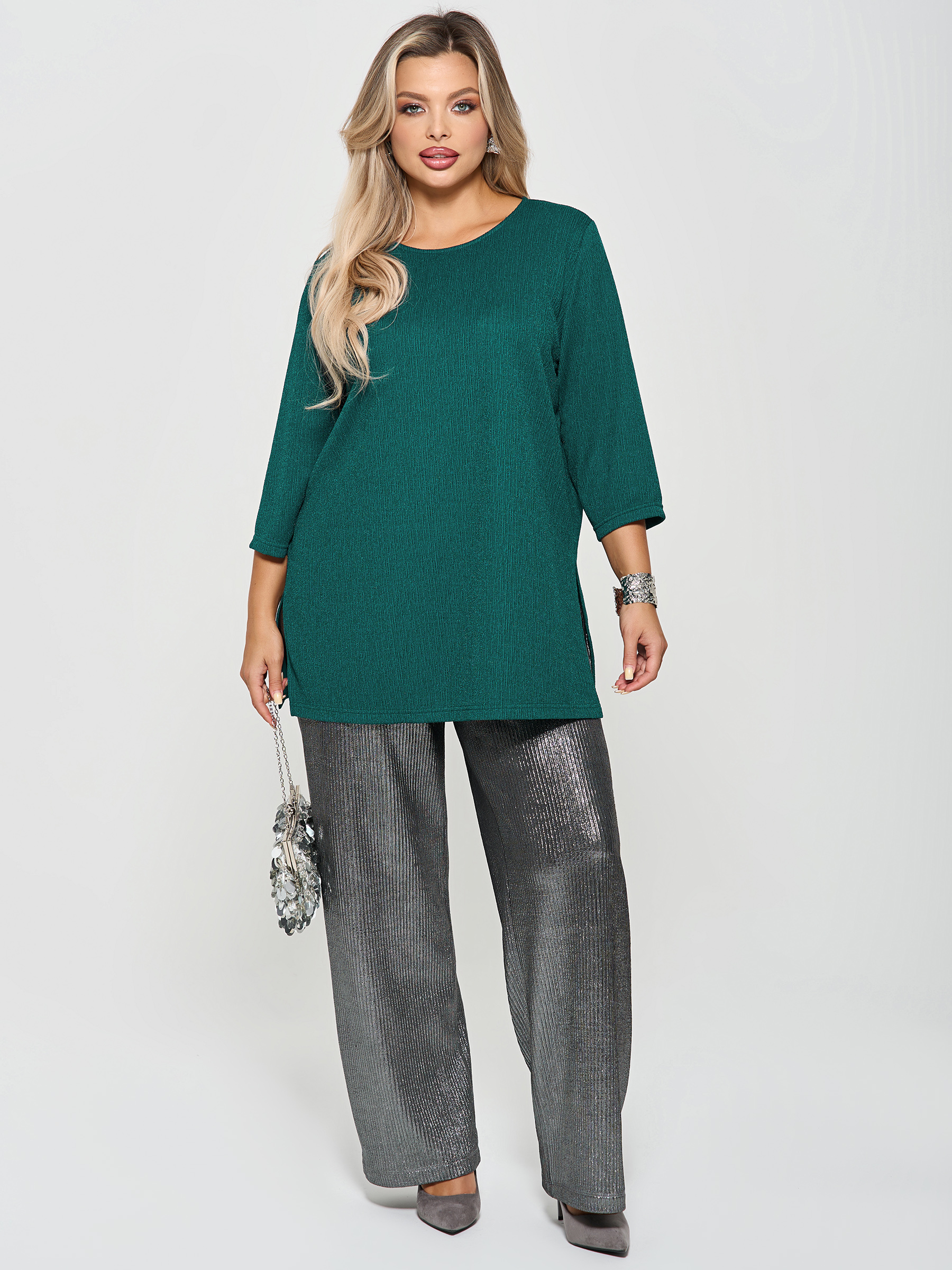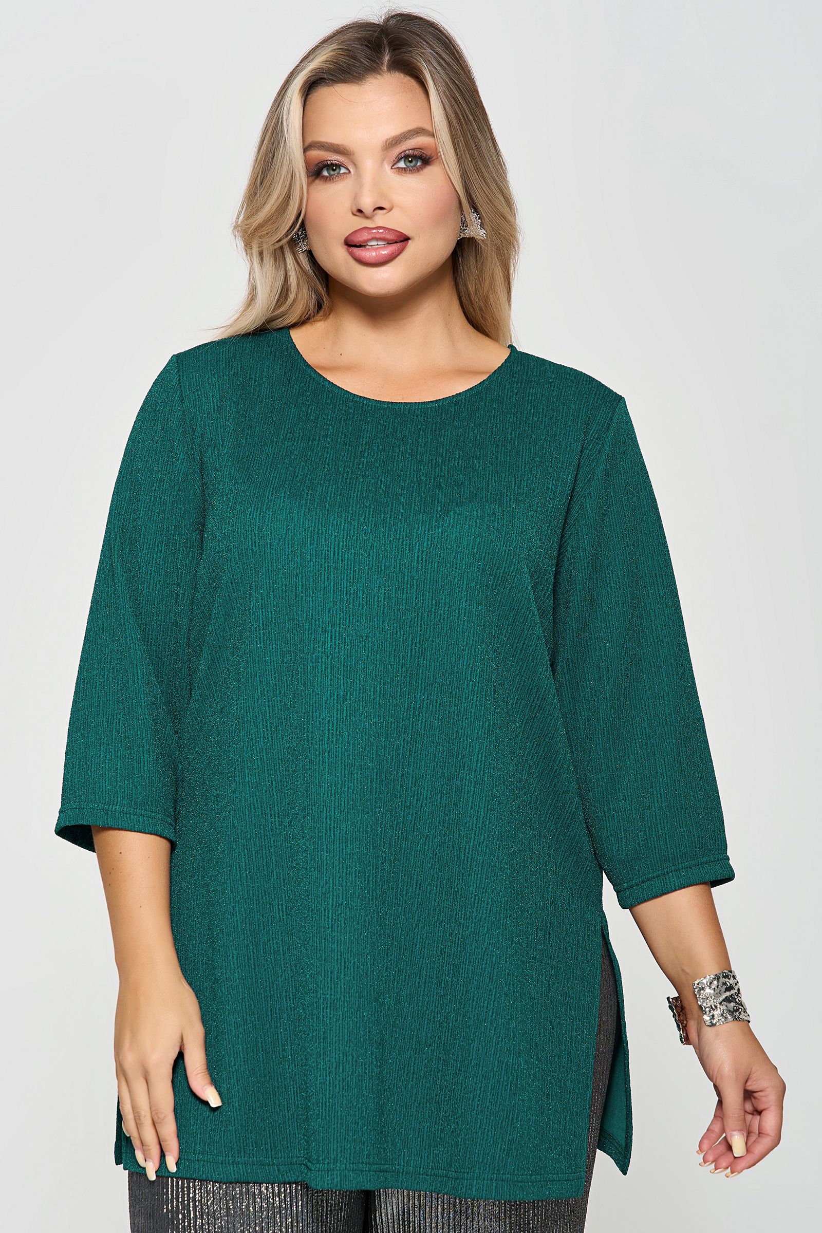 Туника нарядная трикотажная с блеском зелёного цвета от компании Dora. Модель свободного силуэта, круглый вырез горловины. По бокам небольшие разрезы. Втачные укороченные рукава. Идеальное решение для Вашего стильного гардероба.