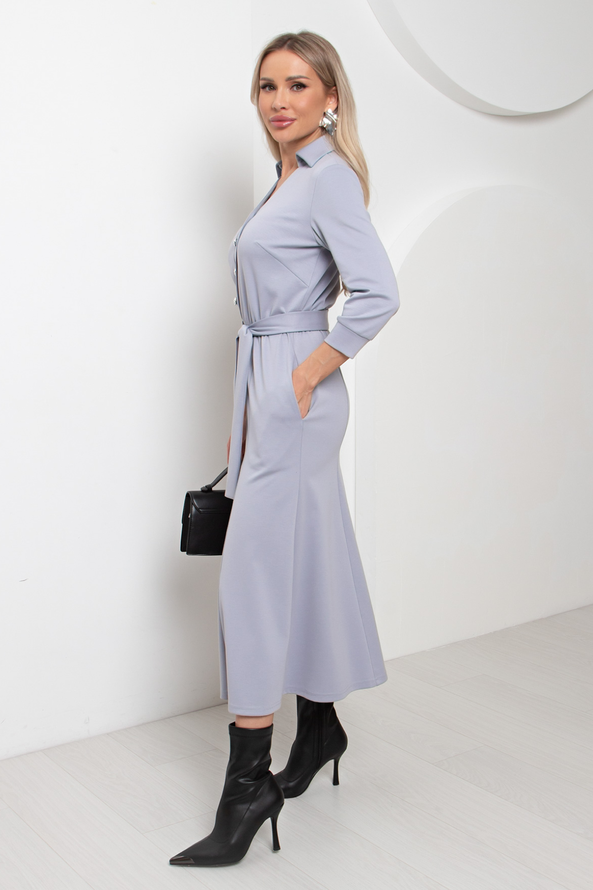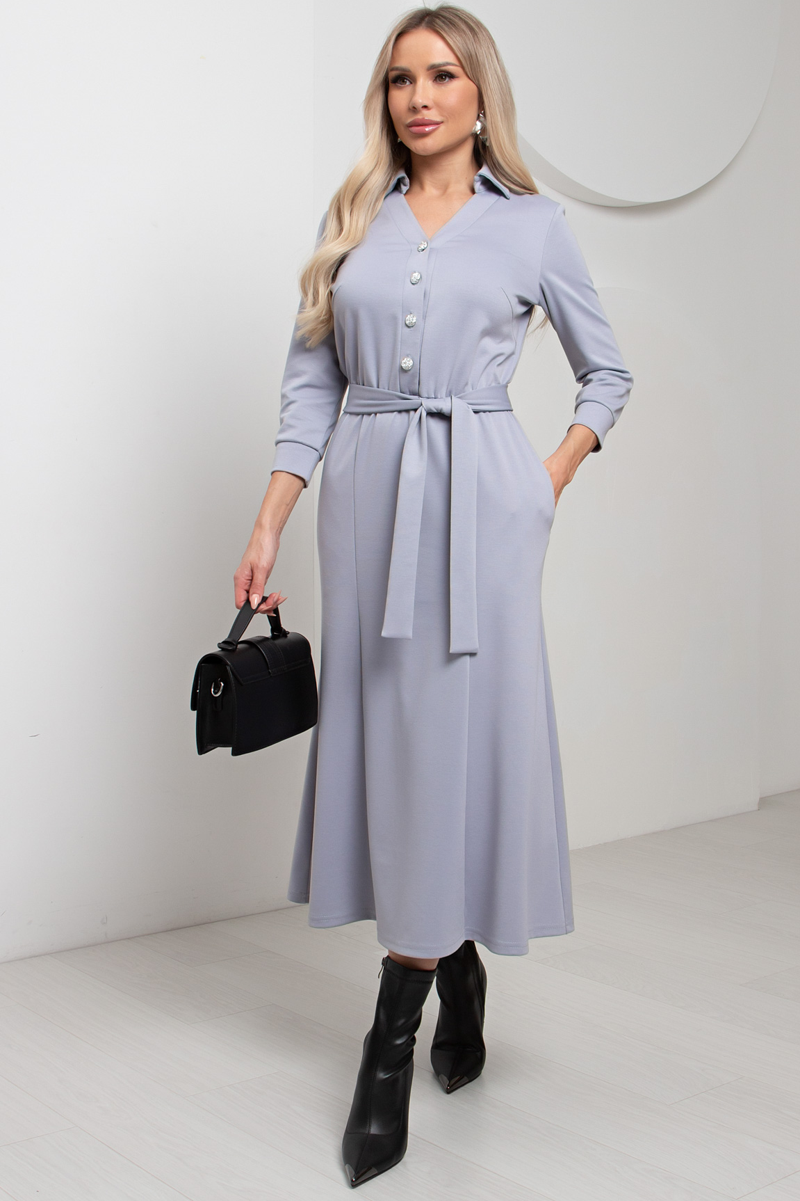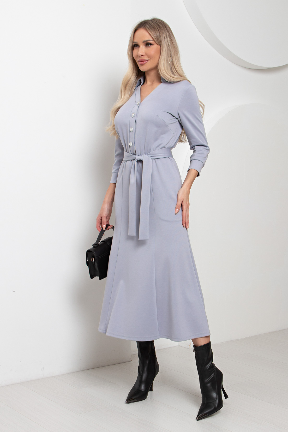Платье трикотажное серо-голубое с поясом от компании Valentina. Модель прилегающего силуэта, V-образная горловина оформлена отложным воротником на стойке. По переду планка с застежкой на петли и пуговицы. Втачной рукав длиной ¾ оформлен притачной манжетой. Юбка состоит из шести клиньев. Модель отрезная по линии талии, присборена на резинку. Платье отлично подойдет для похода в кафе. Рекомендуемая стирка при t не более 30°.